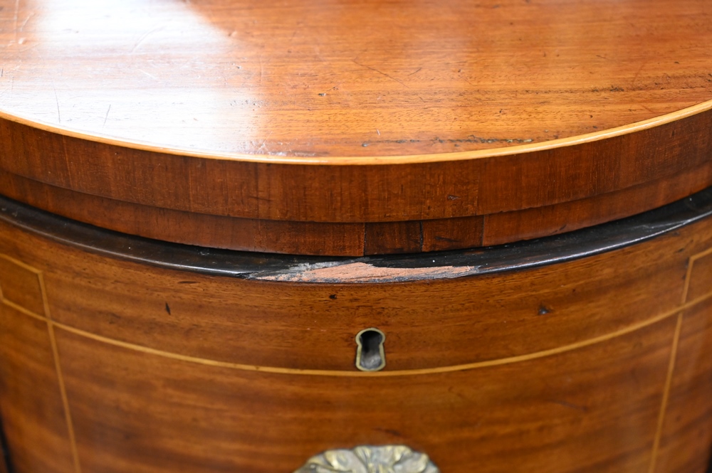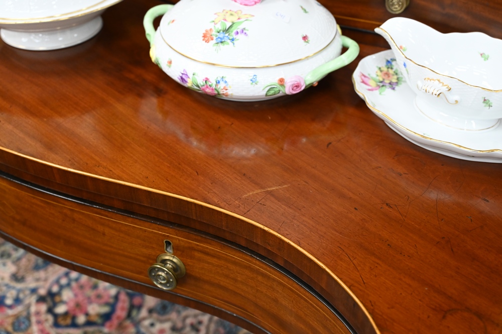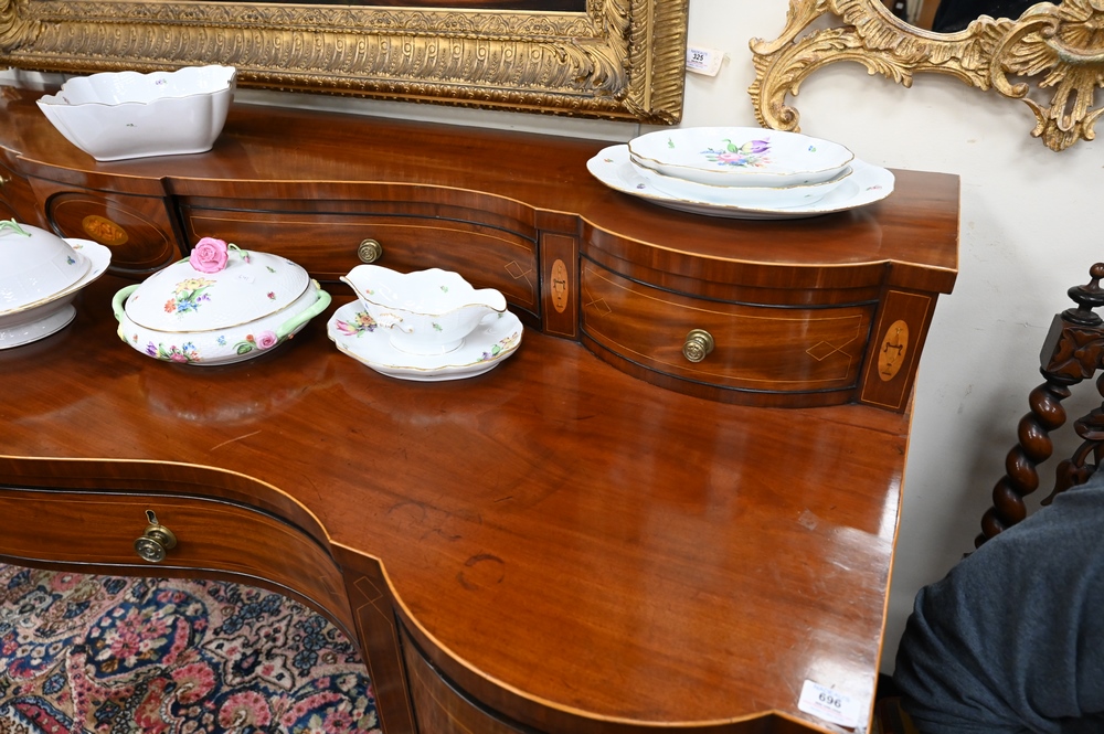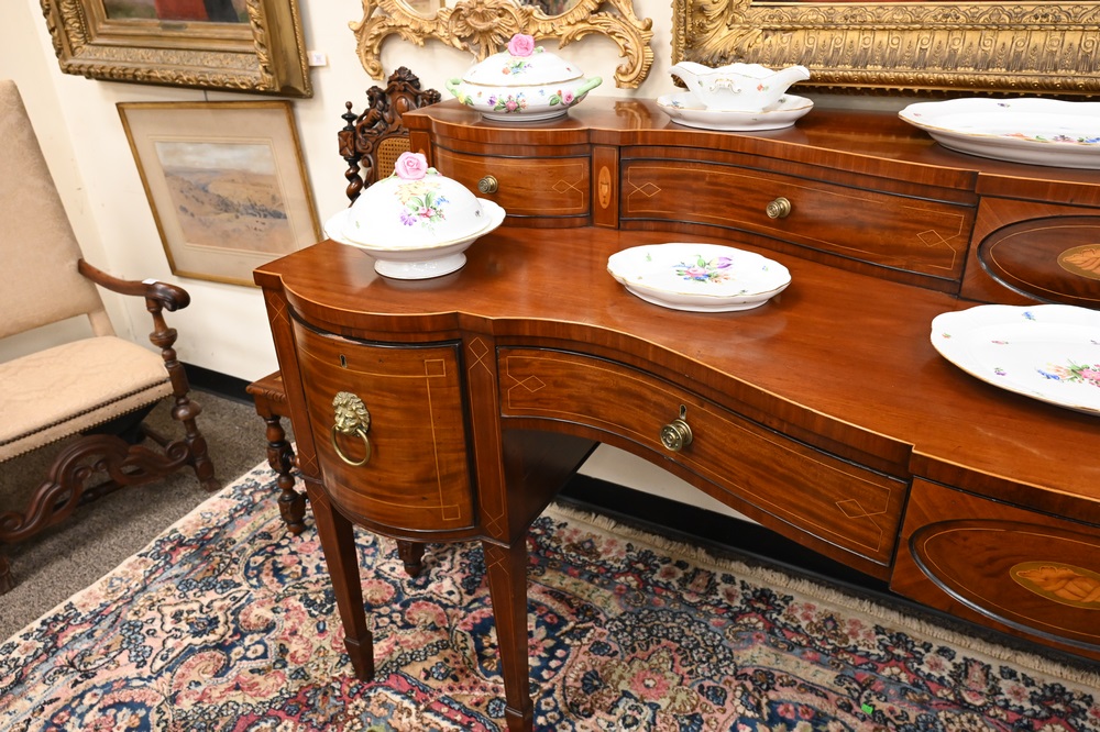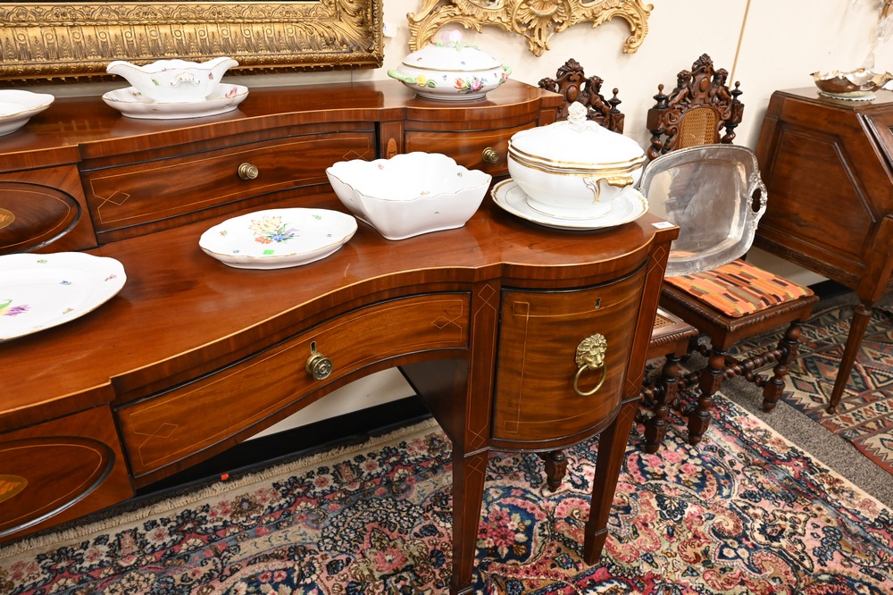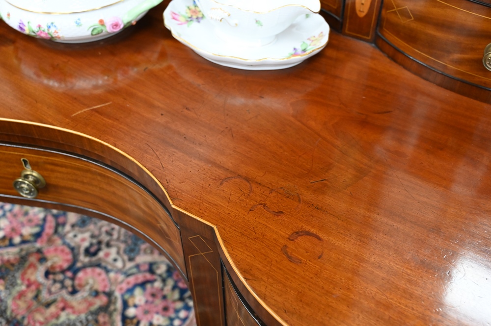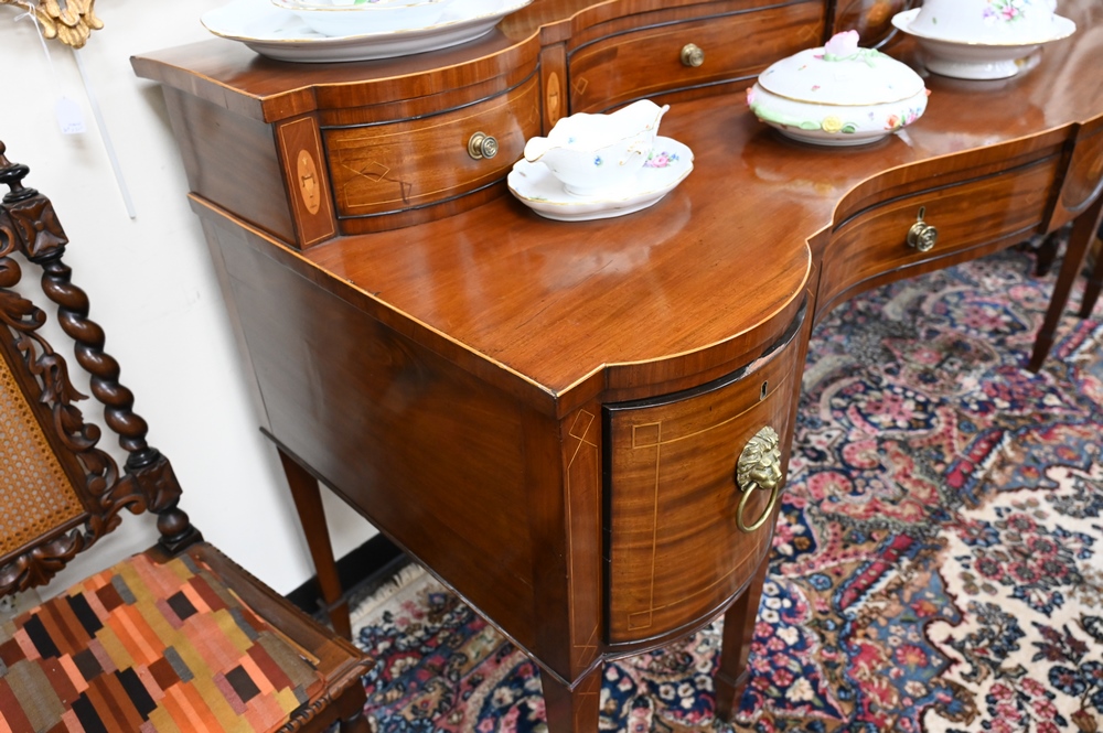 Lot 696: Irish Mahogany Sideboard, having top section with sliding doors on serpentine front case with two drawers and two bottle drawers on …