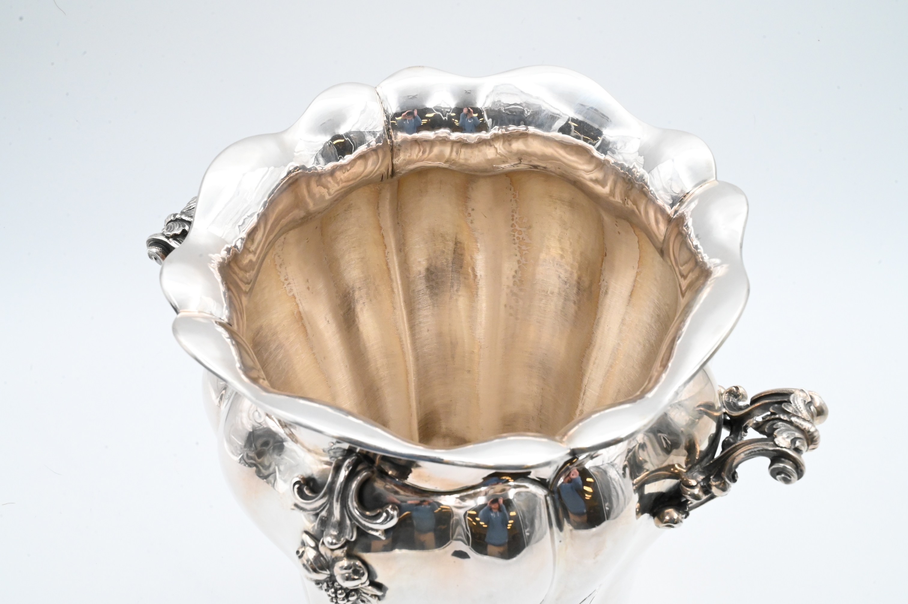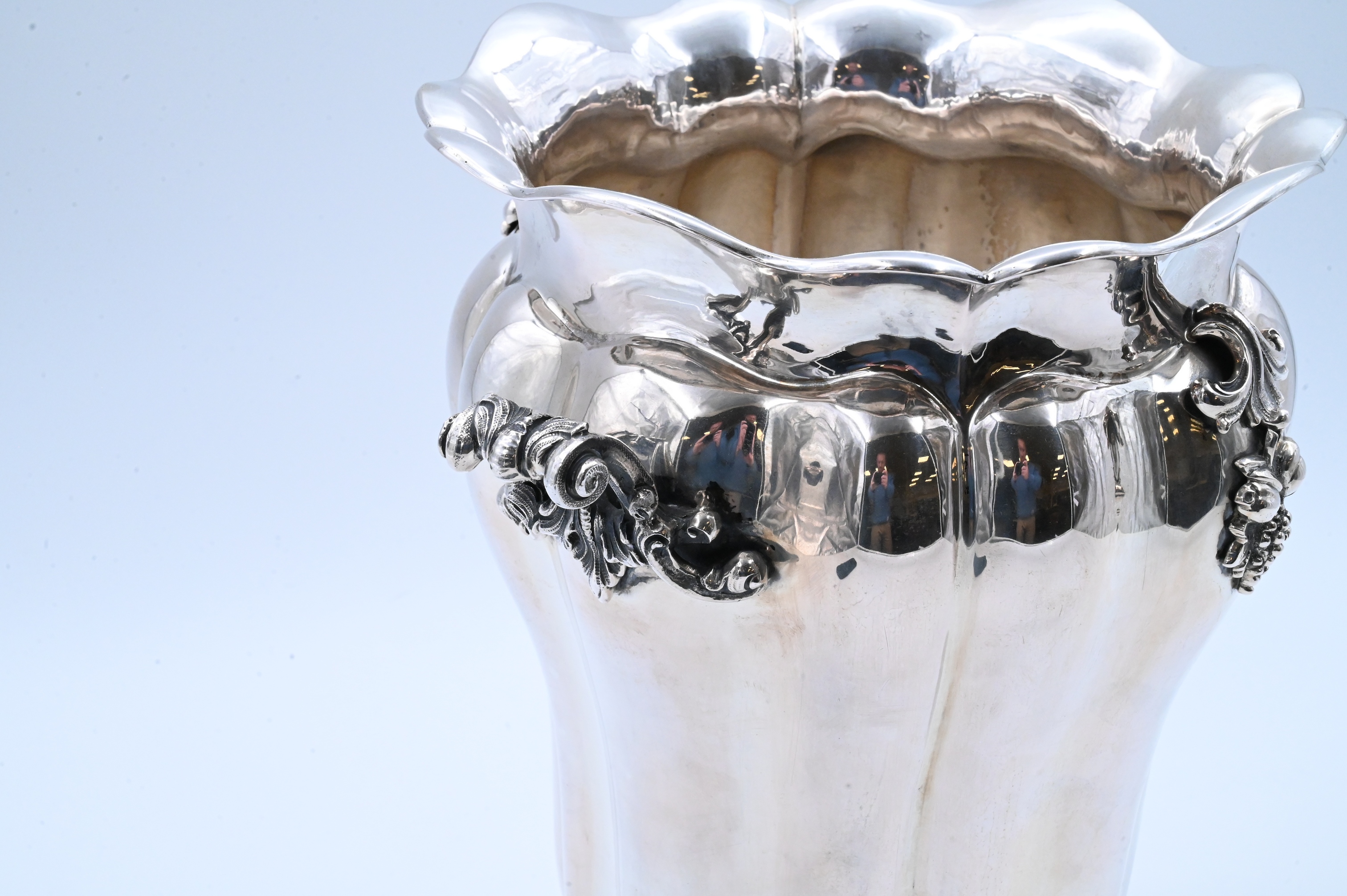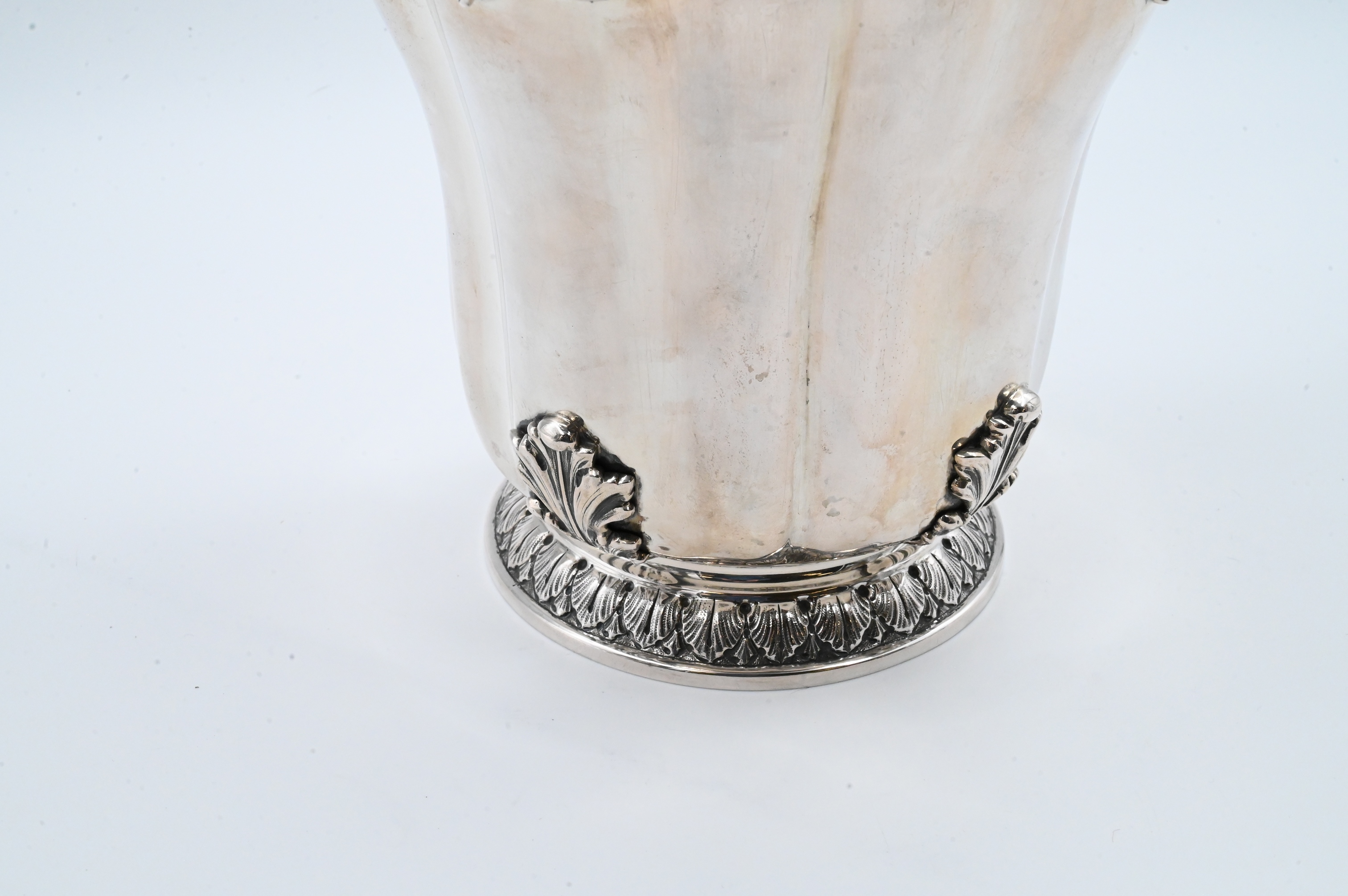 Bulbous baluster-form vase with scalloped rim and repoussé Rococo scrollwork, further embellished with applied clusters of berries and leaves to each side, marked 800 with additional maker’s punch