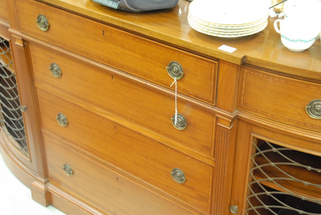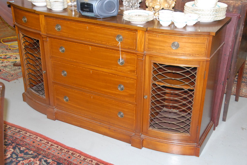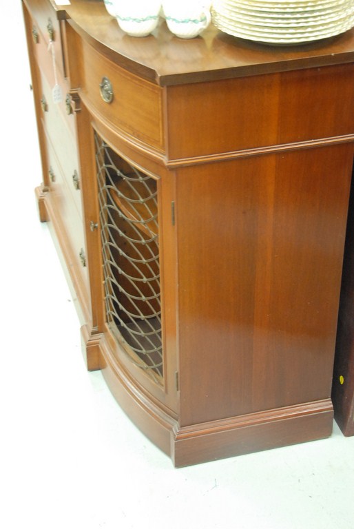 Lot 697: Margolis mahogany credenza, D shaped with drawers and two grill work doors, branded Margolis Shops on back
