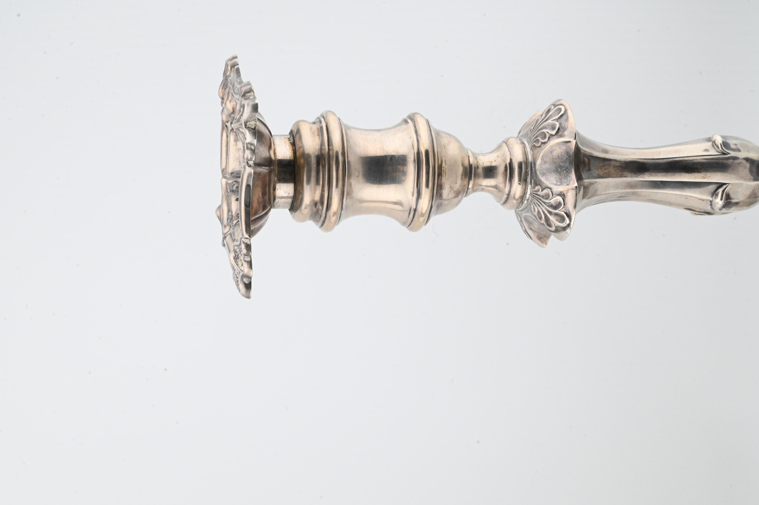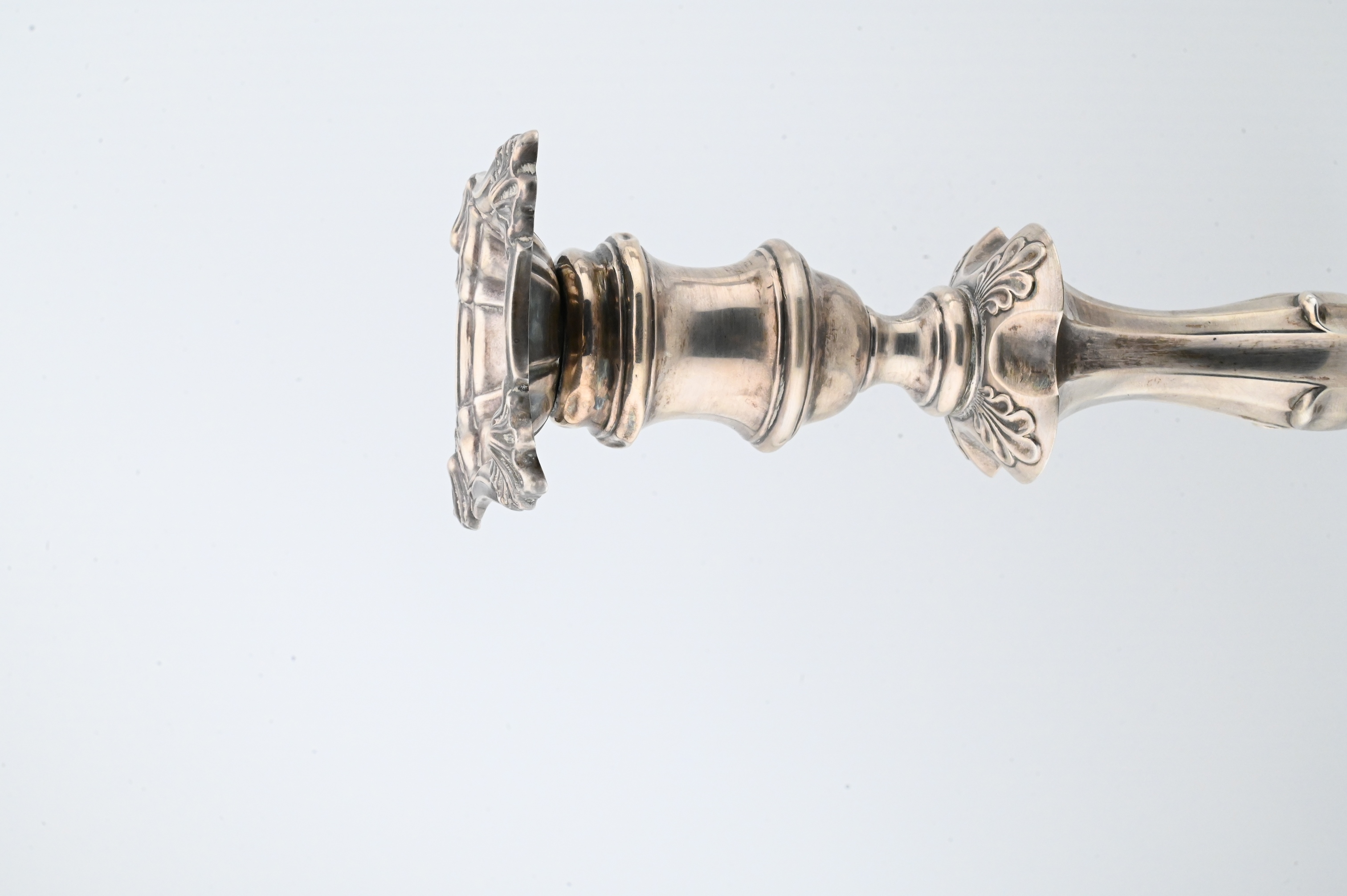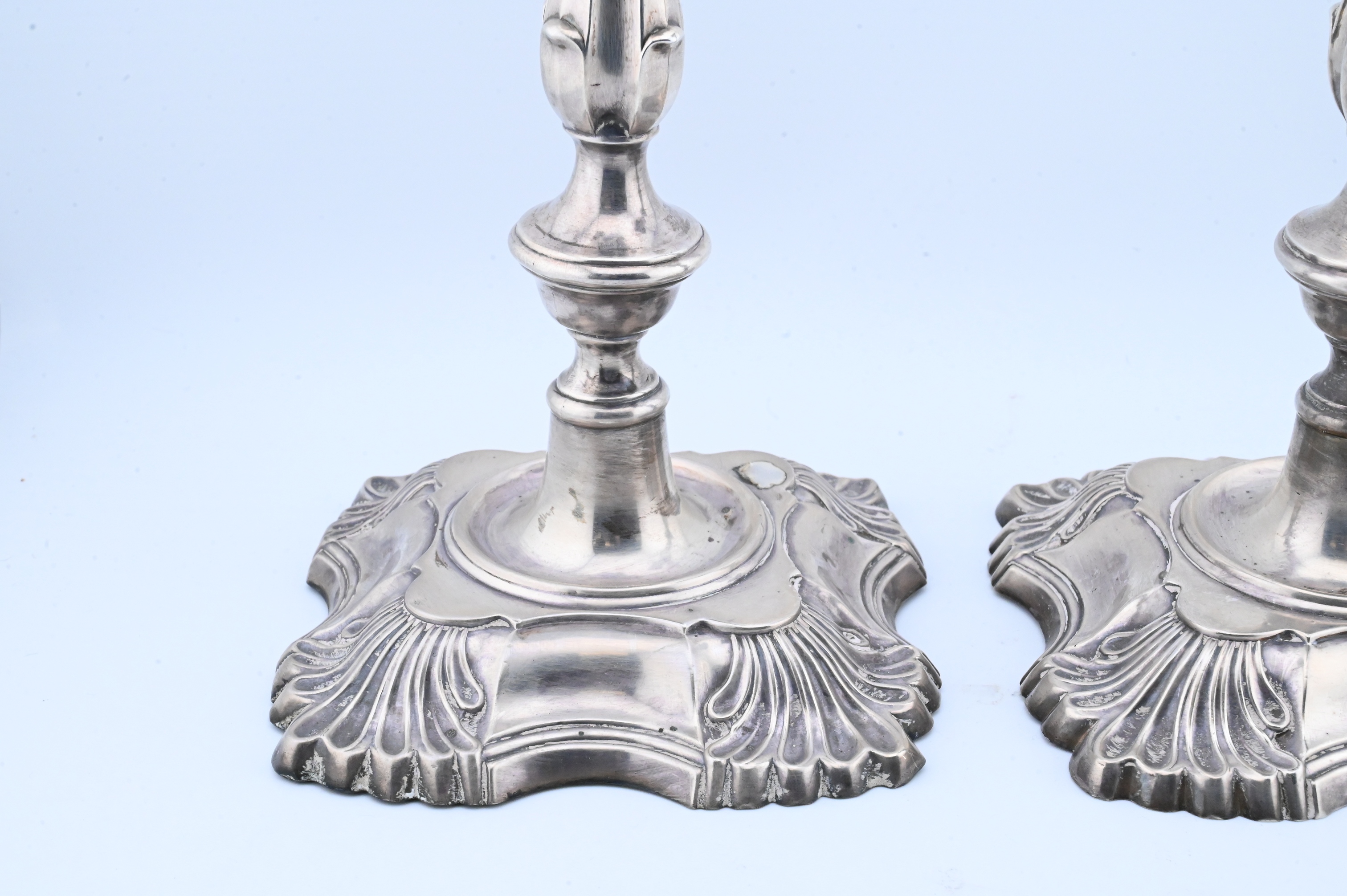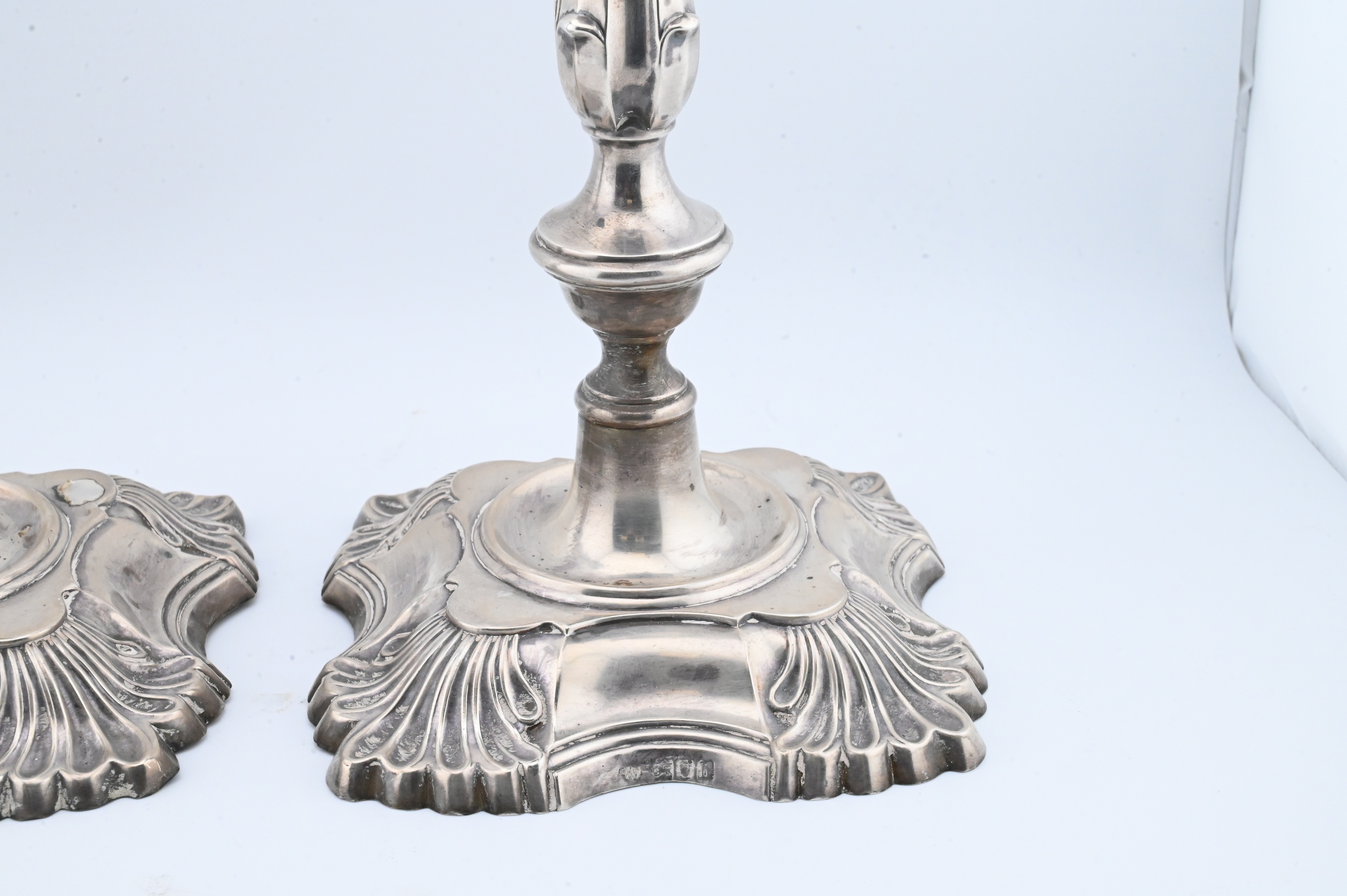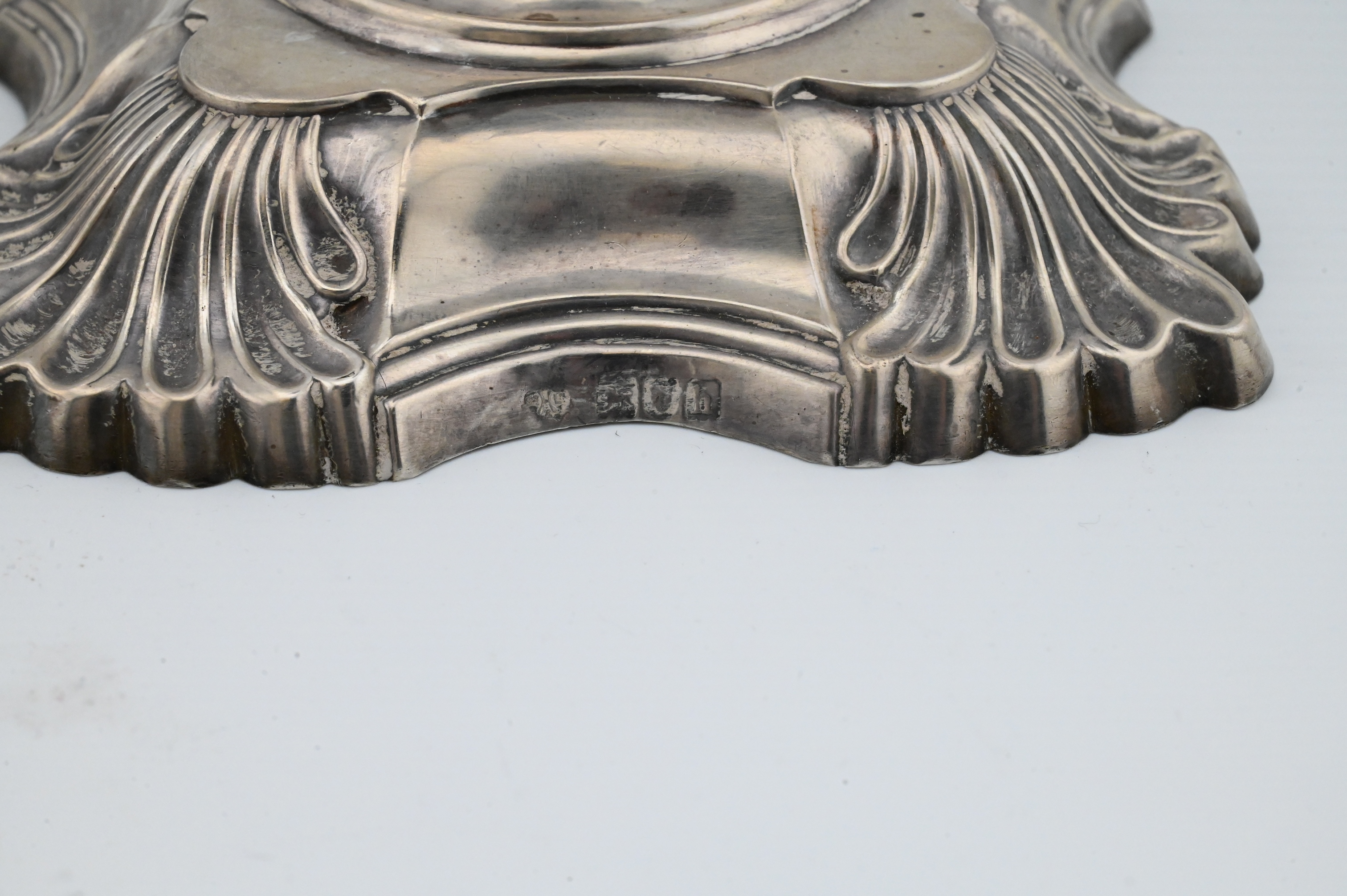 each with shaped square base chased with shell and scroll motifs, rising to knopped baluster stems and scalloped bobeches, hallmarked for London with maker’s mark of William Hutton & Sons Ltd., weighted, possibly 19th century
