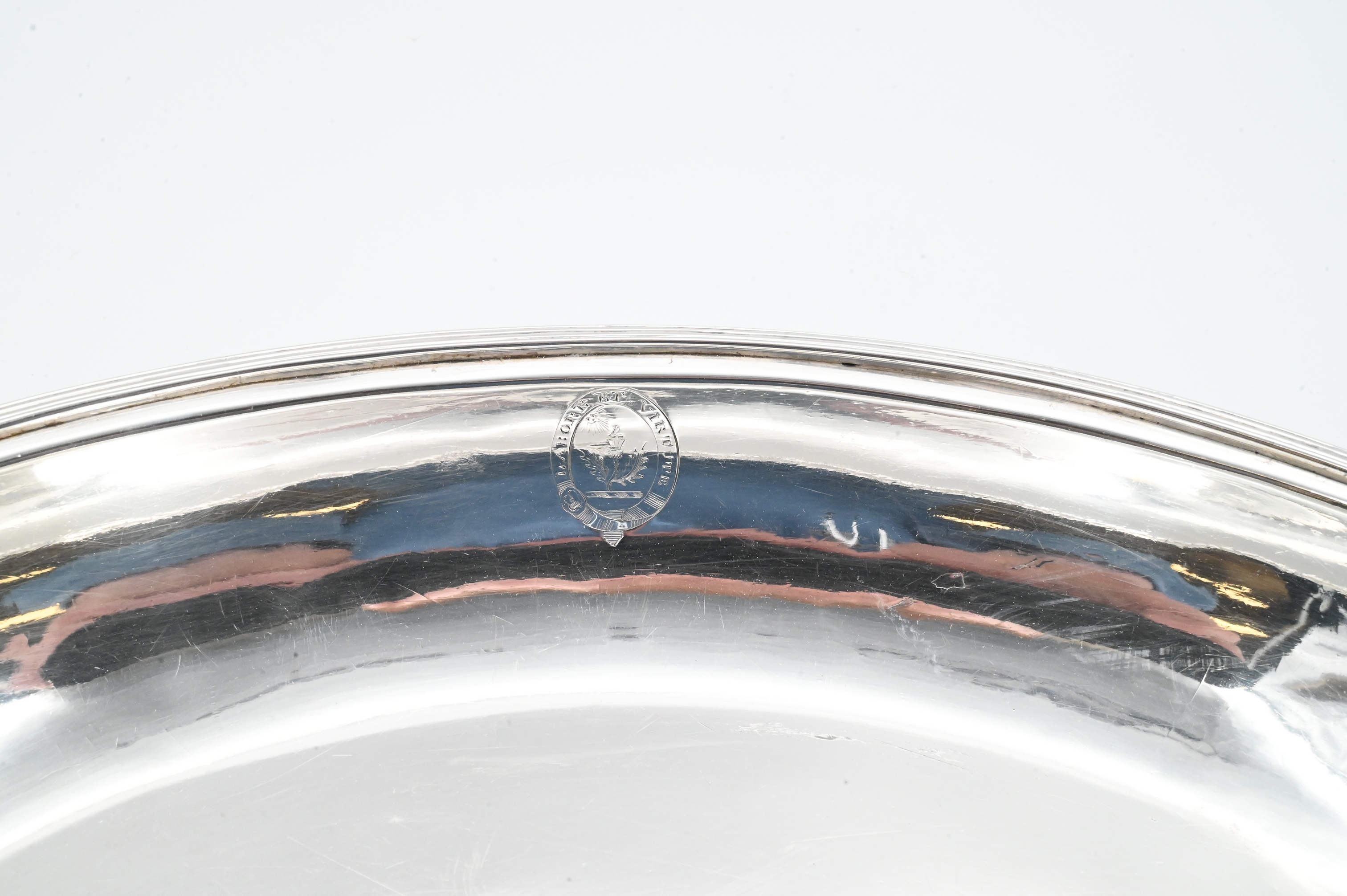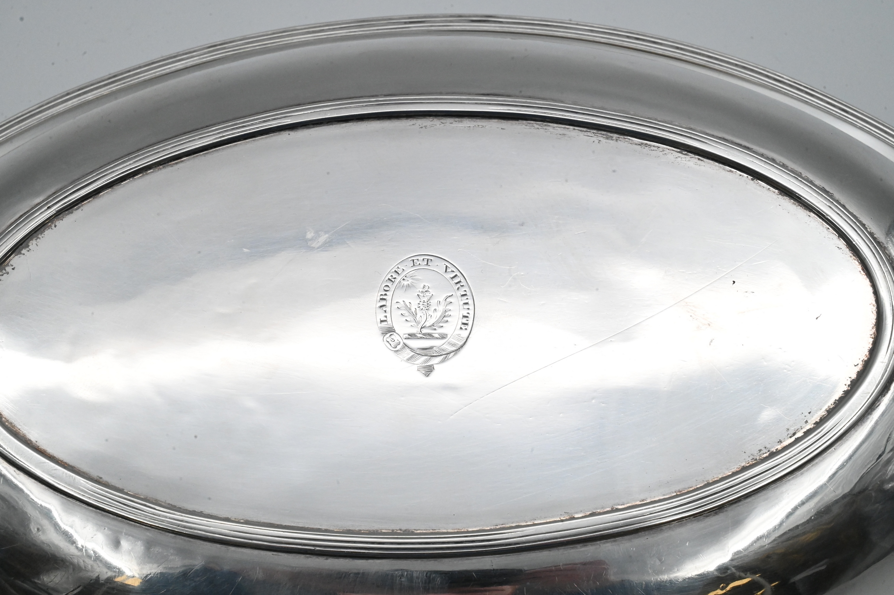 oval form with reeded loop handles and removable domed cover, both engraved with armorial crest and motto “Labore et Virtute,” hallmarked for London, maker’s mark of Robert Gaze, circa 1800
