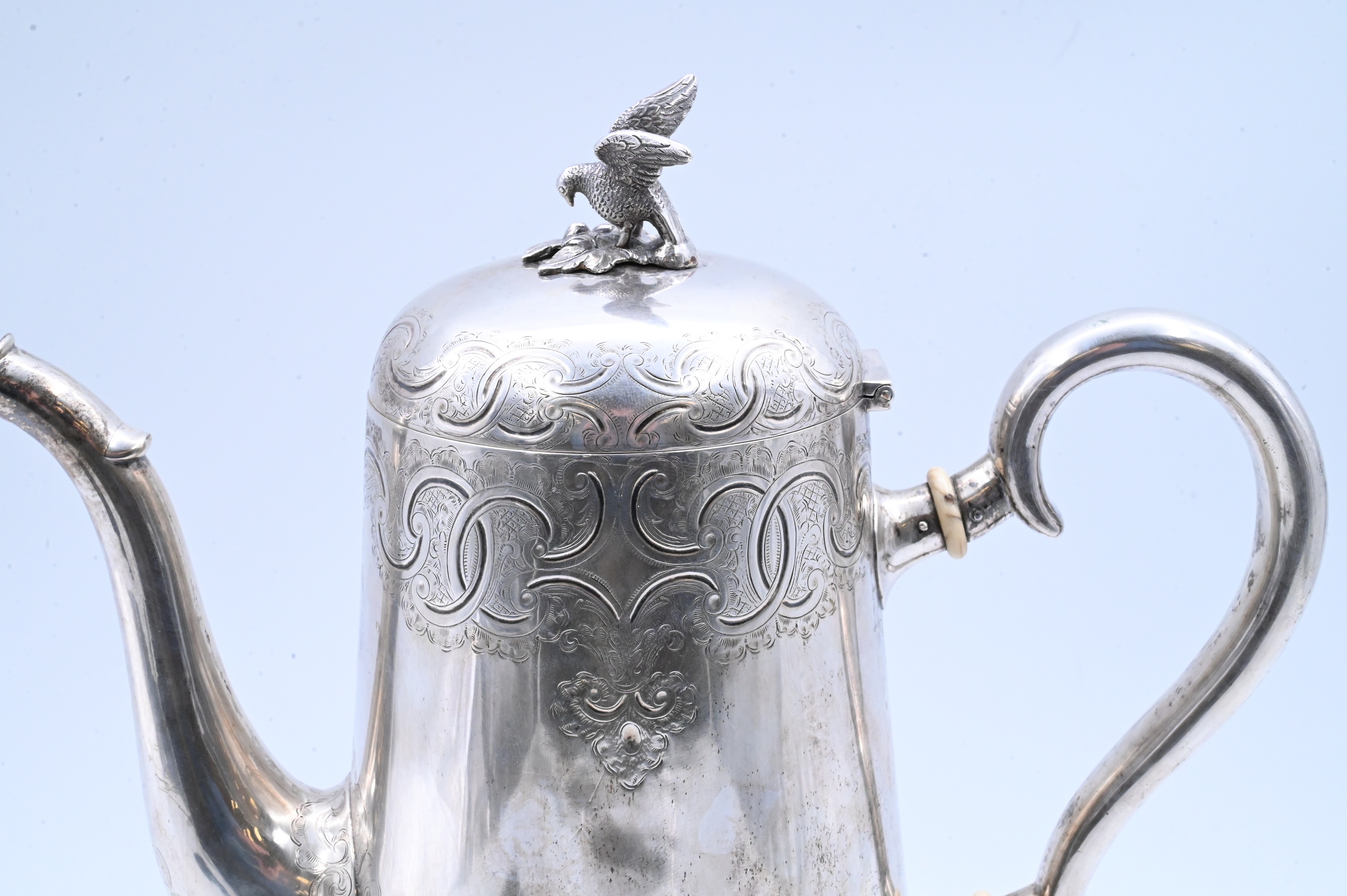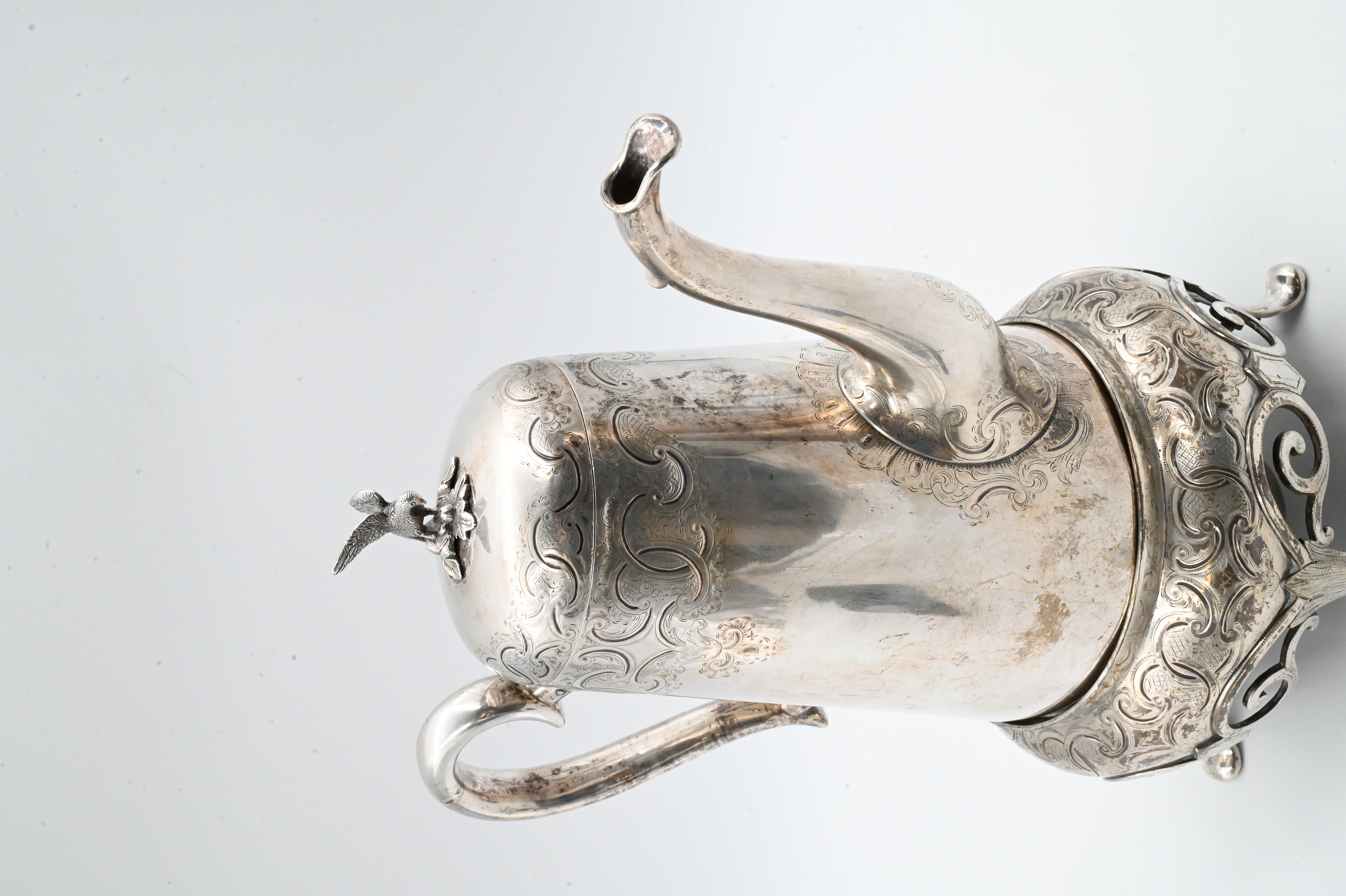 tapered cylindrical form finely engraved with scroll and foliate motifs, the hinged lid surmounted by a cast eagle finial, raised on a matching pierced warming base with paw feet, bearing Copenhagen assay marks and maker’s mark for Michelsen, circa 19th century