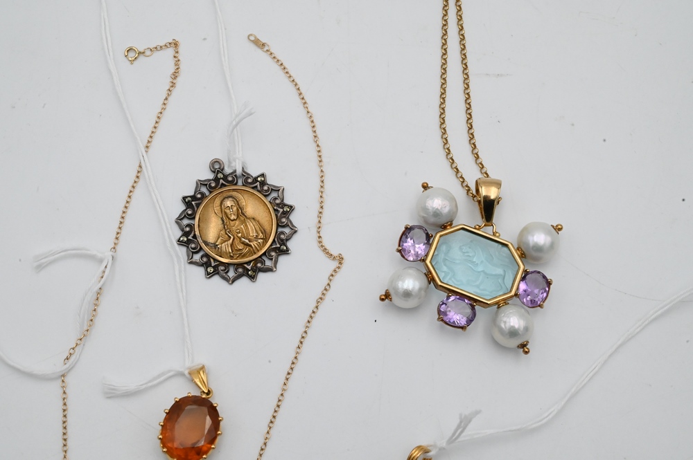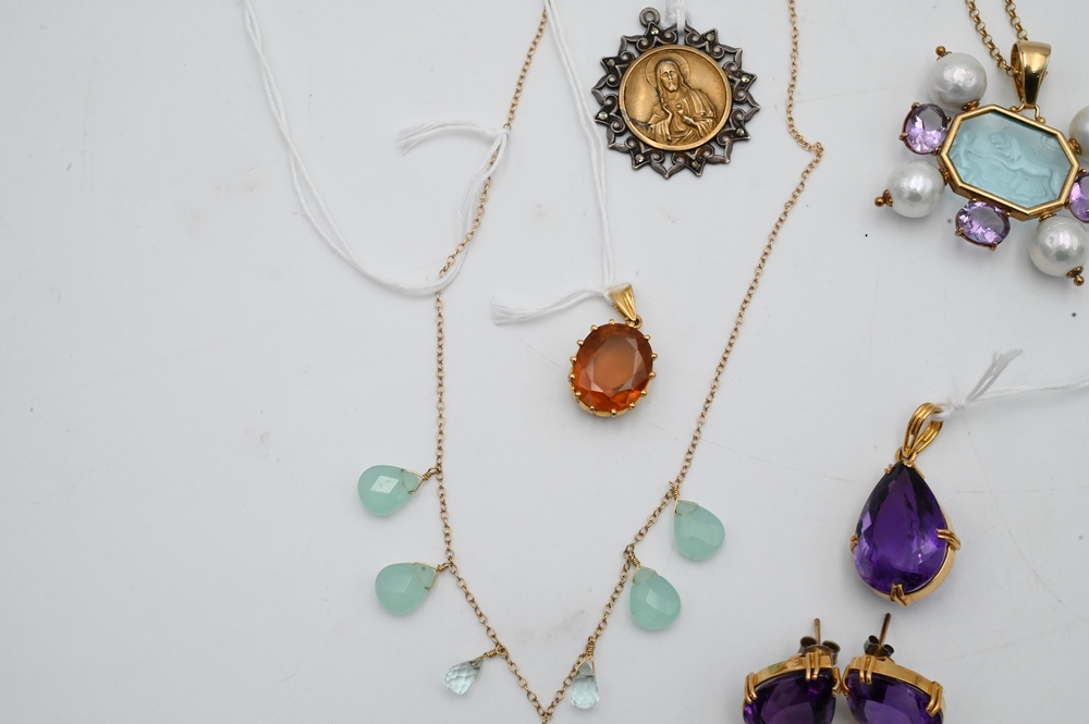 Lot 6C: Five Piece Group, to include amethyst earrings and pendant; 14 karat Tagliamonte pendant with pearls and amethyst silver chain; gold pendant with yellow oval stone; 14 karat necklace mounted with green stones; along with a gold and silver medallion.