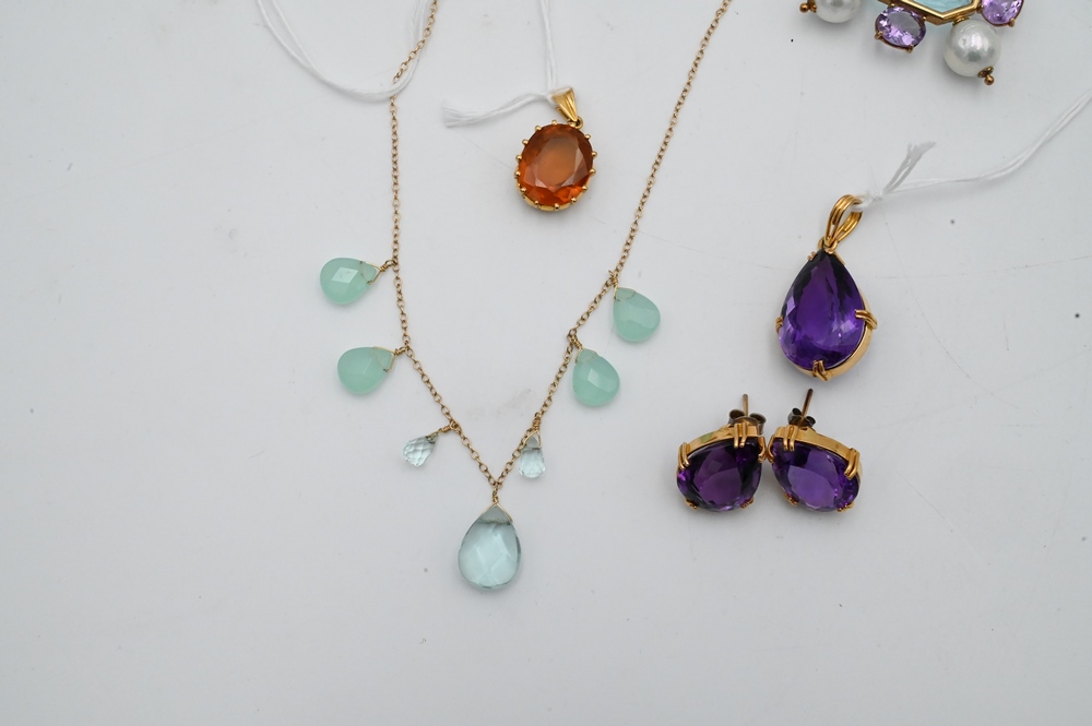 Five Piece Group, to include amethyst earrings and pendant; 14 karat Tagliamonte pendant with pearls and amethyst silver chain; gold pendant with yellow oval stone; 14 karat necklace mounted with green stones; along with a gold and silver medallion.