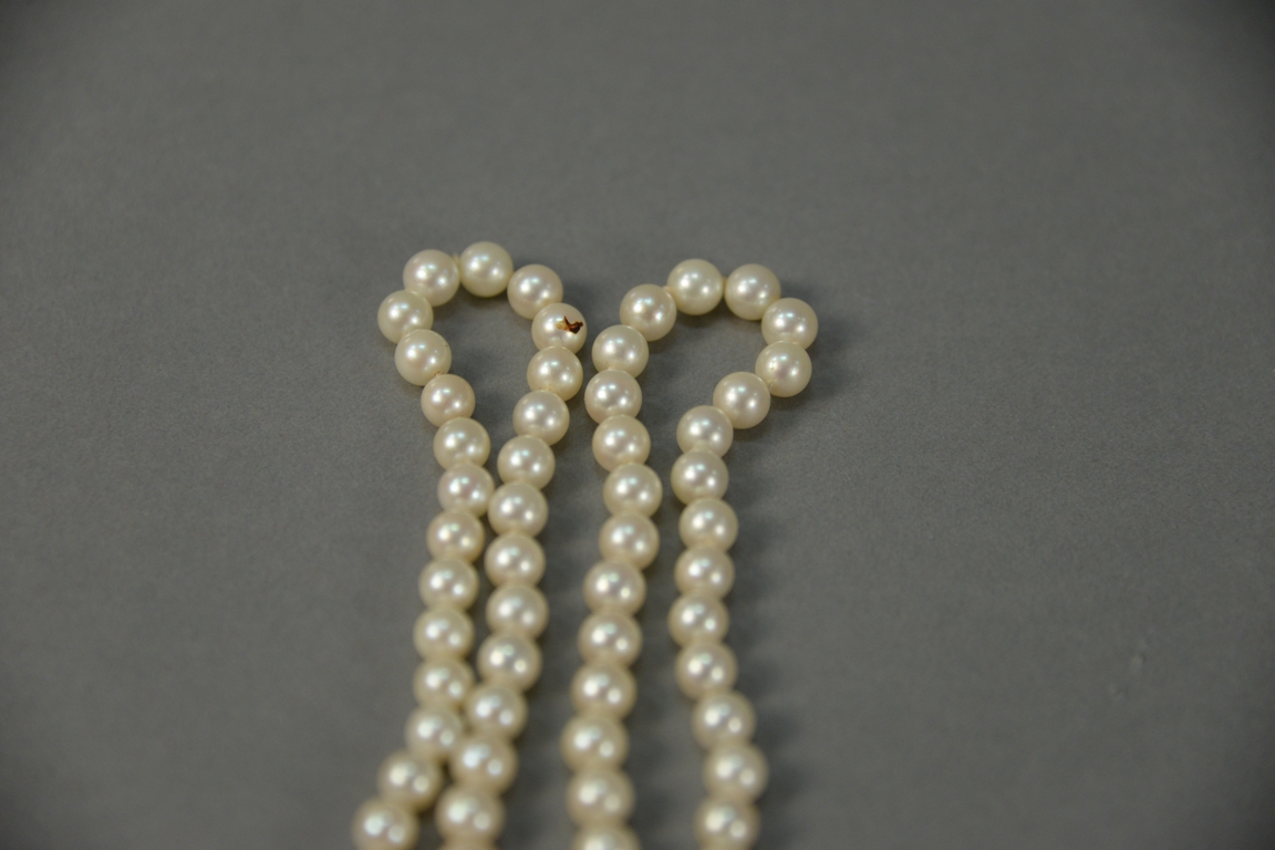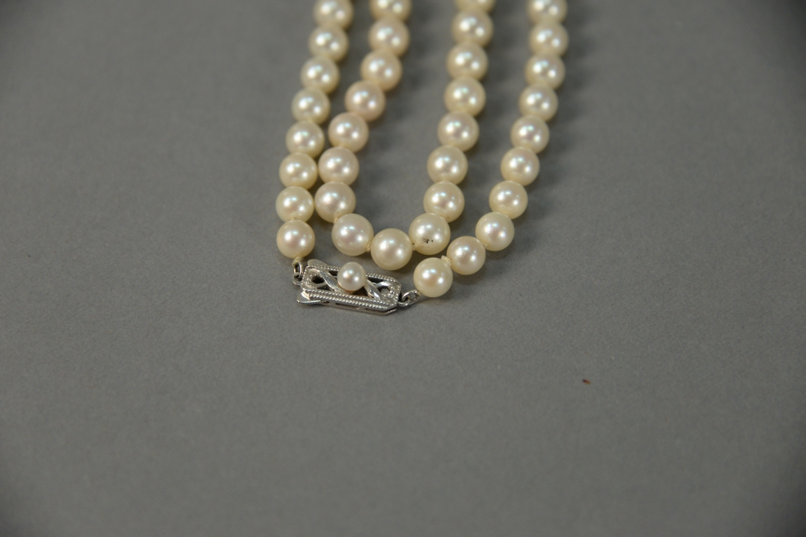 Lot 6C: Single strand of pearls with 14K white gold Mikimoto clasp marked with M and 14K. 6.2mm, lg. 23 1/2in.
