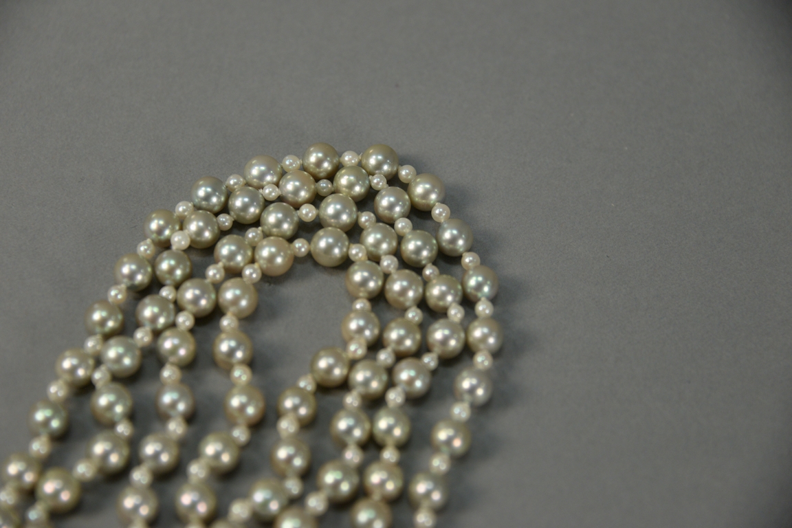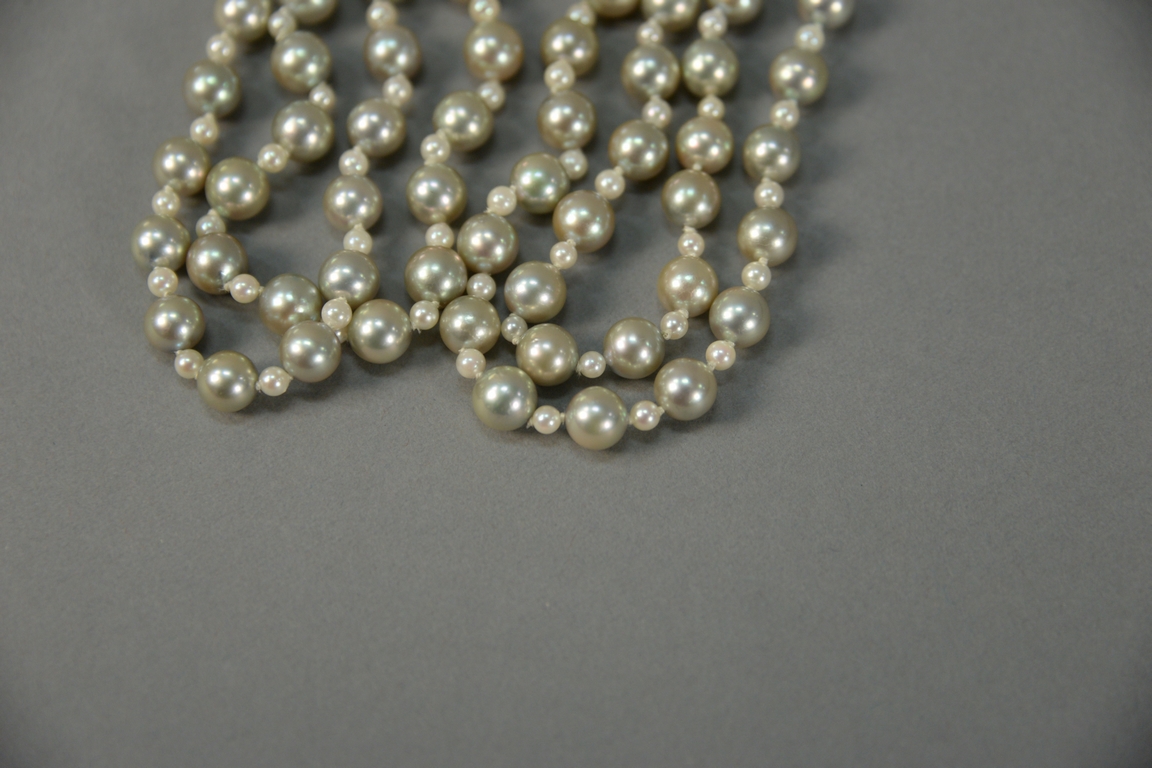 Lot 6D: Single strand of cultured pearls, light grey with alternating small white pearls, 7mm and 3.2mm, 36in.