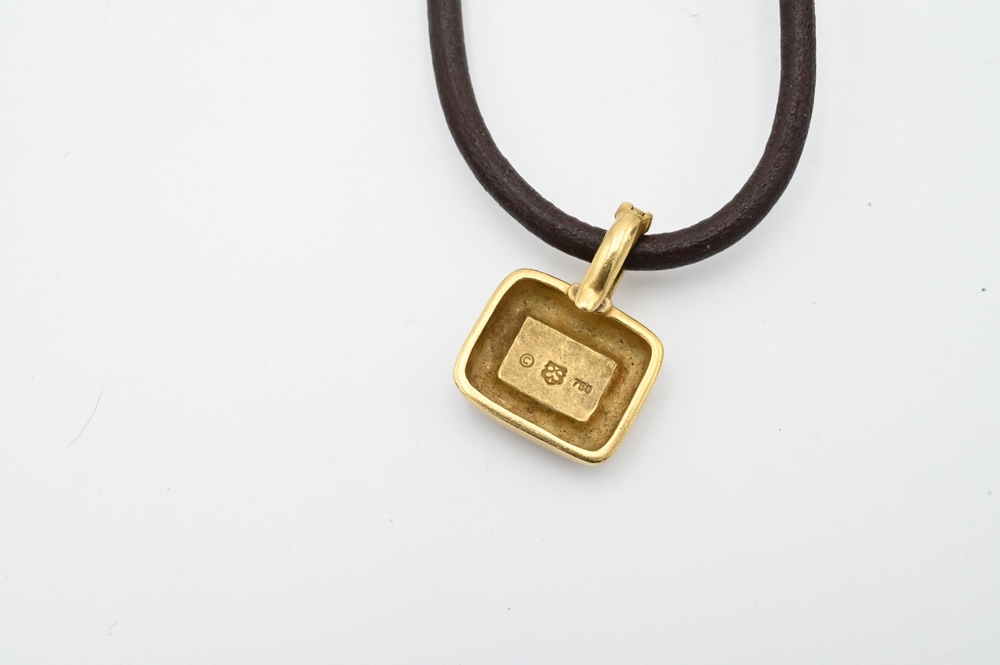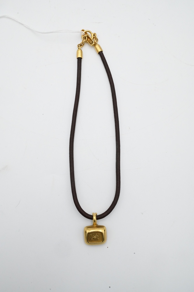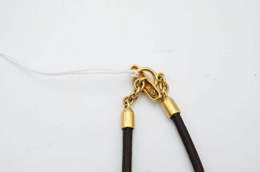 Lot 6G: Slane 18 Karat Gold and Leather Collar Necklace , having 18 Karat pendant and 18 Karat ends, length 15 inches, pendant approximately 18 grams, total weight 36.3 grams.