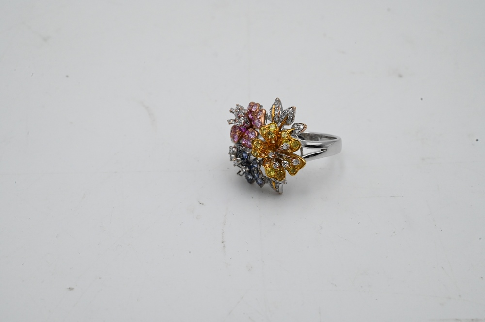 Queen & Daddy 18 Karat White, Yellow and Rose Gold Ring, set with diamond, pink and yellow sapphires, size 6 3/4, 8.7 grams.