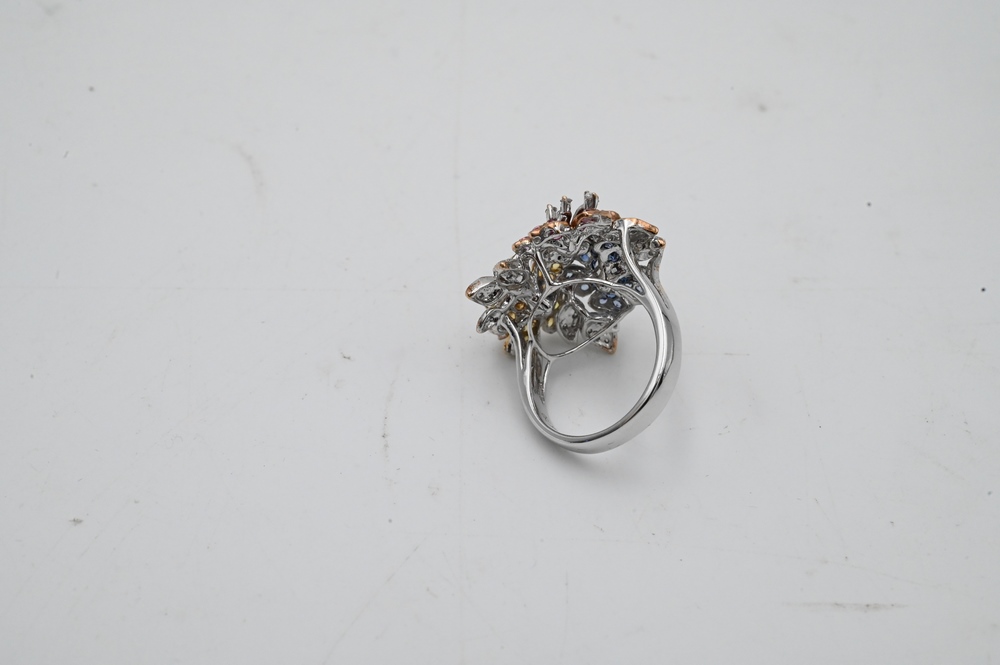 Lot 6J: Queen & Daddy 18 Karat White, Yellow and Rose Gold Ring, set with diamond, pink and yellow sapphires, size 6 3/4, 8.7 grams.