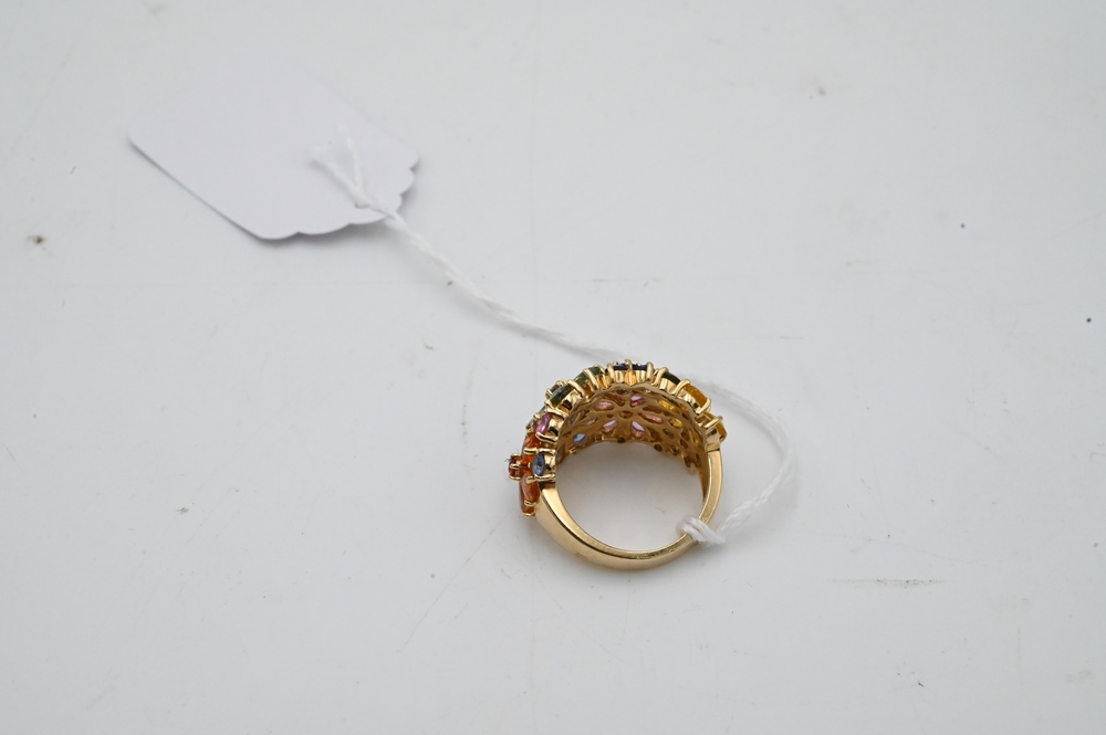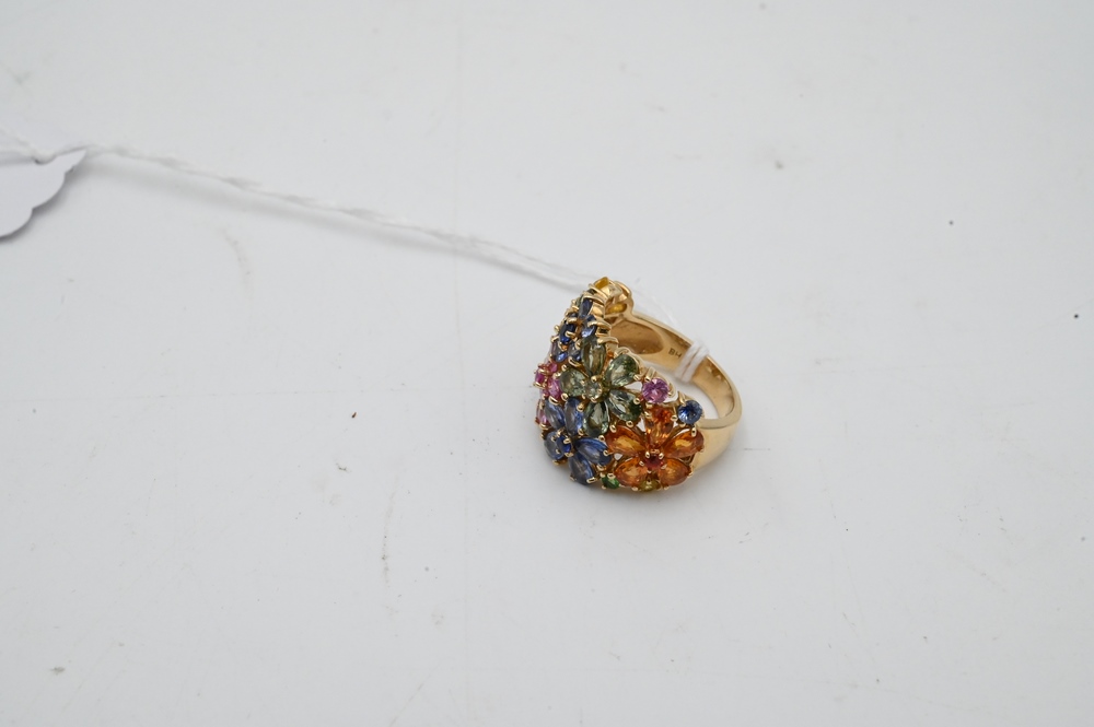 Lot 6N: 14 Karat Gold Multicolor Sapphire and Tsavorite Floral Design Cocktail Ring, size 7, 9.2 grams.