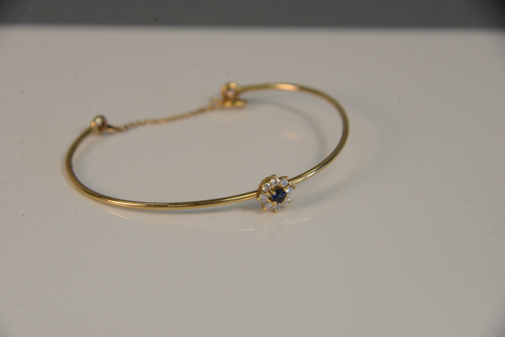 14K bracelet set with blue stone surrounded by eight diamonds. 5.4 grams