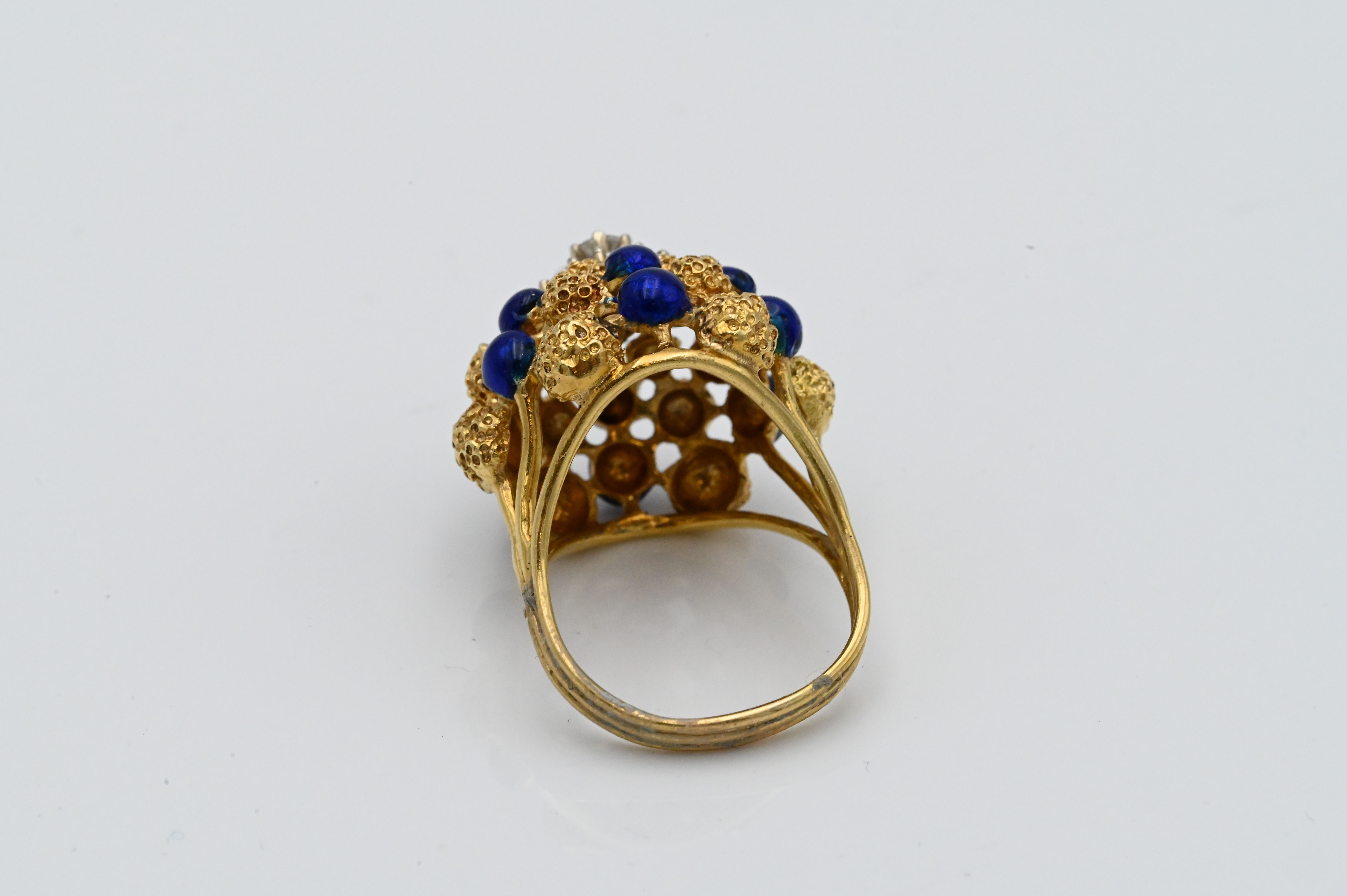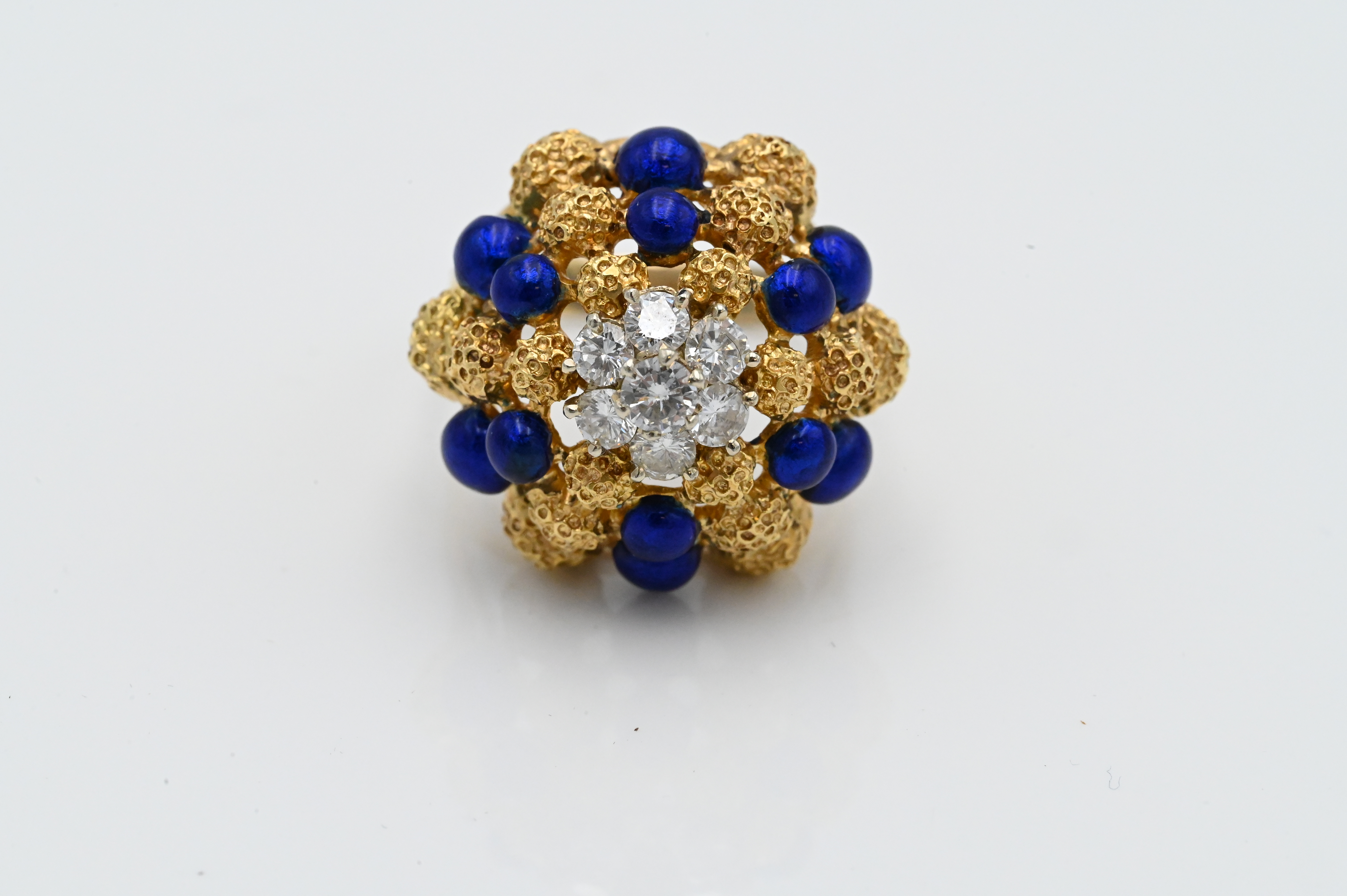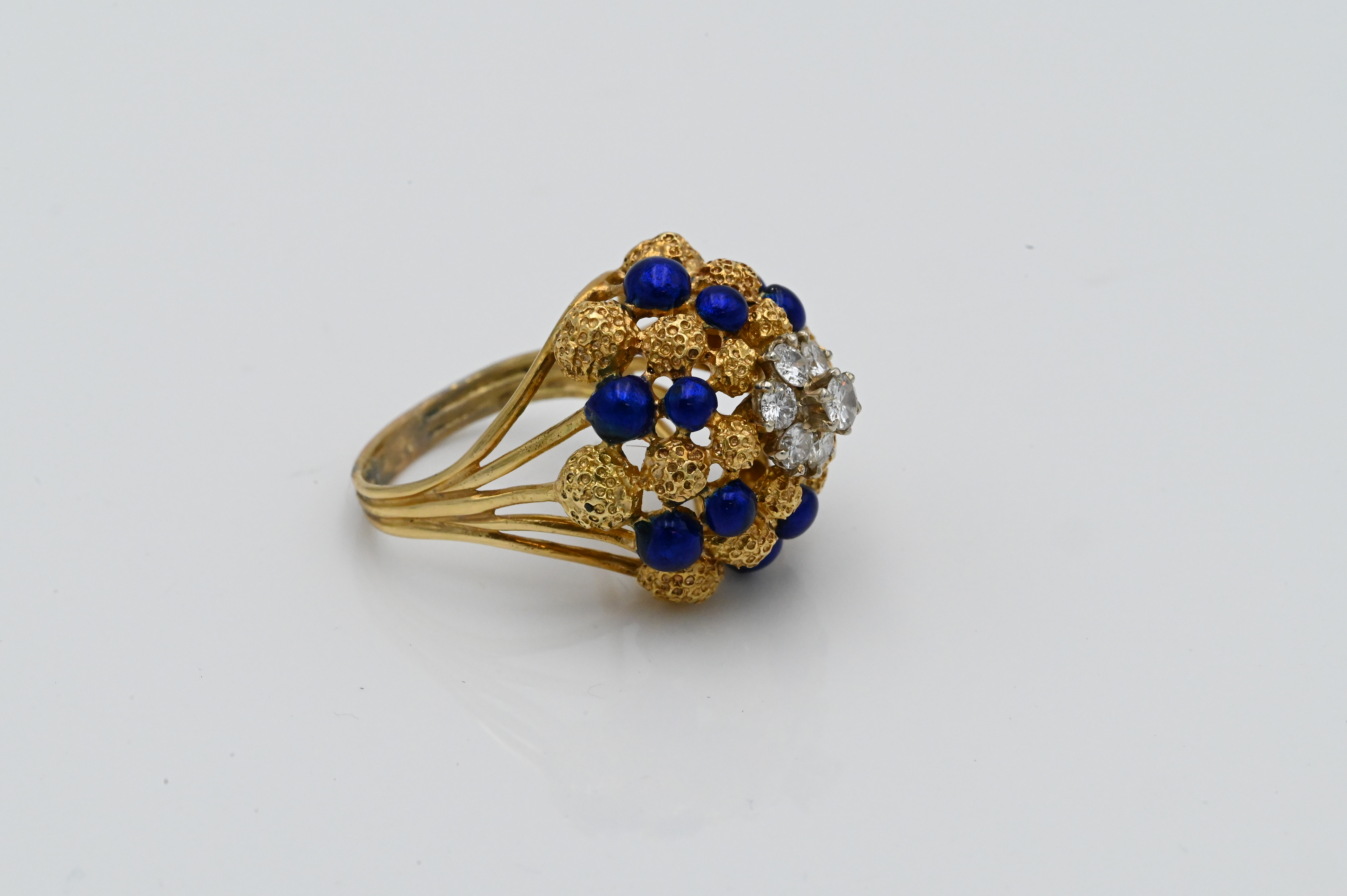 18 Karat Yellow Gold Cocktail Ring, set with 7 diamonds along with 12 blue enamel beads and gold, size 8 1/2, 13.6 grams.
