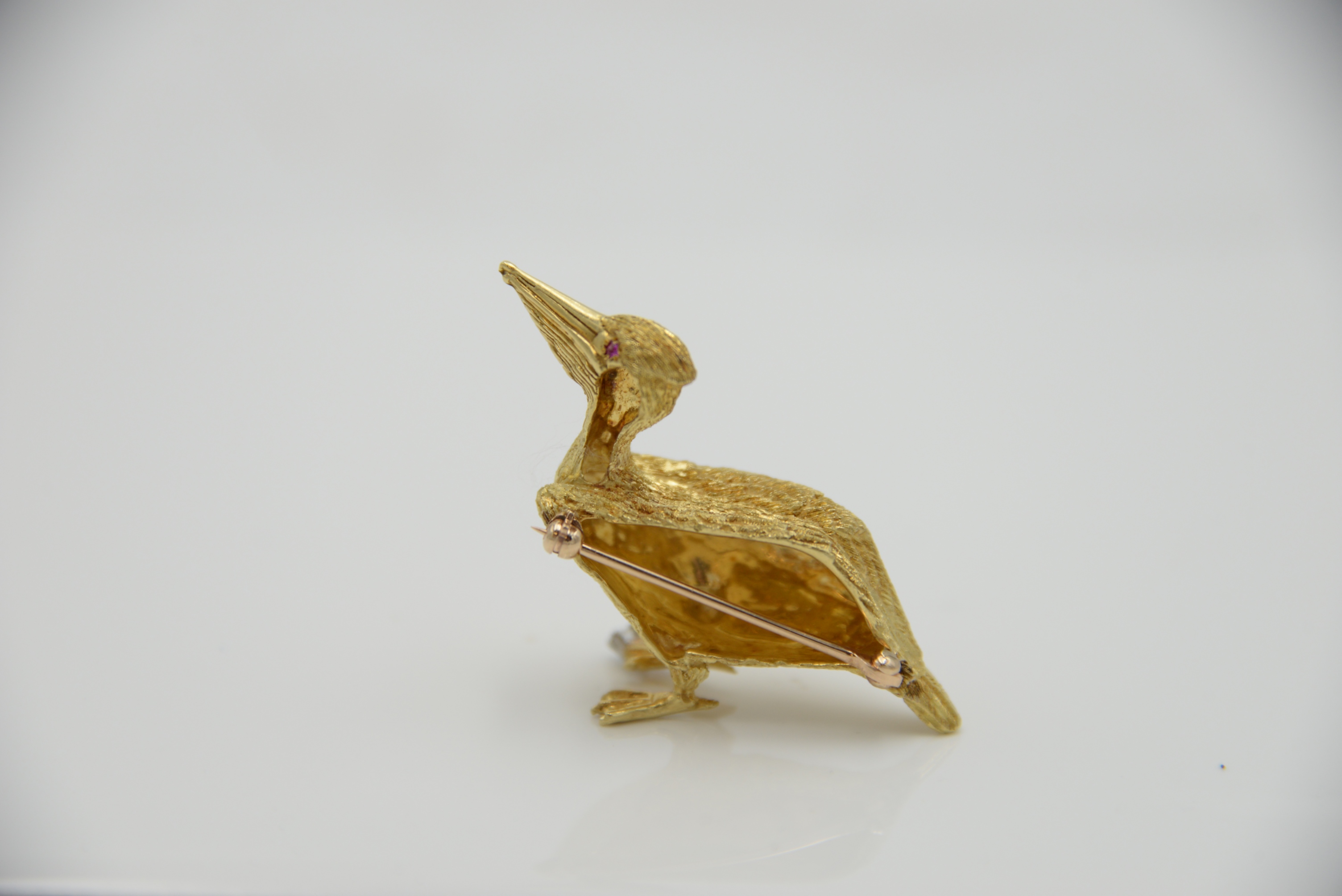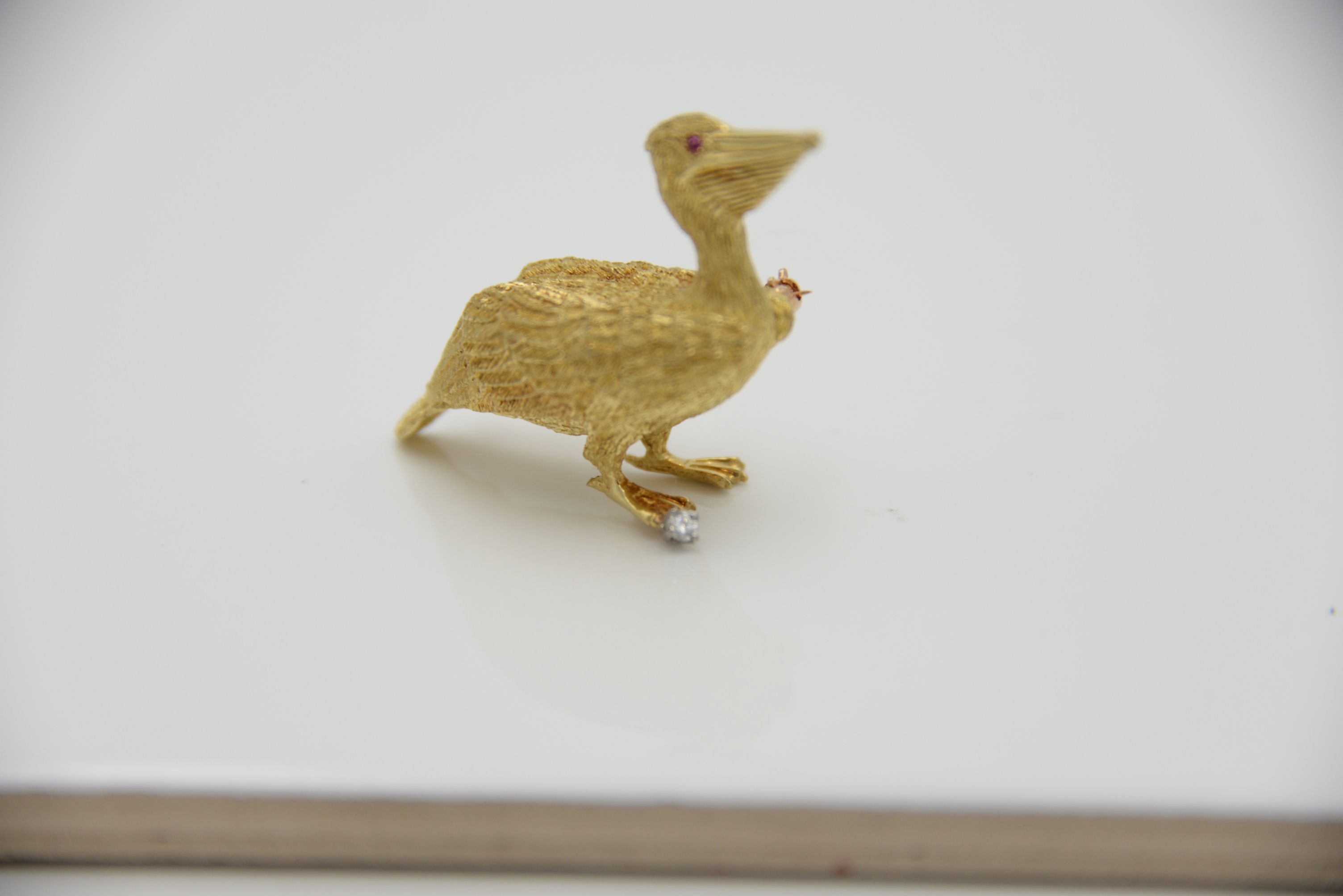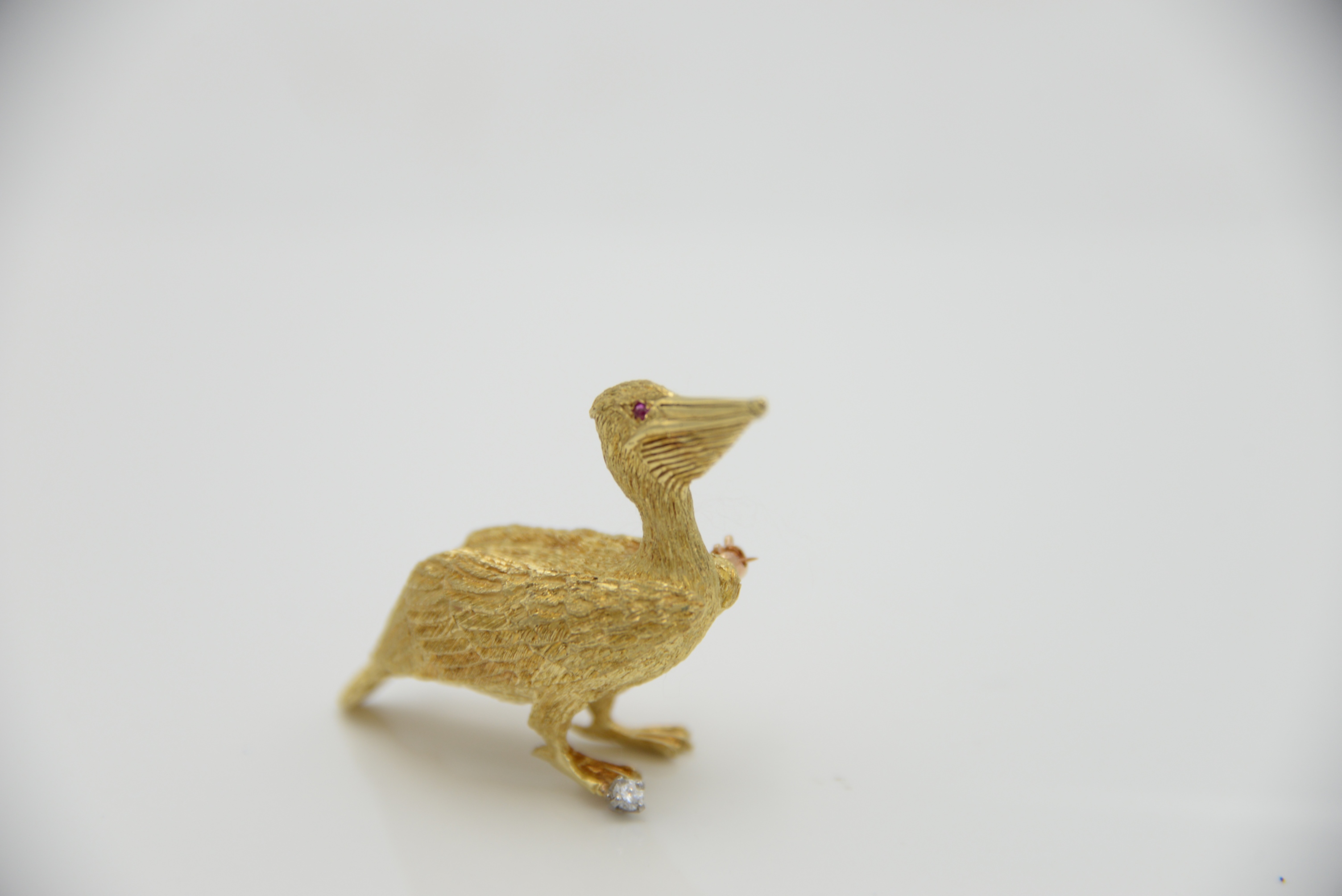 18 Karat Yellow Gold Pelican Brooch having red eyes and diamond mounted on one toe length 1 3/4 inches, width 1 1/2 inches, 15.9 grams