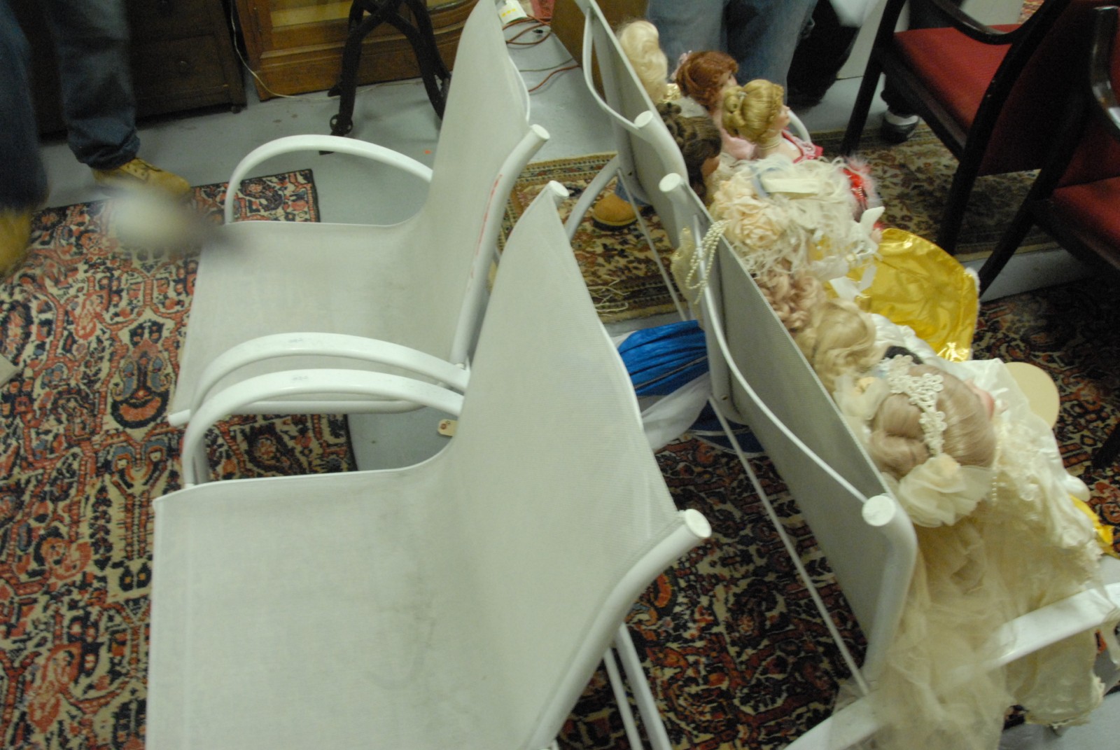 Eight piece outdoor set, two round tables, two chaises, four armchairs