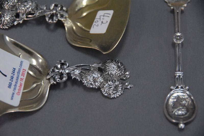 Lot 7: Group of five sterling decorative small serving pieces to include a pair of Tiffany bon-bon shovels, 4.2 t oz.