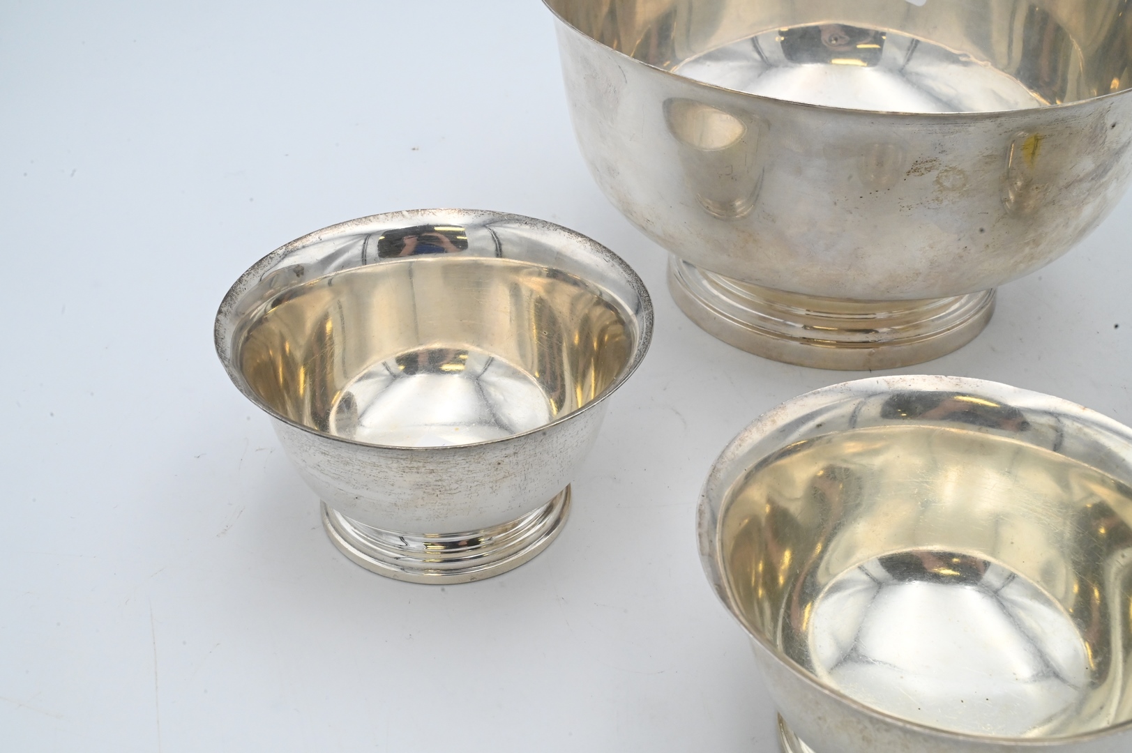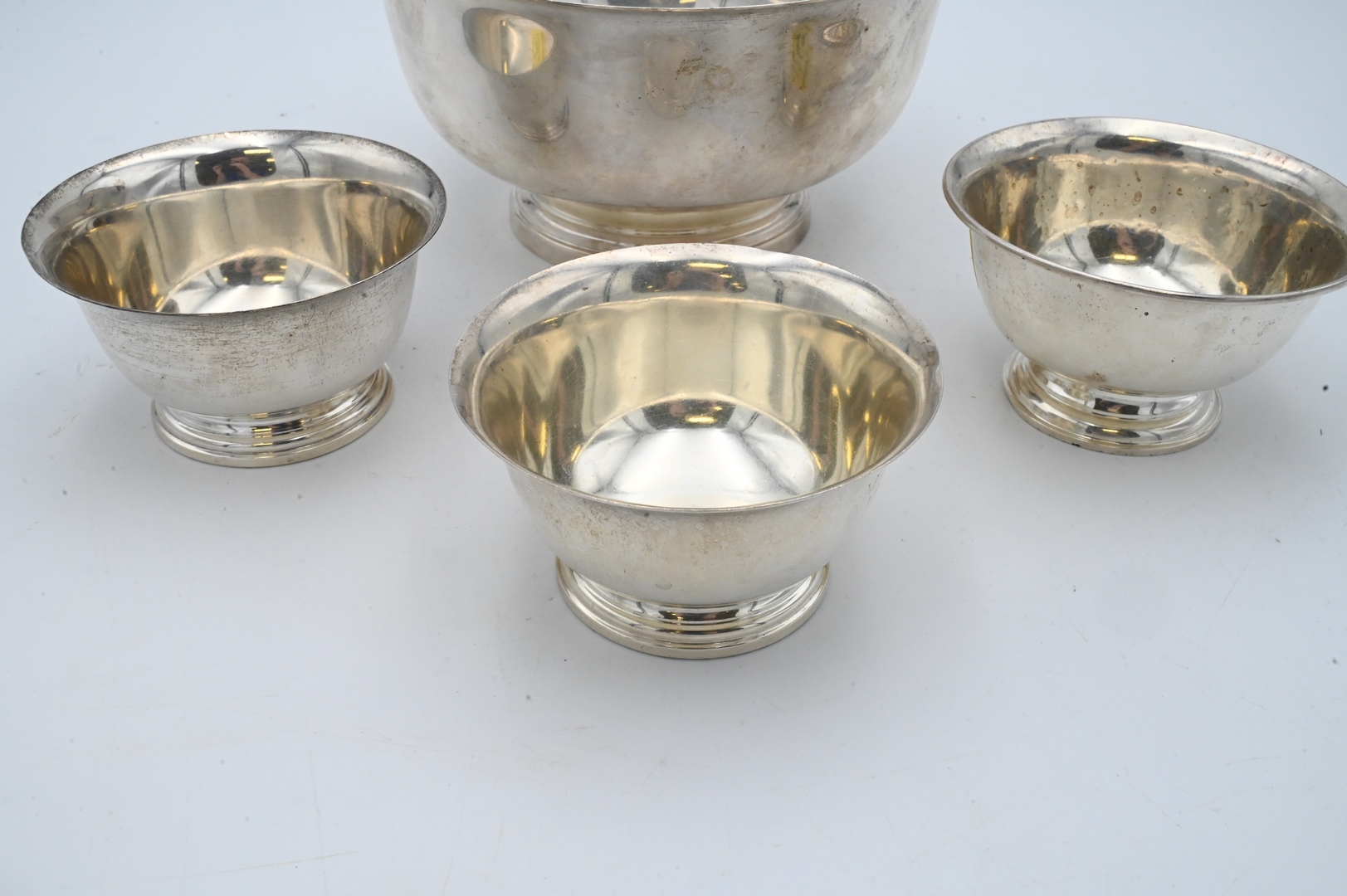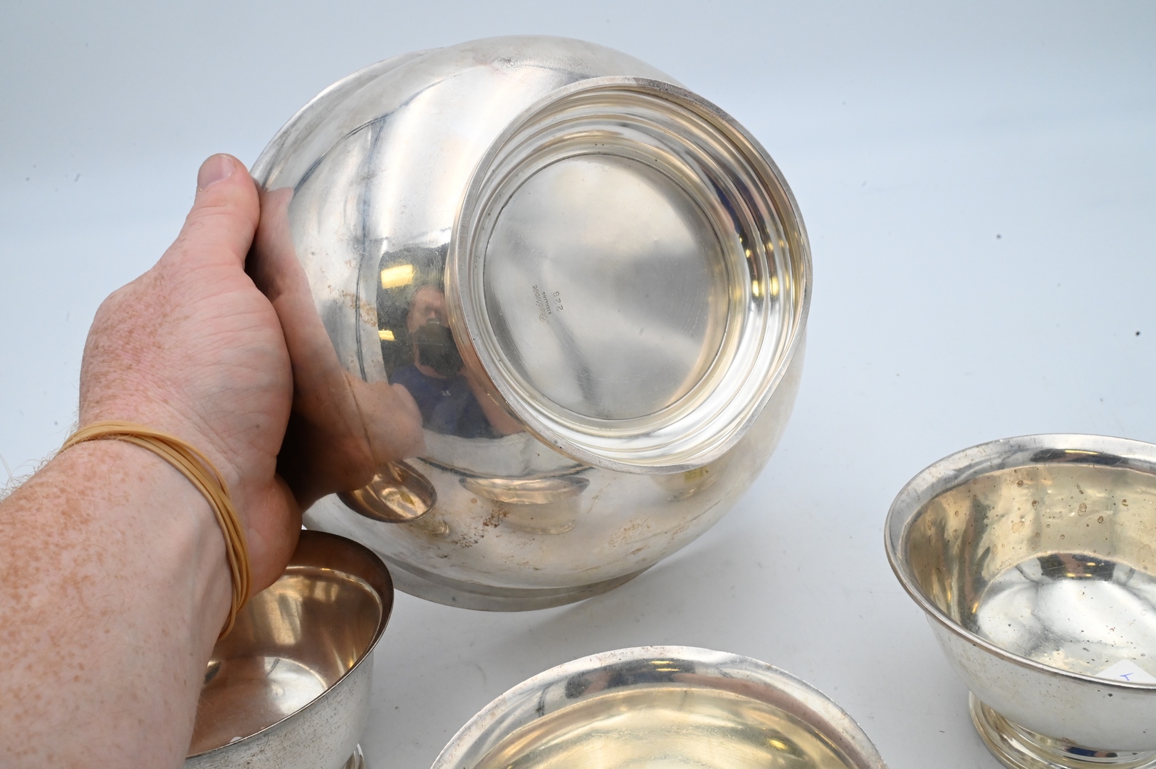 Group of Four Sterling Silver Bowls, to include two Paul Revere reproduction bowls, largest in height 4 1/2 inches, diameter 8 inches.