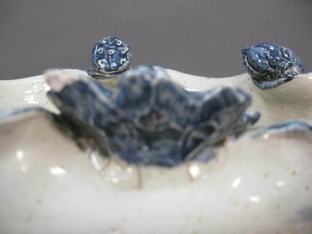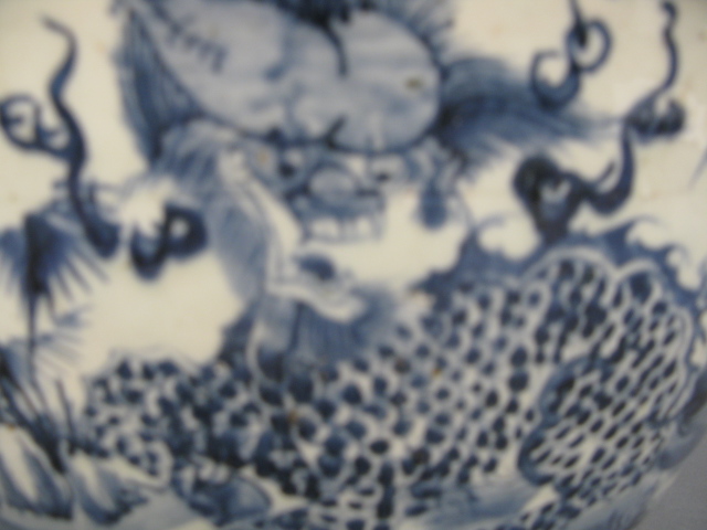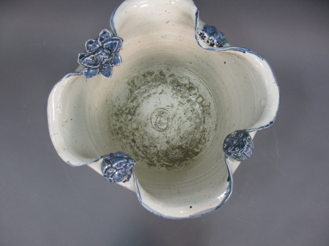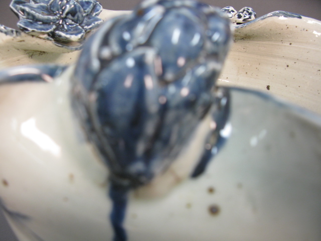 Large blue and white porcelain pot having two painted foo-dog figures and four molded flowering lotus buds.
