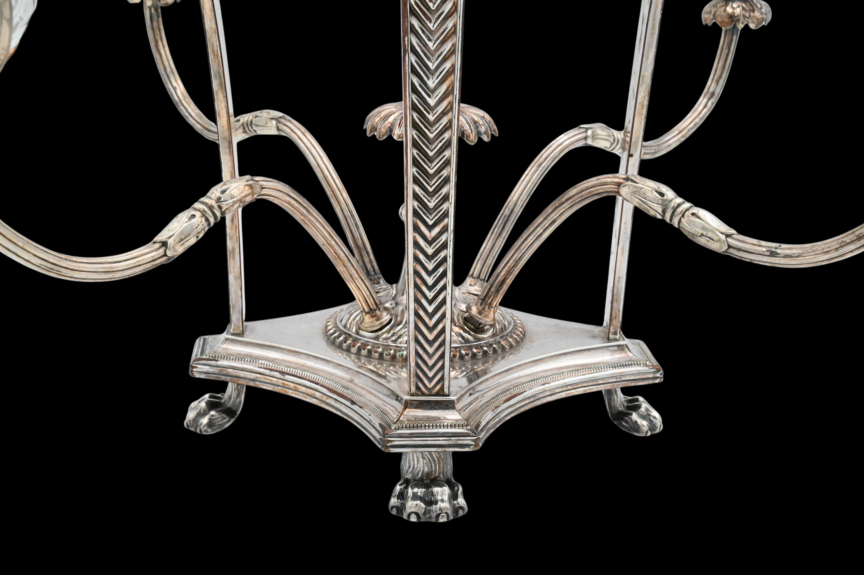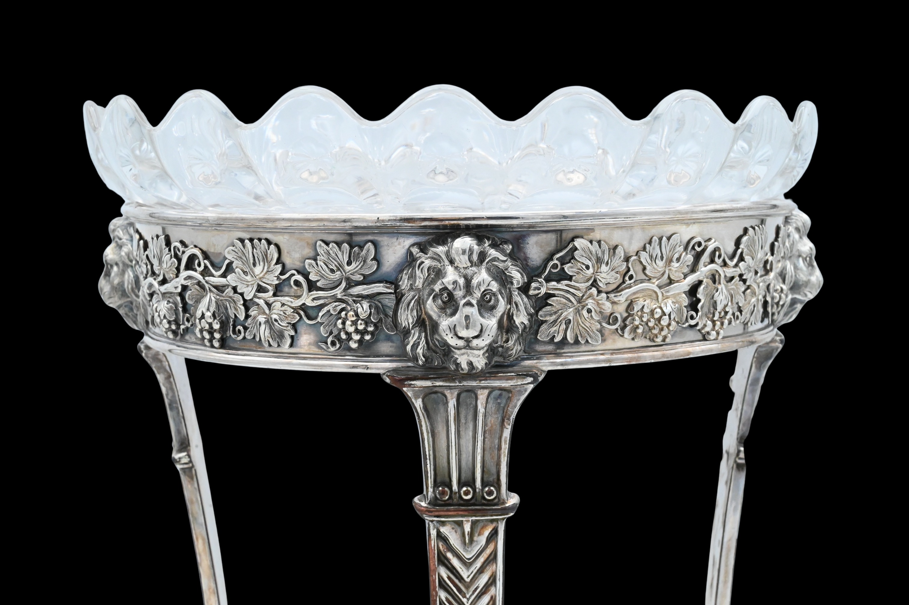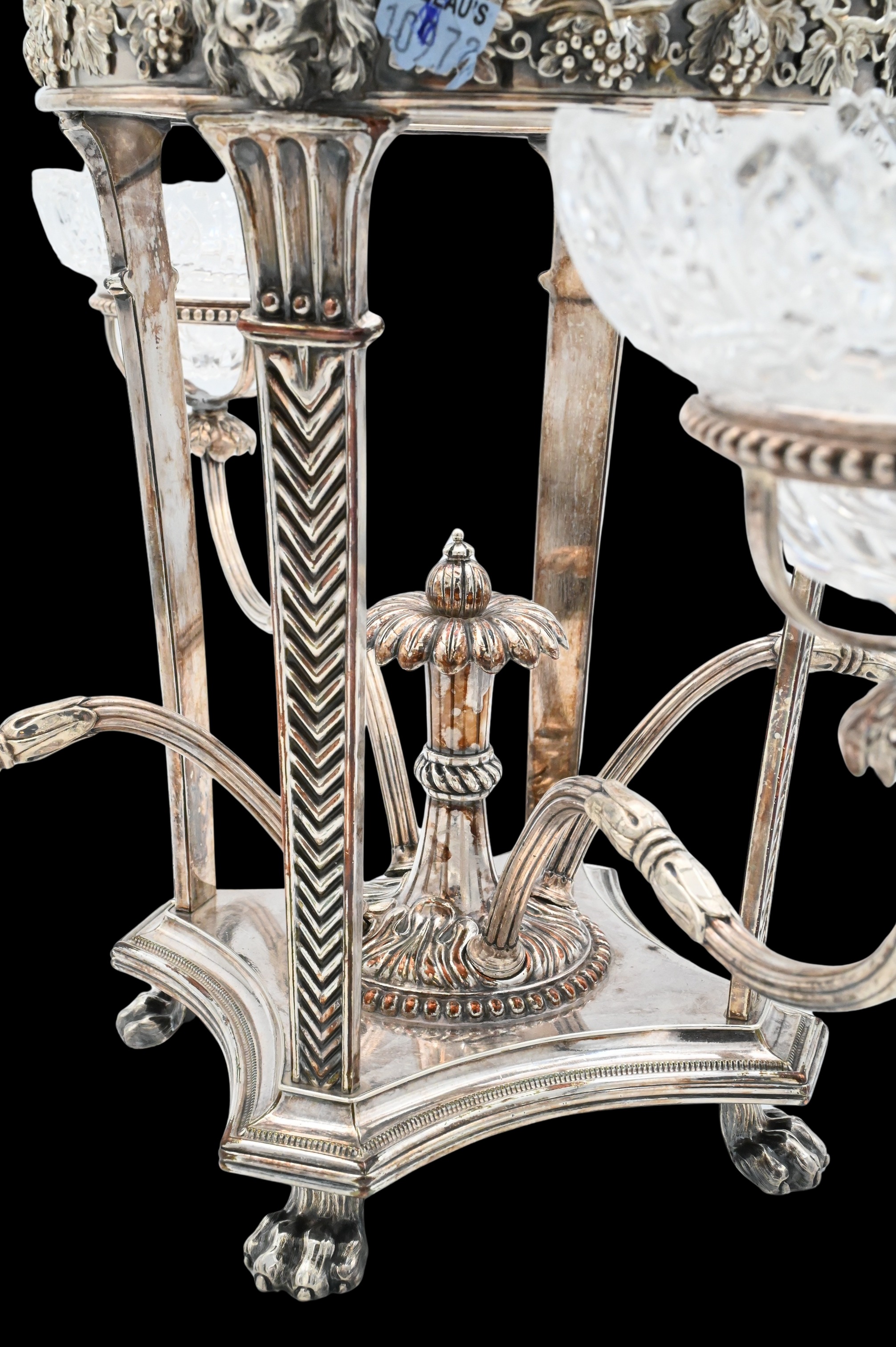 decorated with Lions heads and grape vines, and central finial with four removable arms holding cut glass bowls, on a base with four lions paws, center bowl having pressed glass