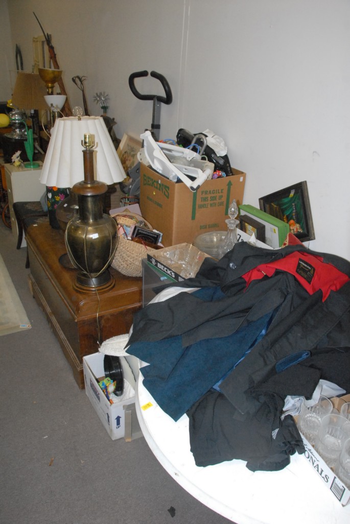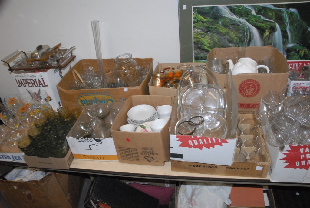 On top and below two tables glass, china, stemware, books etc.