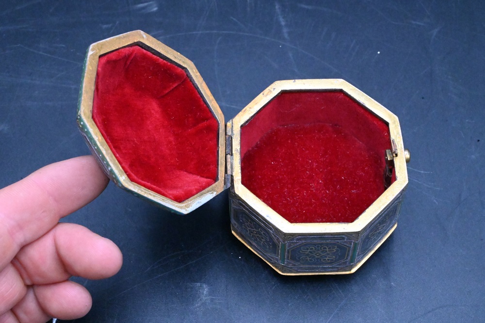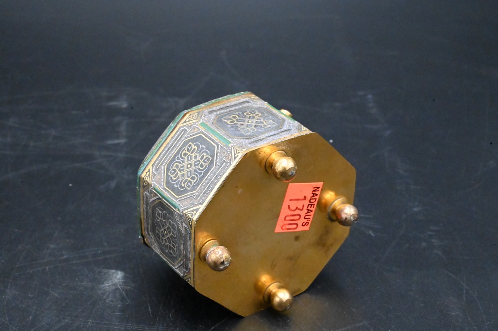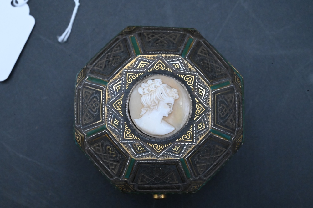 Russian Niello Enameled and Inlaid Box, octagon shape with cameo mounted top cover, height 3 inches top 3″ x 3″.