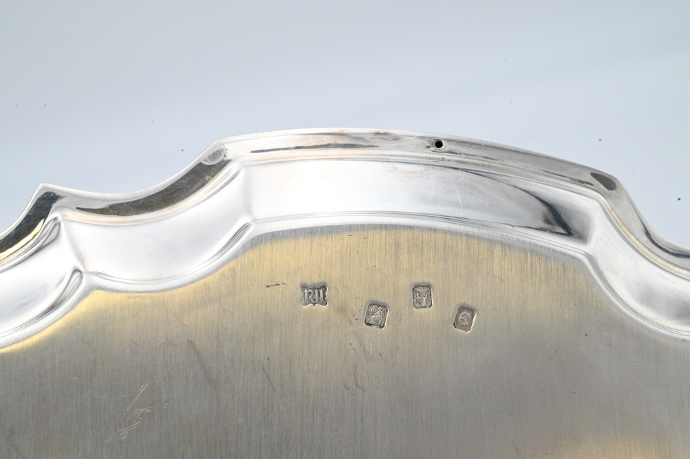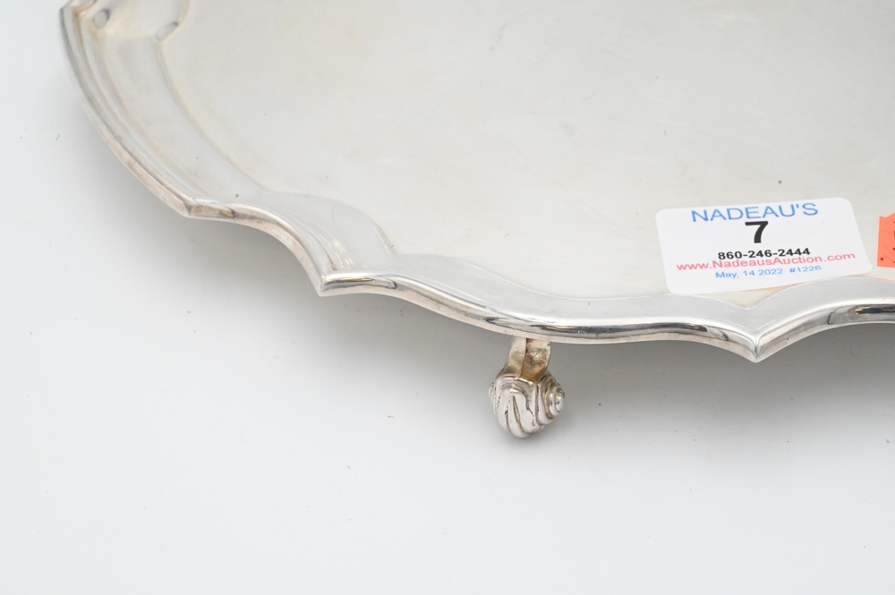 Lot 7: Silver Salver, on scrolled feet, diameter 12 inches, 23.2 t.oz. Provenance: Collections of Norma Reilly, New Jersey.