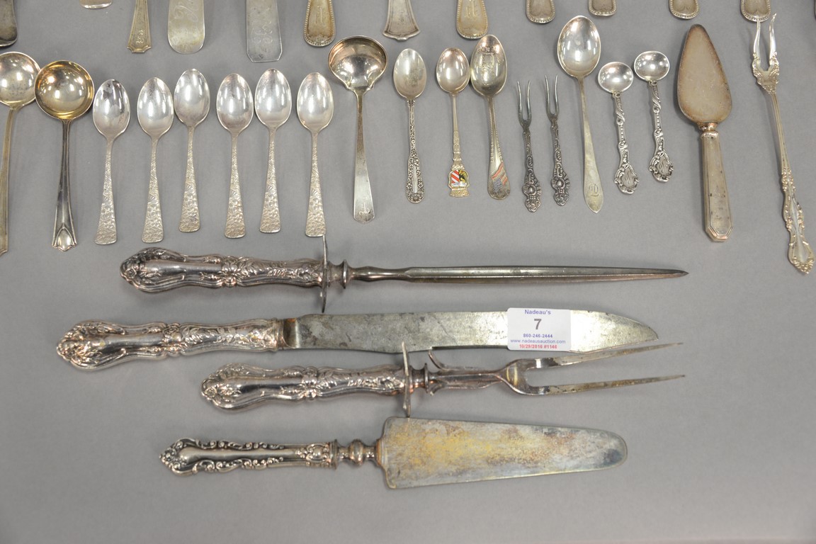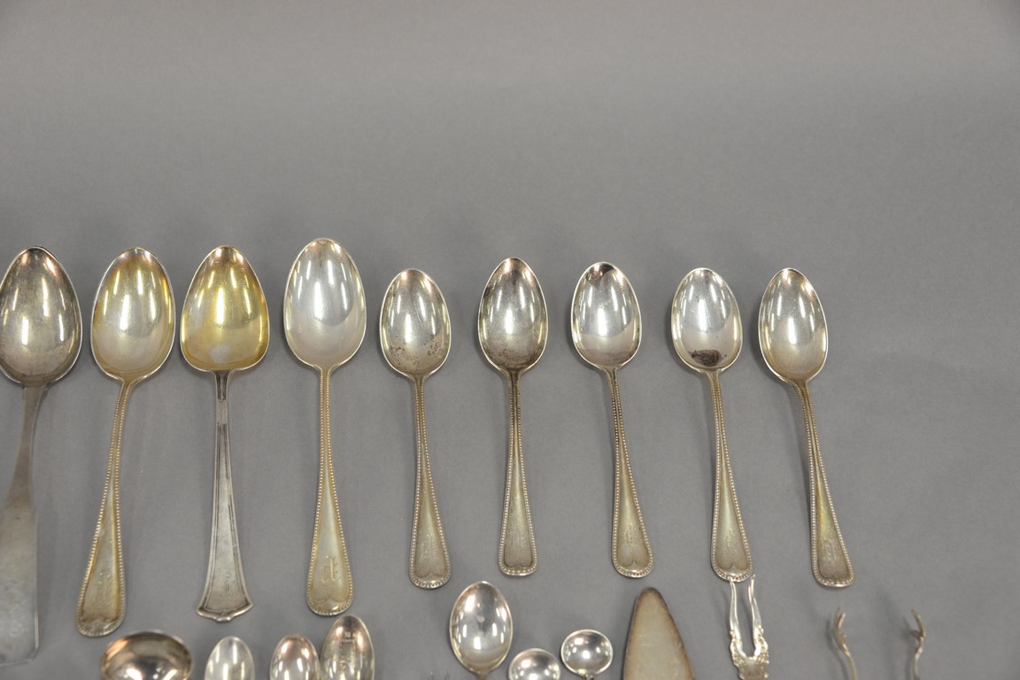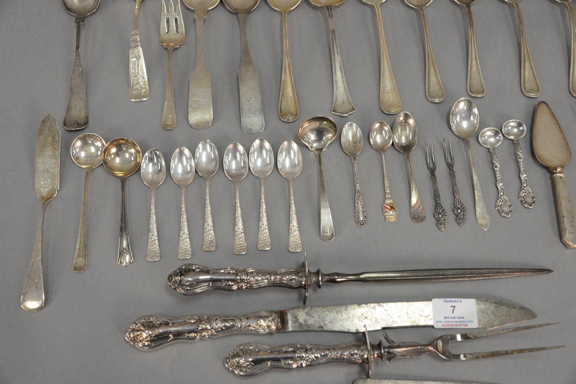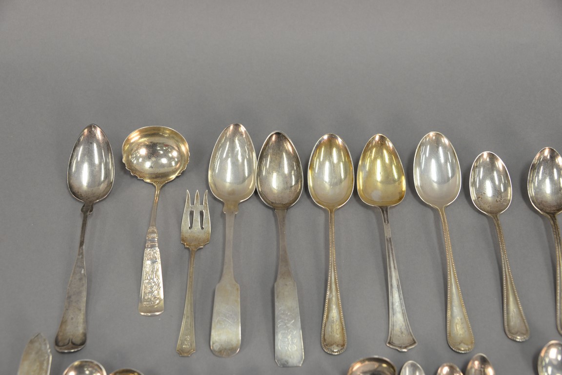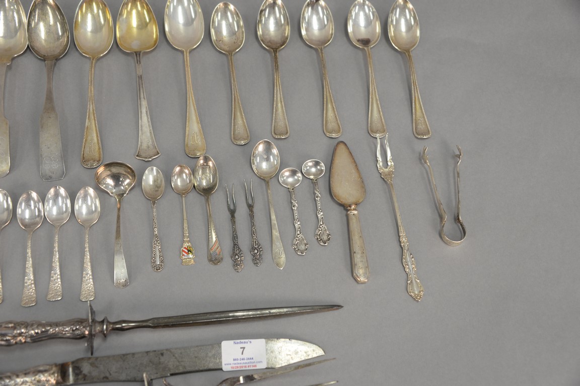Lot 7: Sterling silver flatware with two large coin silver spoons. 31.06 t oz plus four large weighted handles.