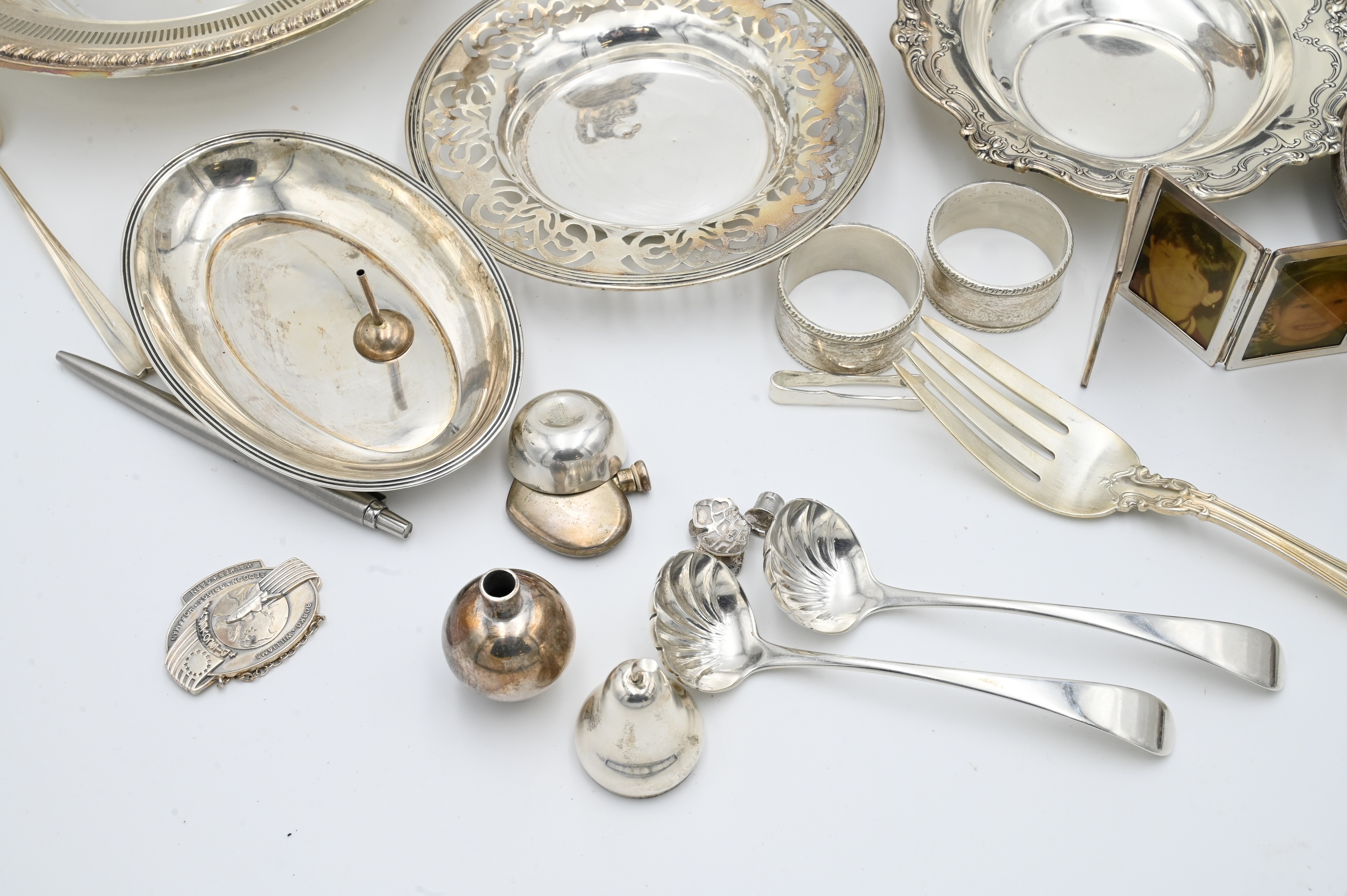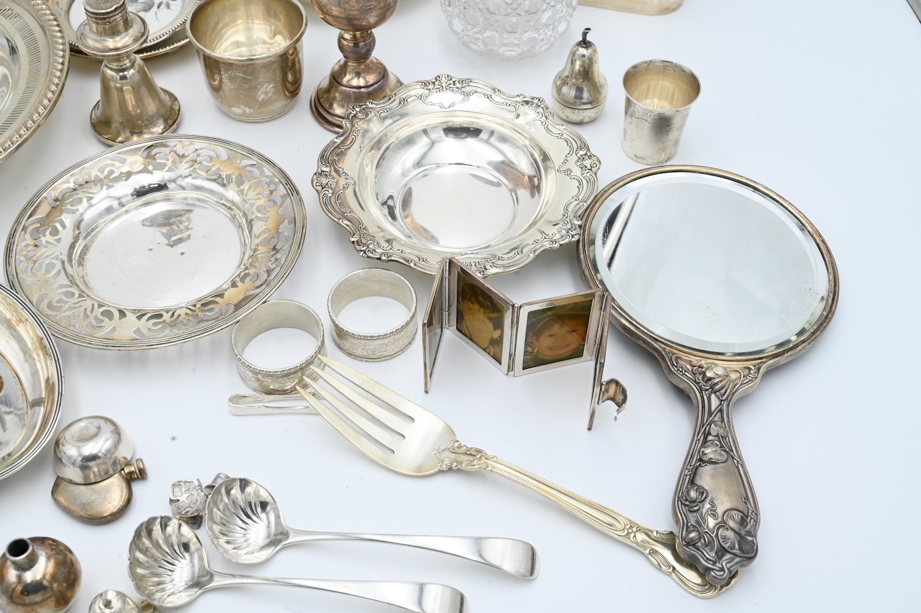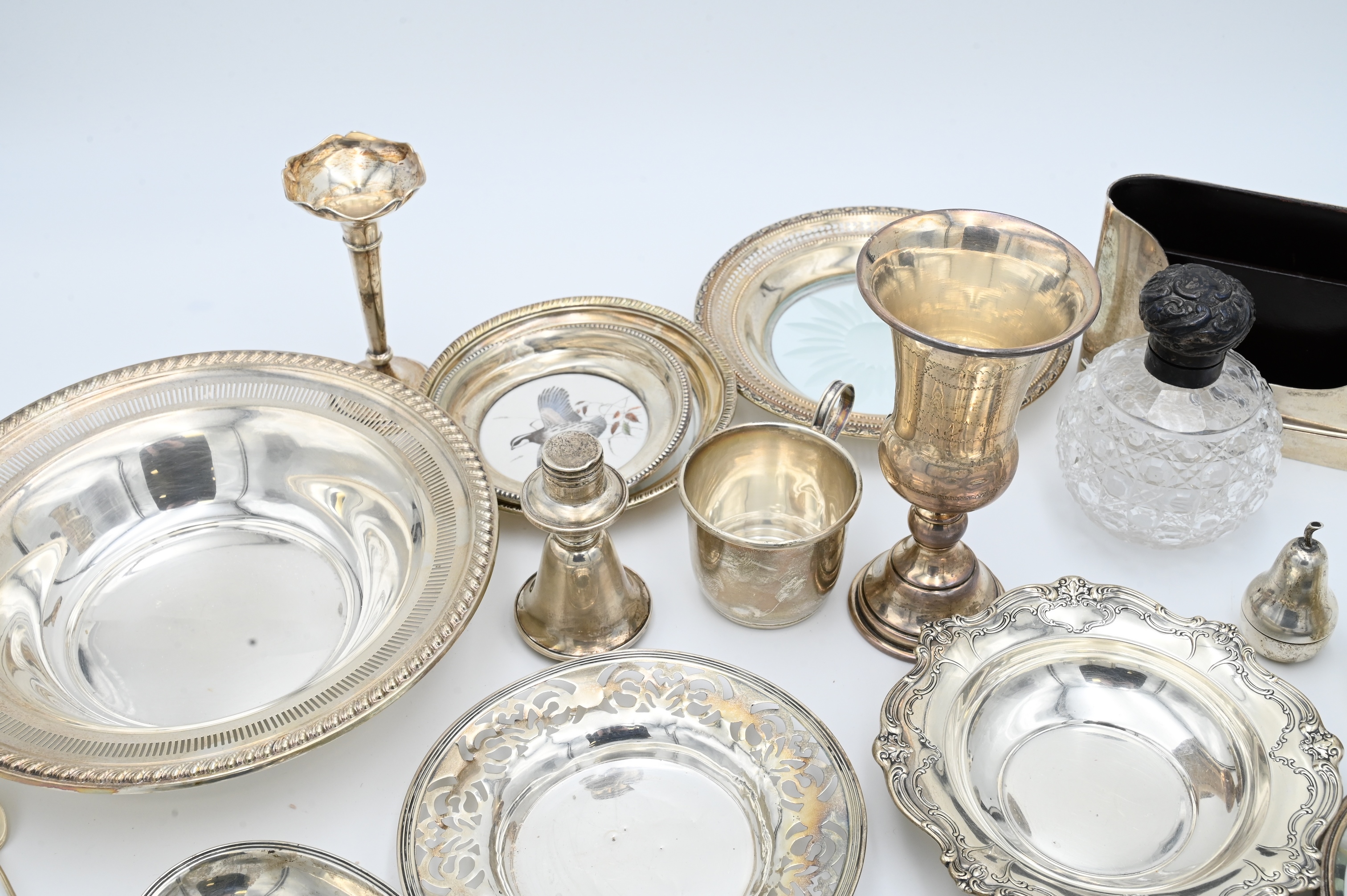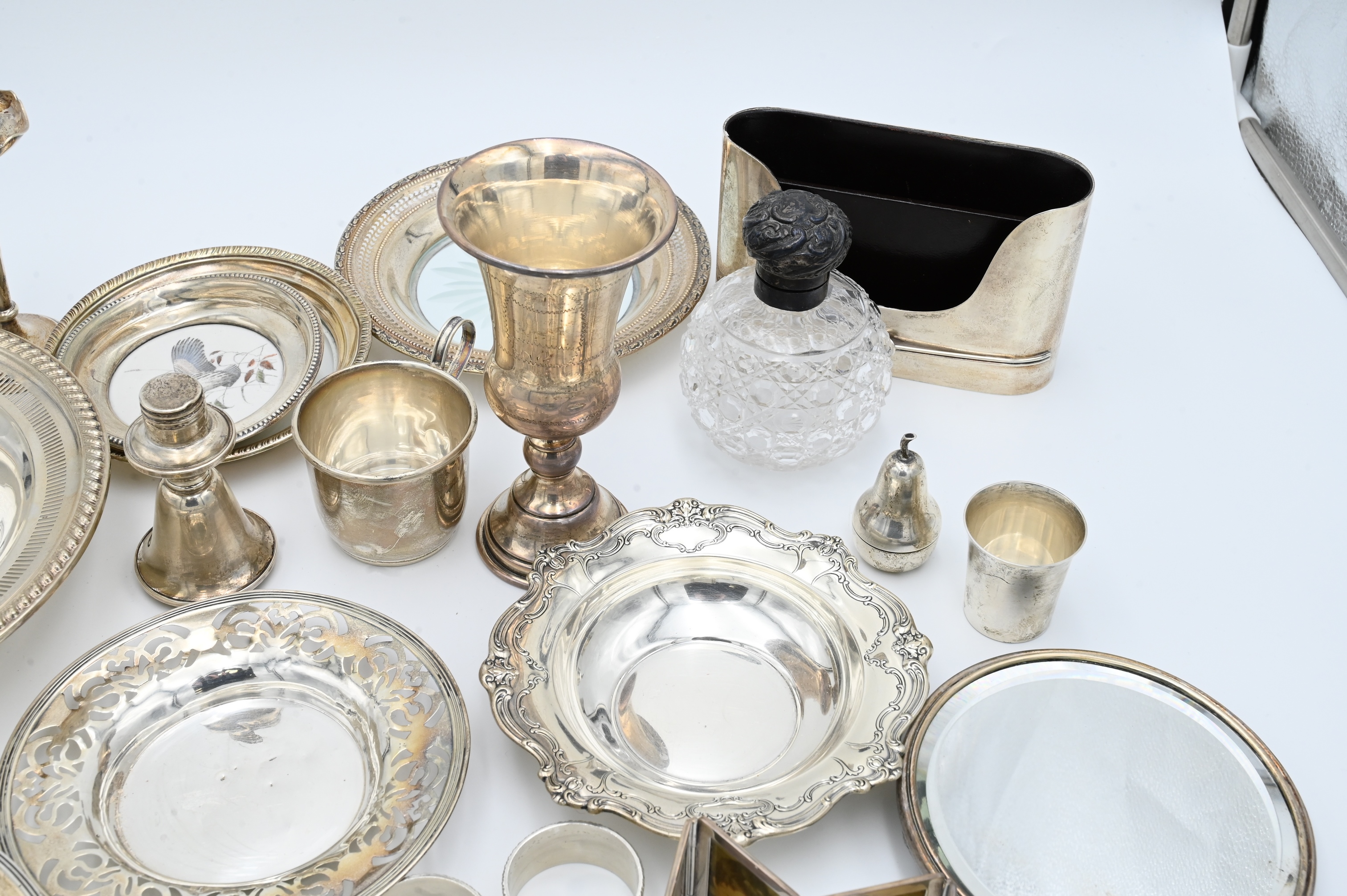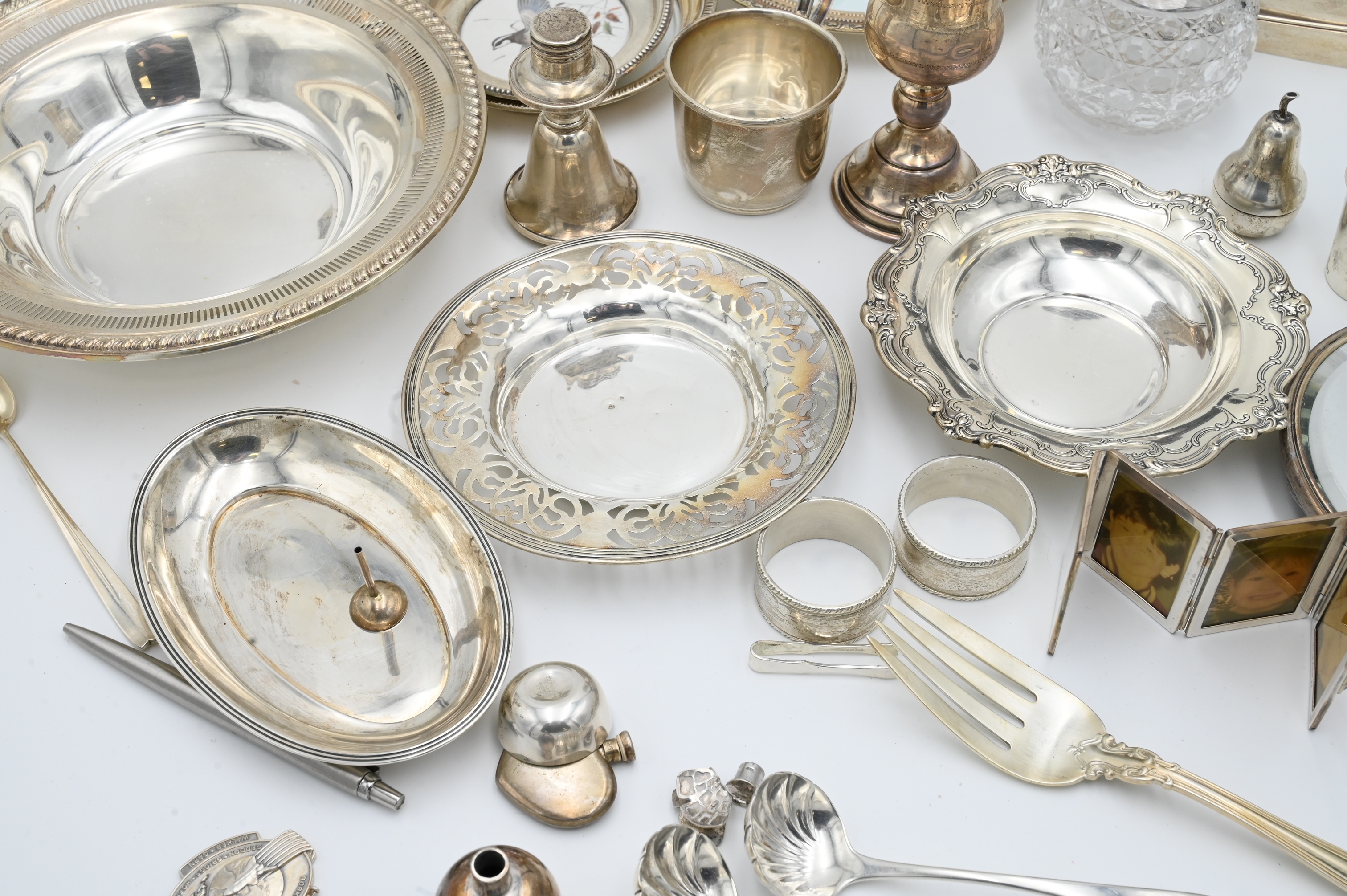 Sterling Silver Lot, to include bowls, cups, flatware, small fold-out picture frame, several Tiffany & Company pieces, along with a Tiffany letter box, plus weighted pieces, 32 t.oz. Provenance: Property from a private New York collection sold to benefit charitable foundations.