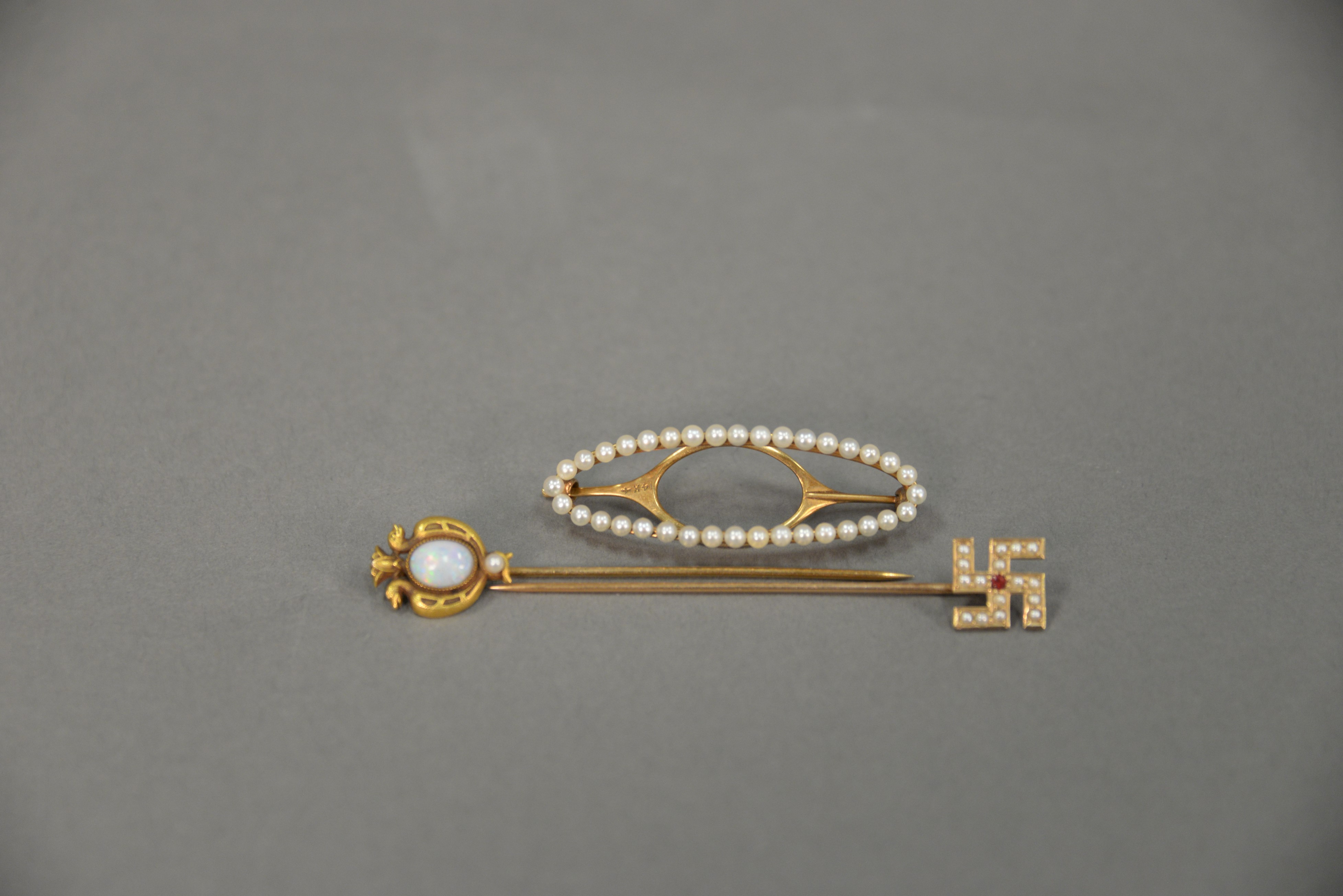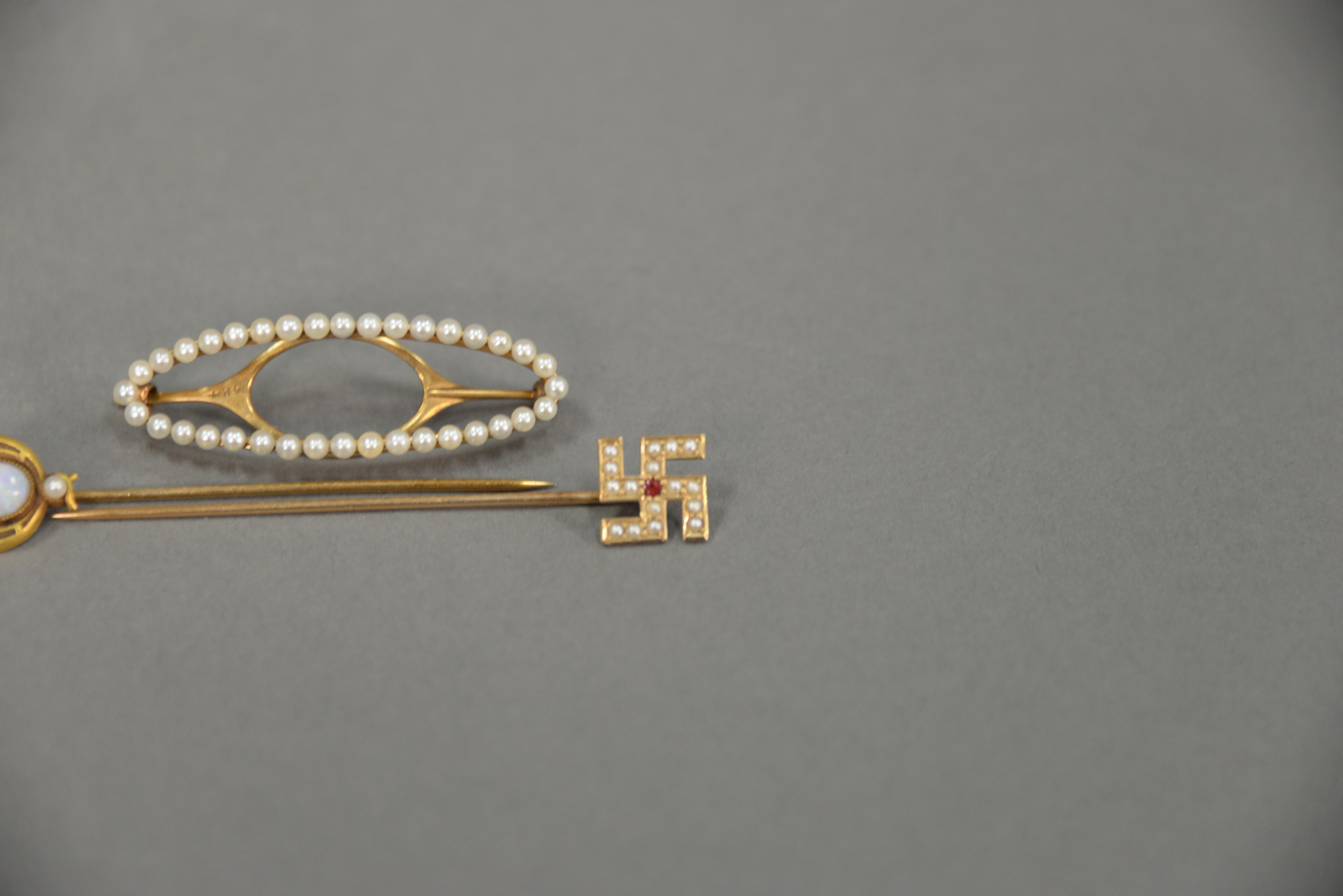 Three piece lot 14K gold pearl pin and two stick pins, 7.5 grams.