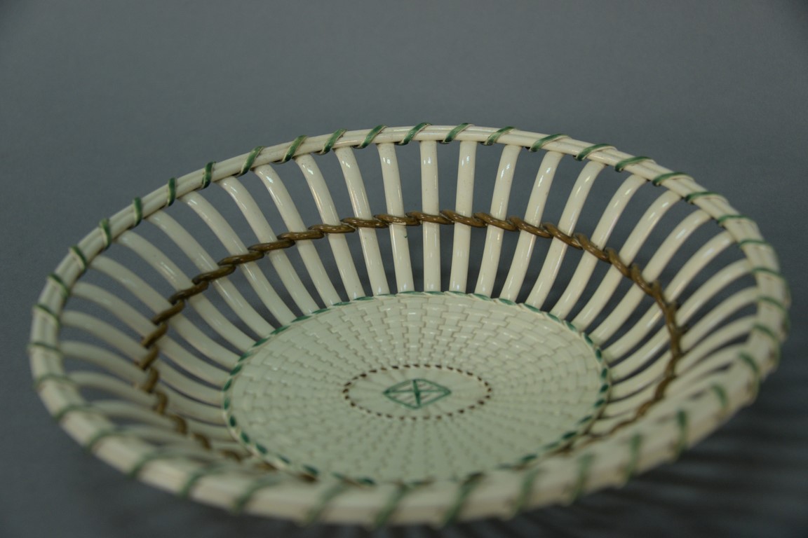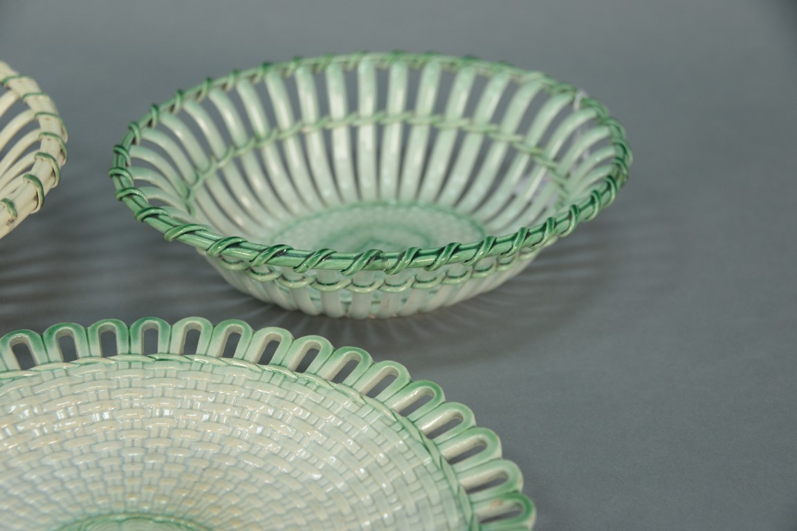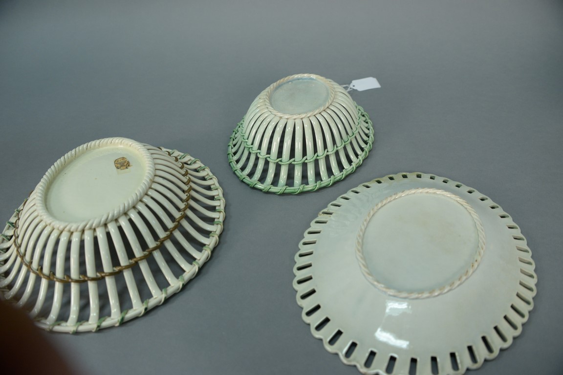 Lot 7: Three piece lot of soft paste including two oval baskets and one underplate, largest basket marked Wedgwood with label on bottom Dea…