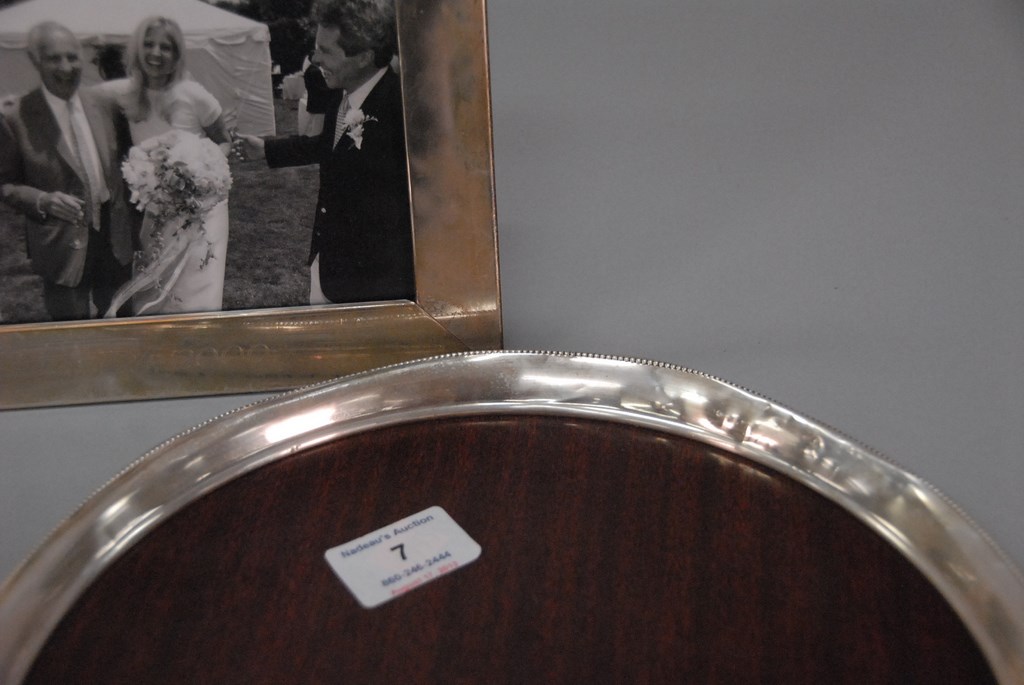 Three piece lot to include two trays with sterling silver trim and sterling silver frame.