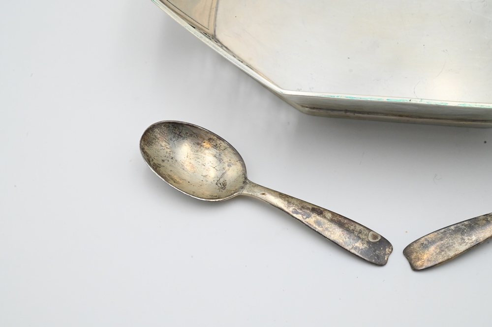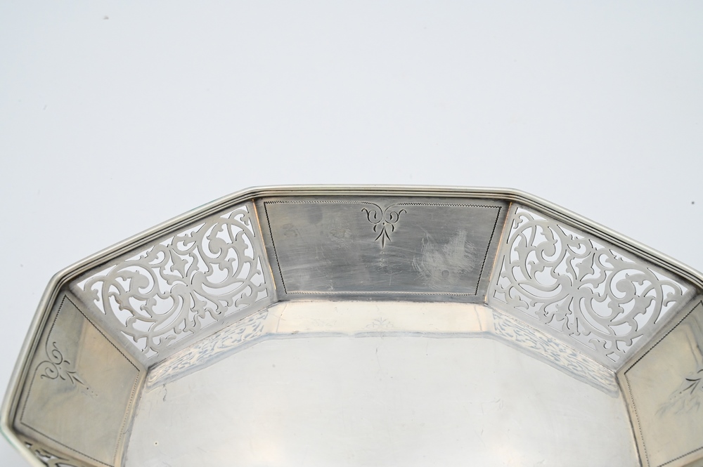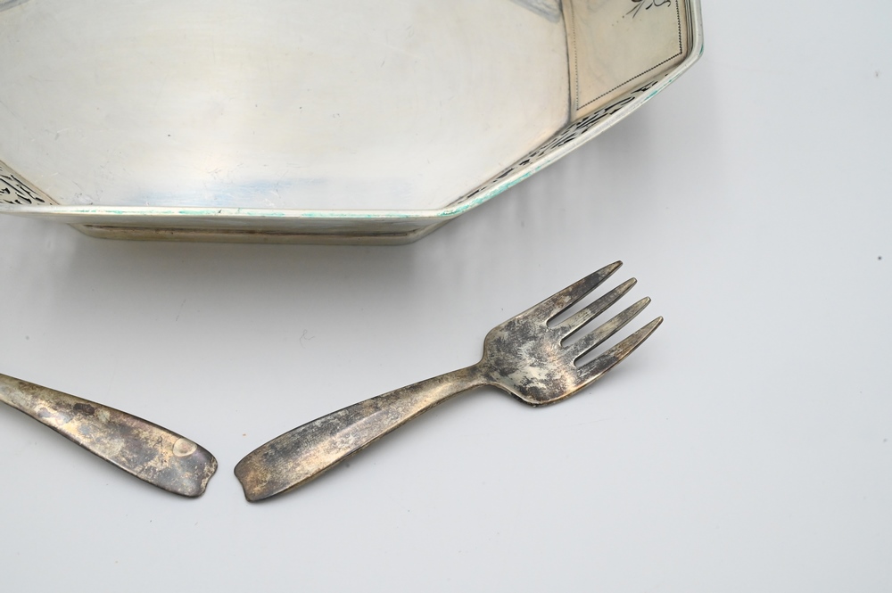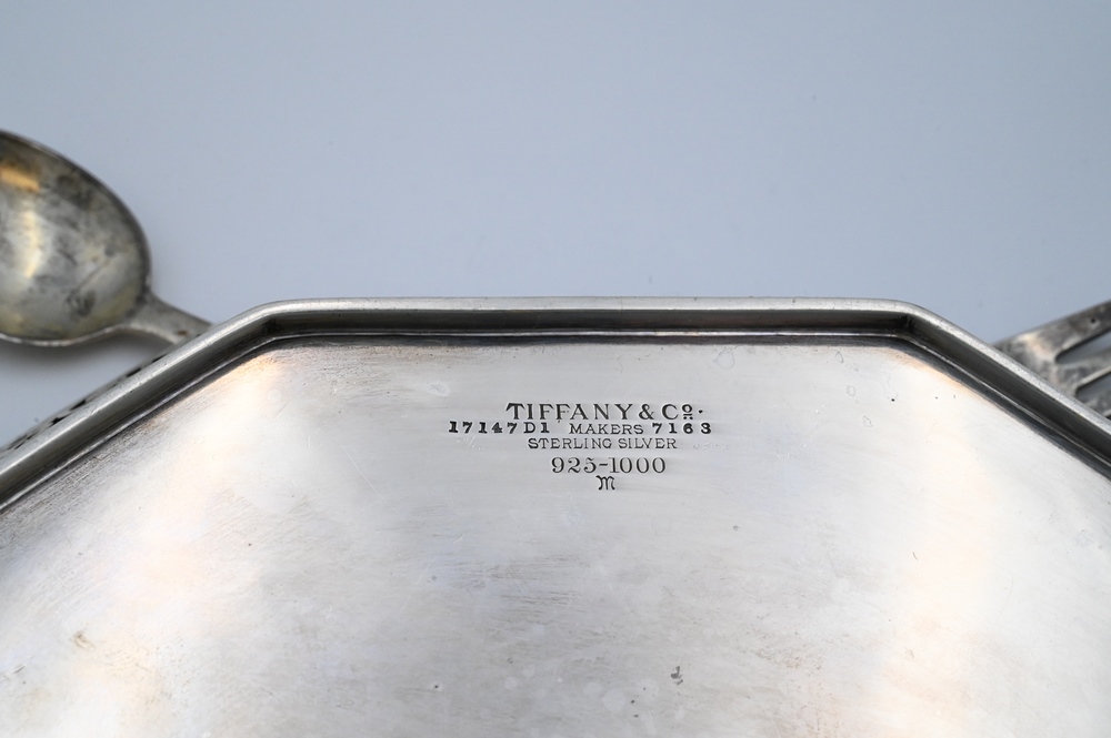 Lot 7: Three Piece Sterling Silver Tiffany and Company Lot, to include baby spoon and fork with box, along with reticulated eight sided dish, 11.9 t. oz.