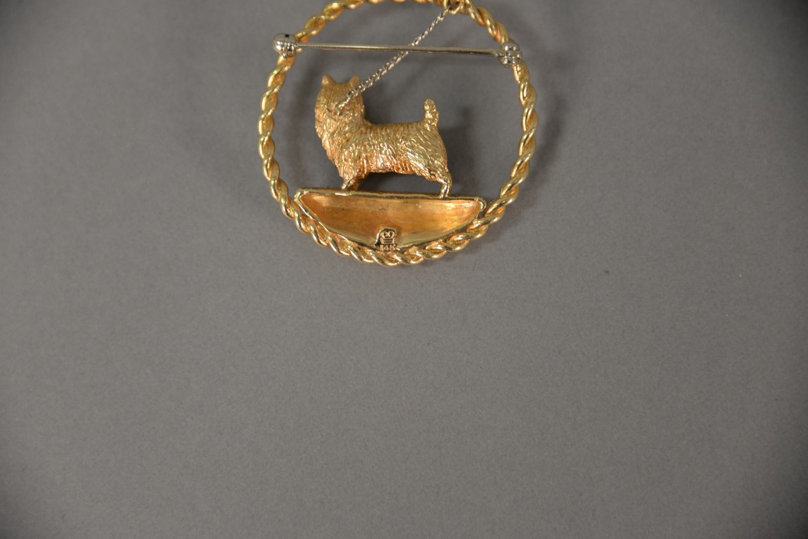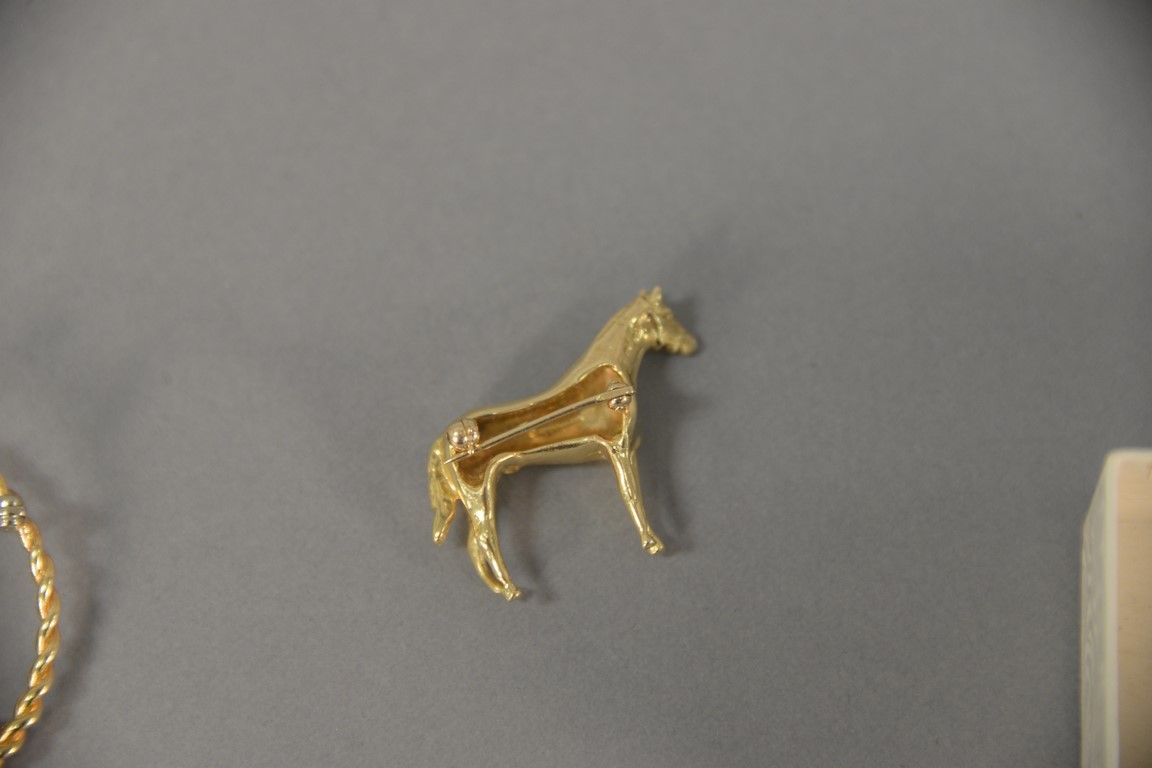 Two 14K gold pins, dog on leash and horse. diam. 1 1/2in. and lg. 1in., 23.6 grams