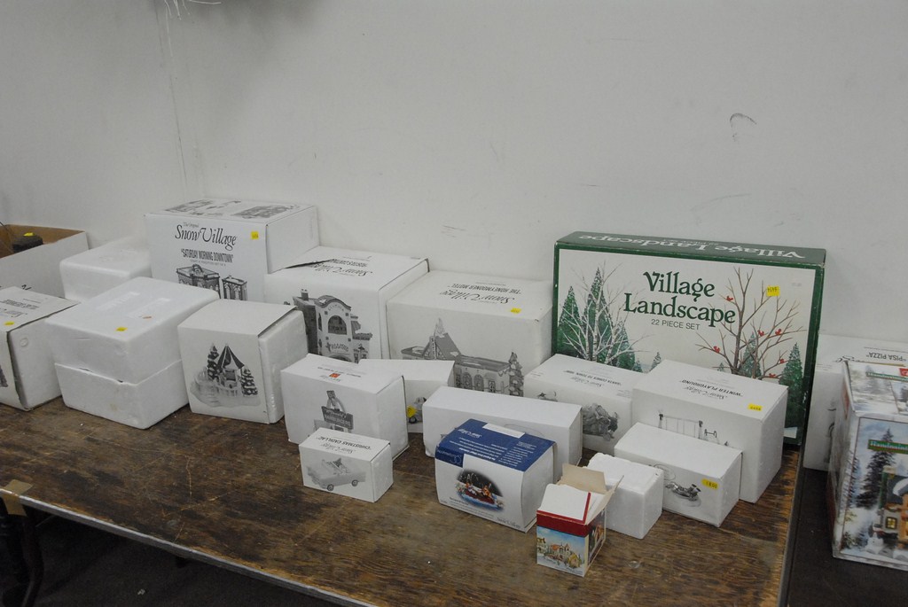 Two table lots of Dept. 56 Snow Village buildings and accessories in original boxes.