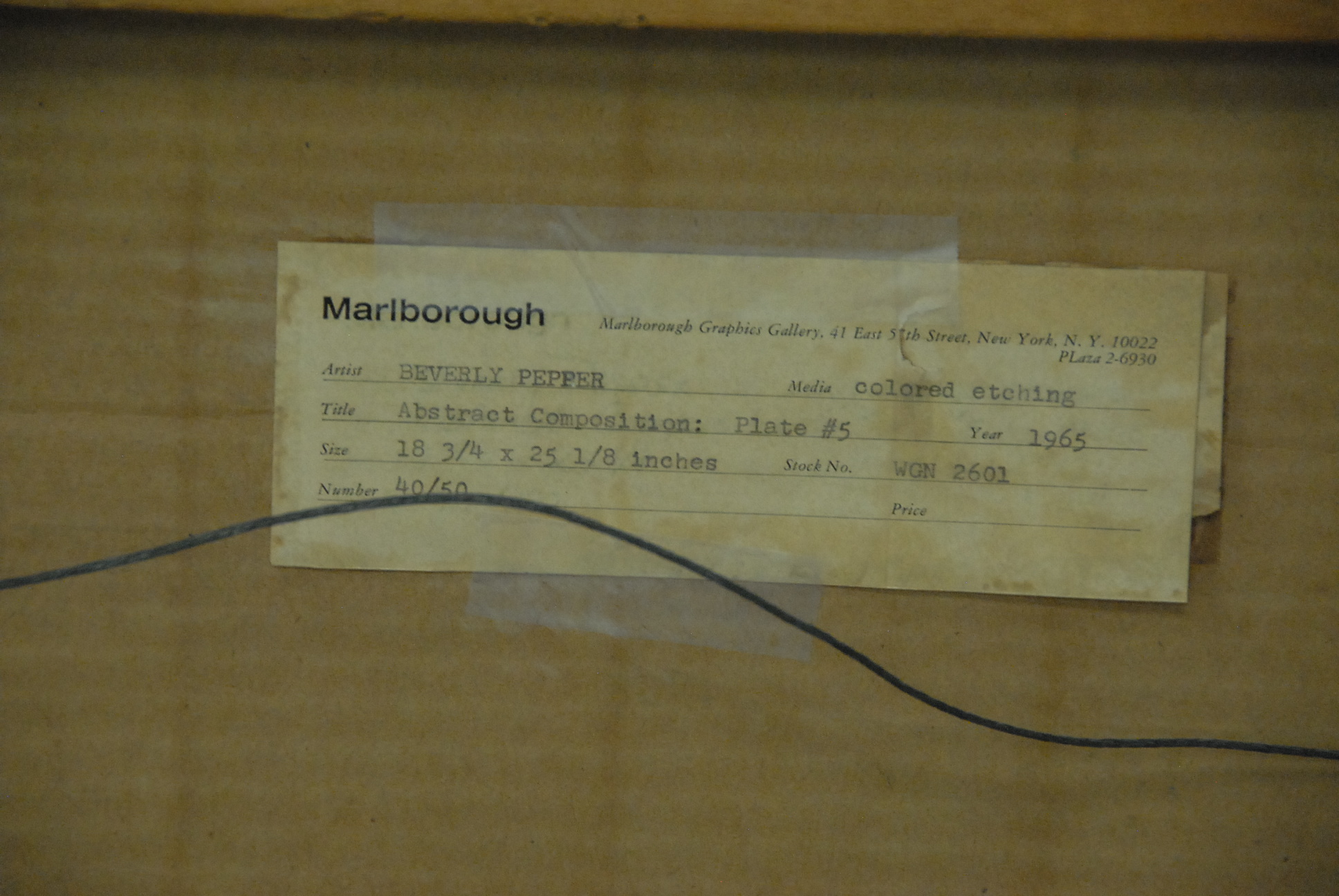 Beverly Pepper 1922 Abstract Composition: plate #5 colored etching, signed lower right Beverly Pepper ’64, numbered lower left 40/50, having Marlborough Graphics Gallery label on reverse, 18 3/4 x 25 1/8.
