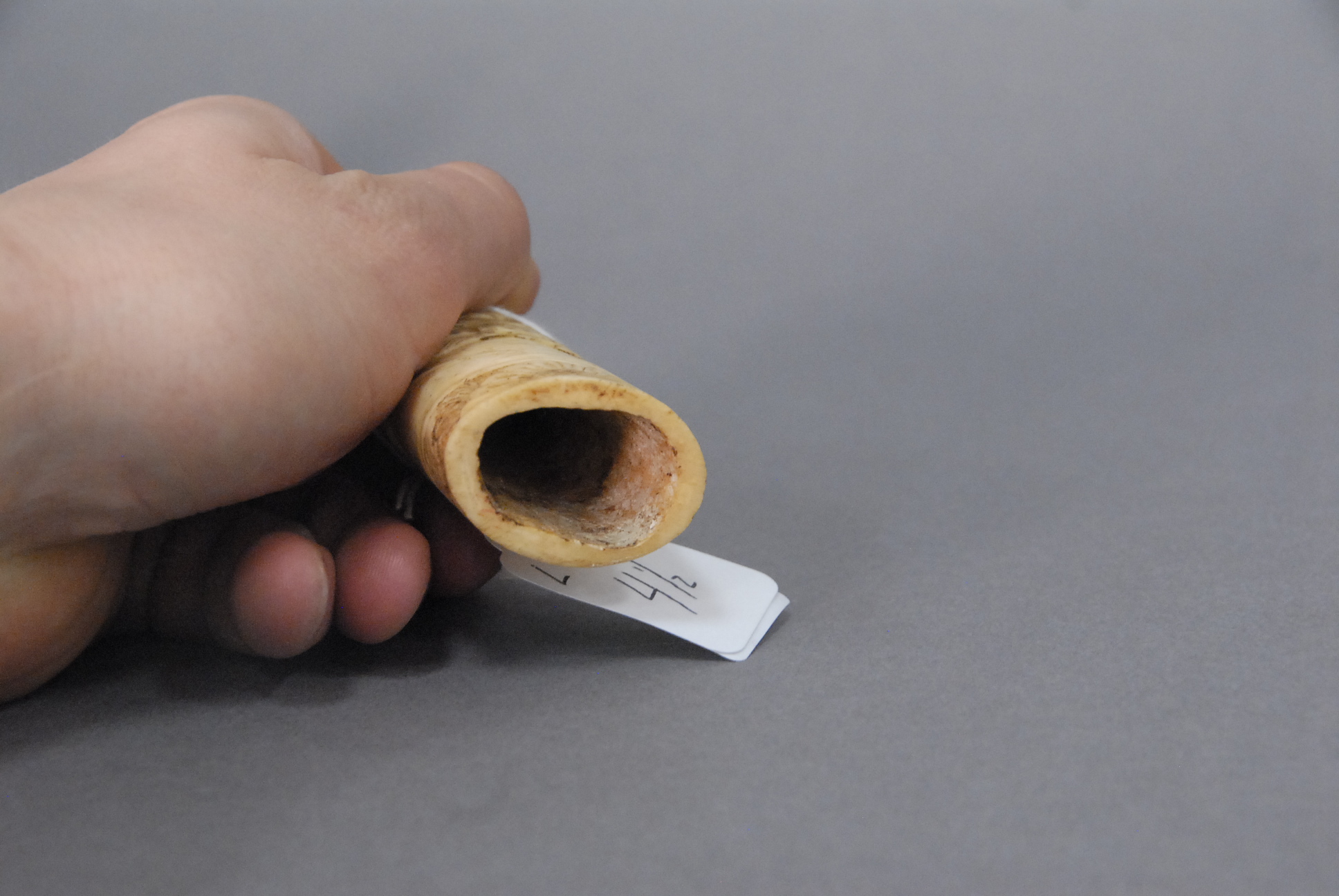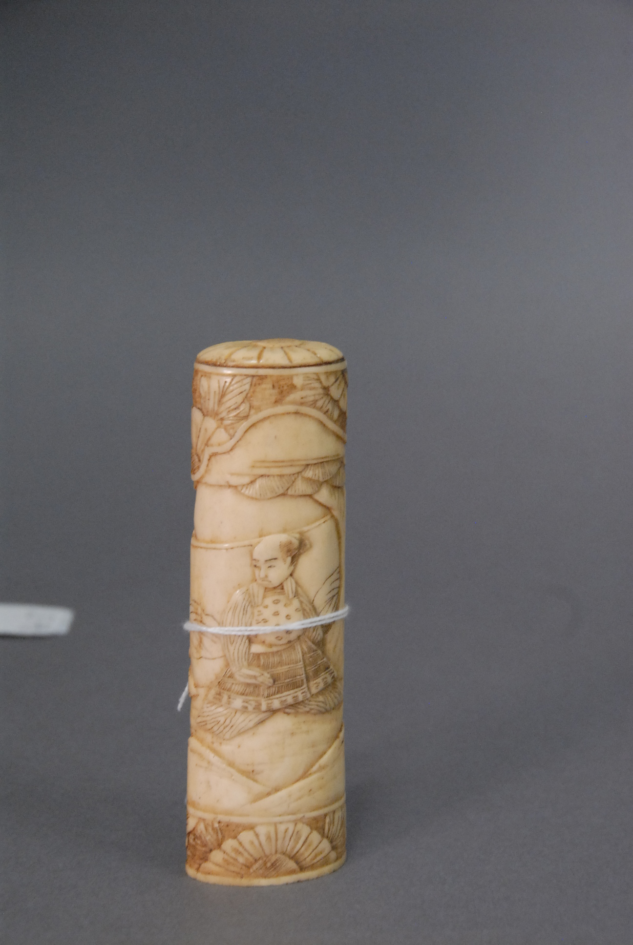 Carved bone sword handle, carved with two samurai warriors and a man, lg. 4 1/2.