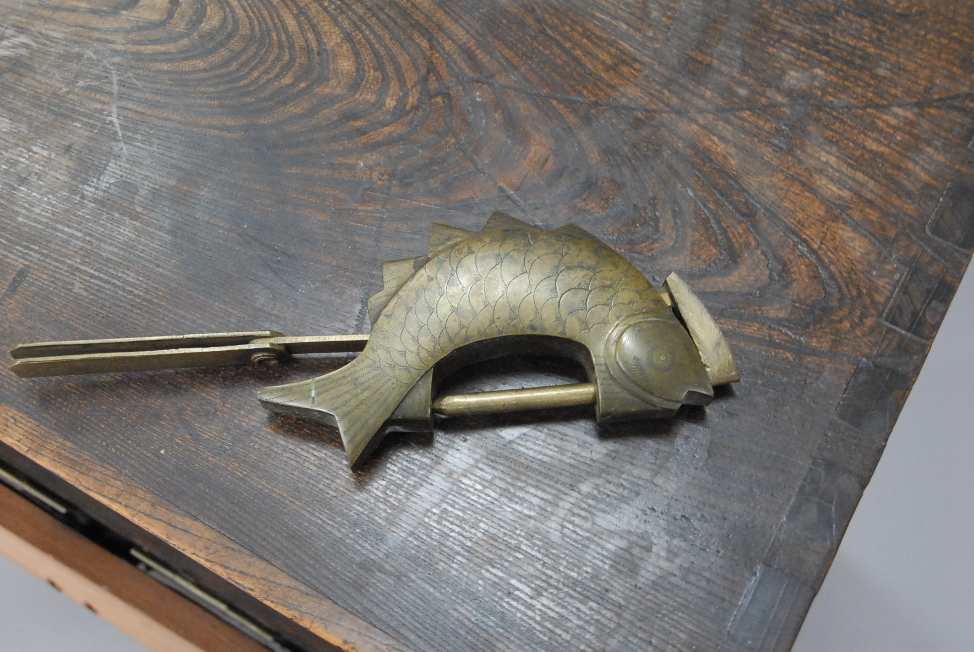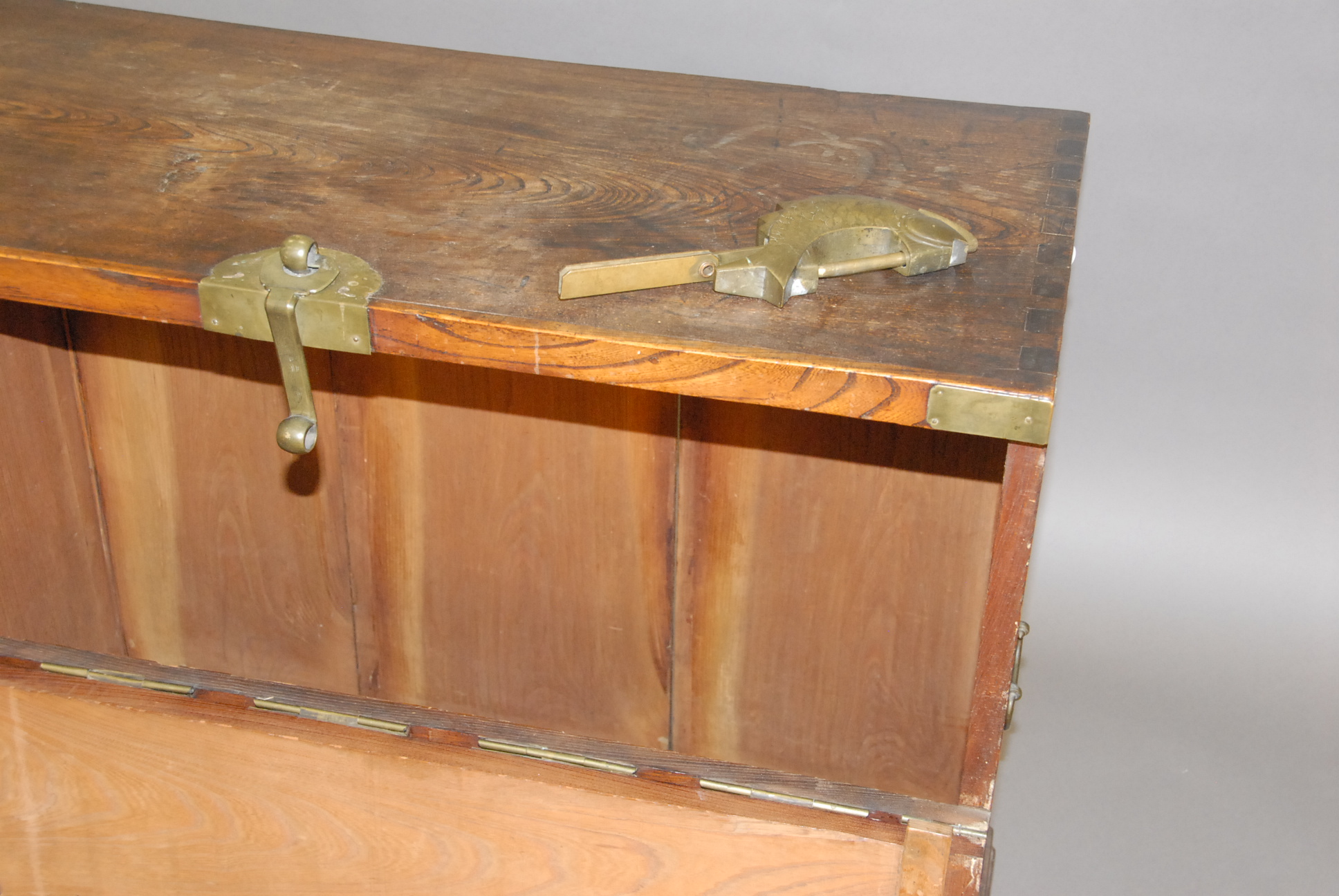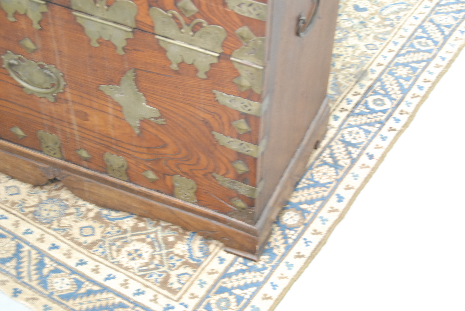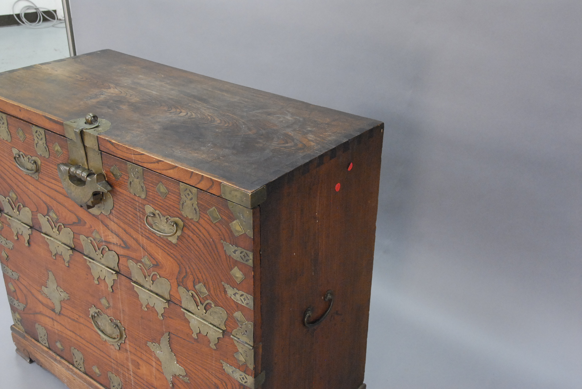 Far Eastern chest with fall front with brass mounts of butterflies and cranes.