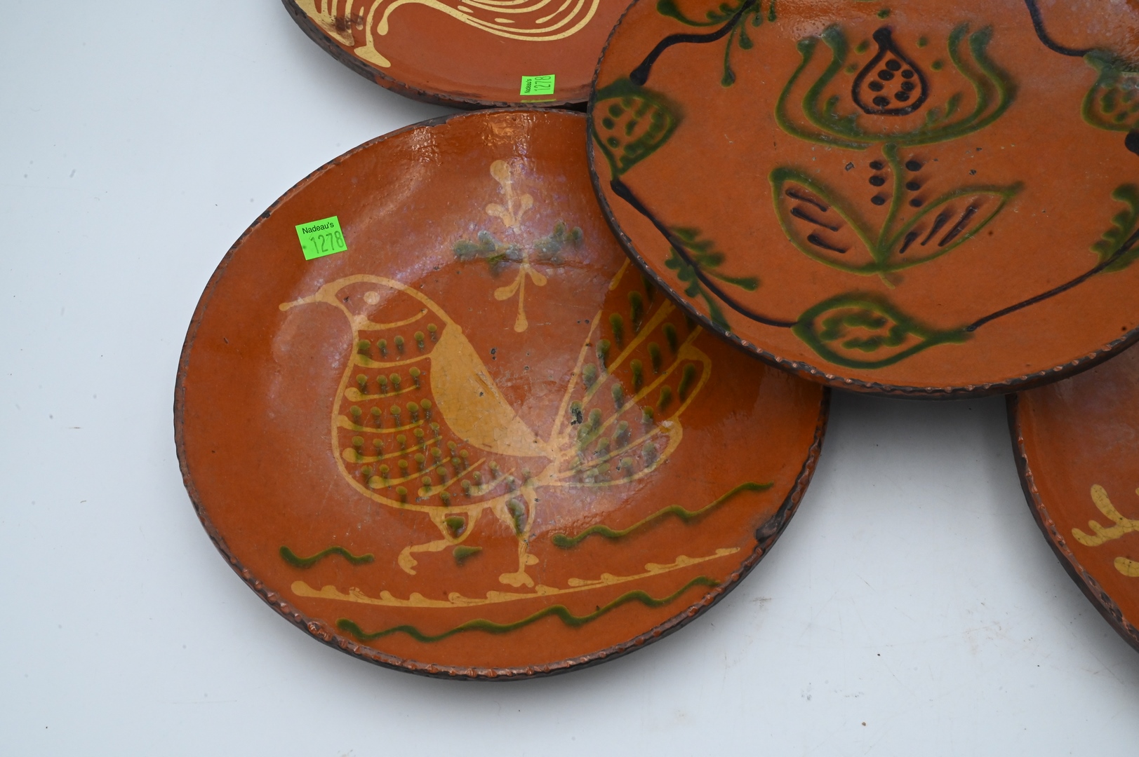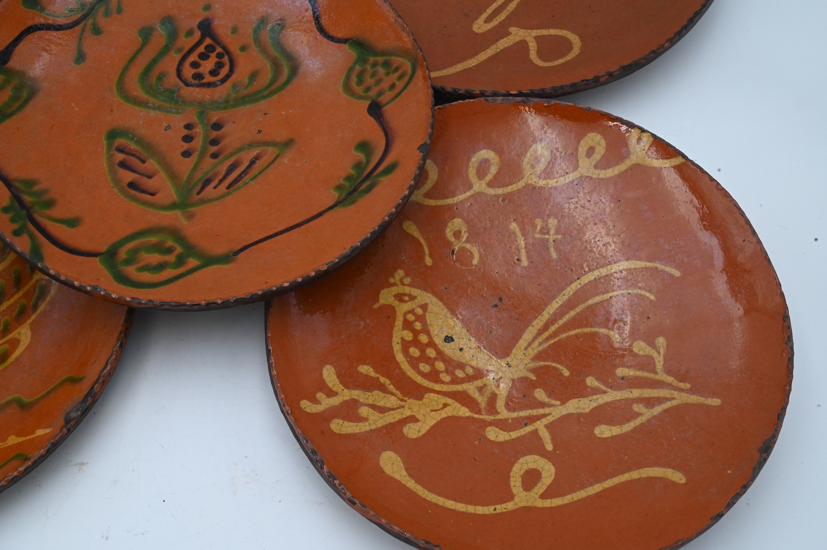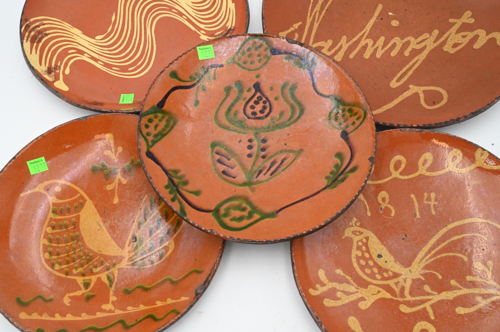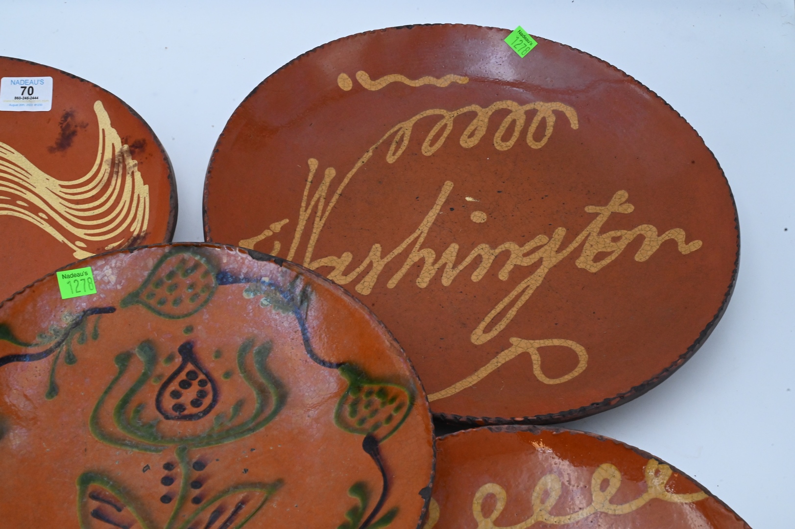 Five Greg Shooner Redware Slipware Chargers, having all different painted designs in Early American manner, all signed on bottom, largest diameter 14 inches. Provenance: Estate of Peter Tillou, Litchfield, Connecticut.