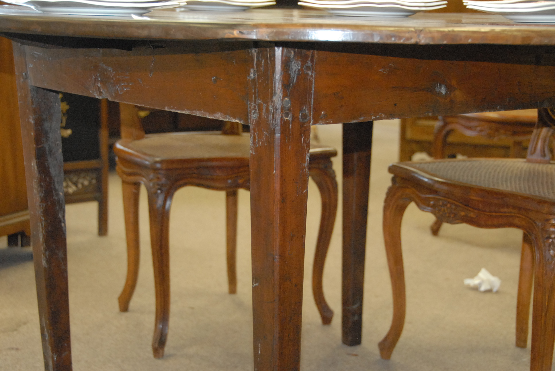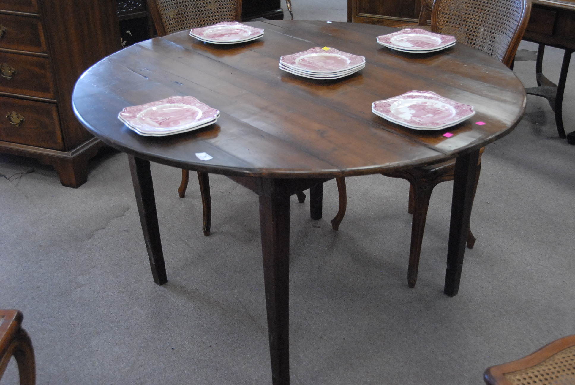 Fruitwood round table on square tapered legs, dia. 50 1/2in.