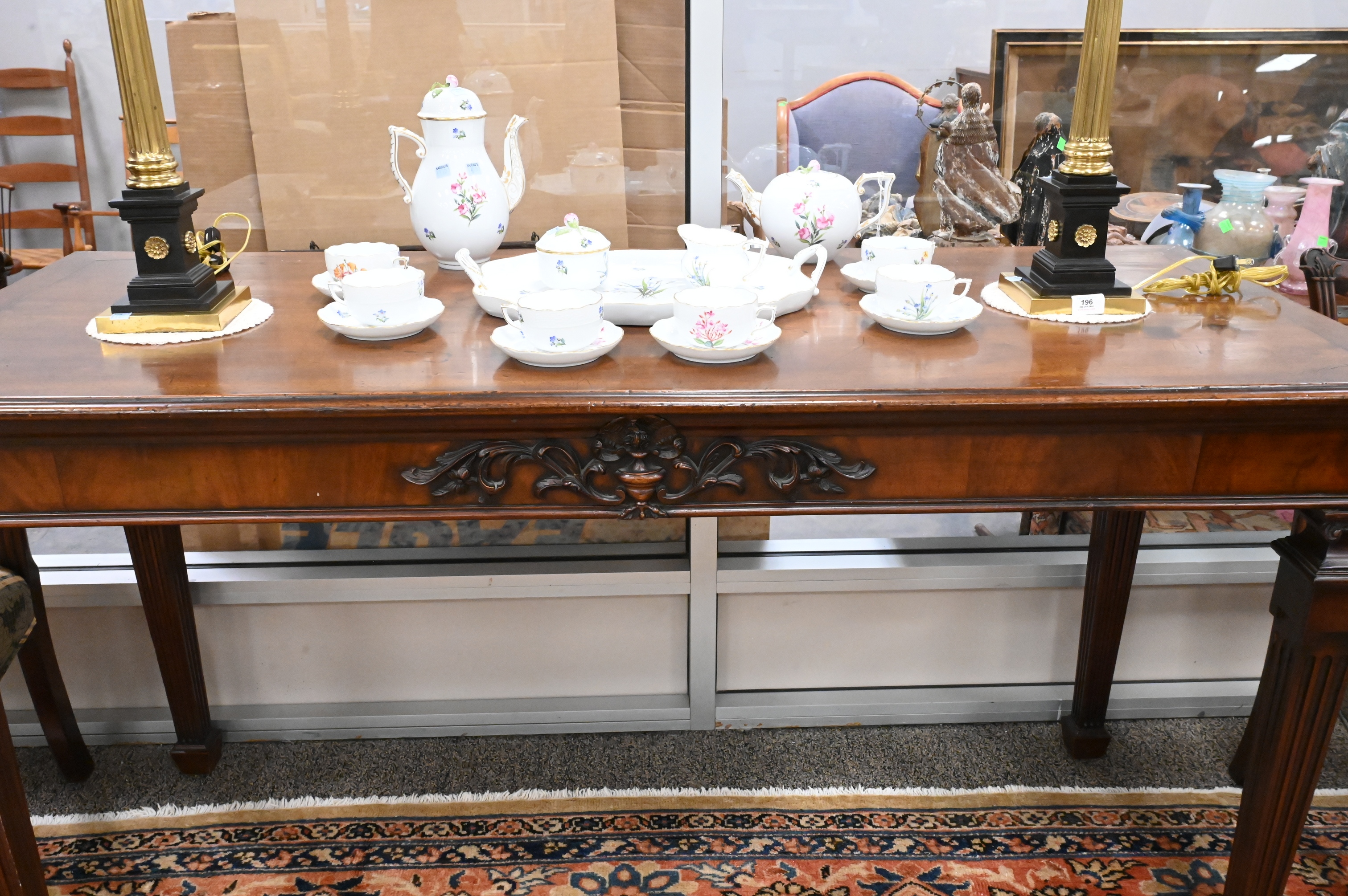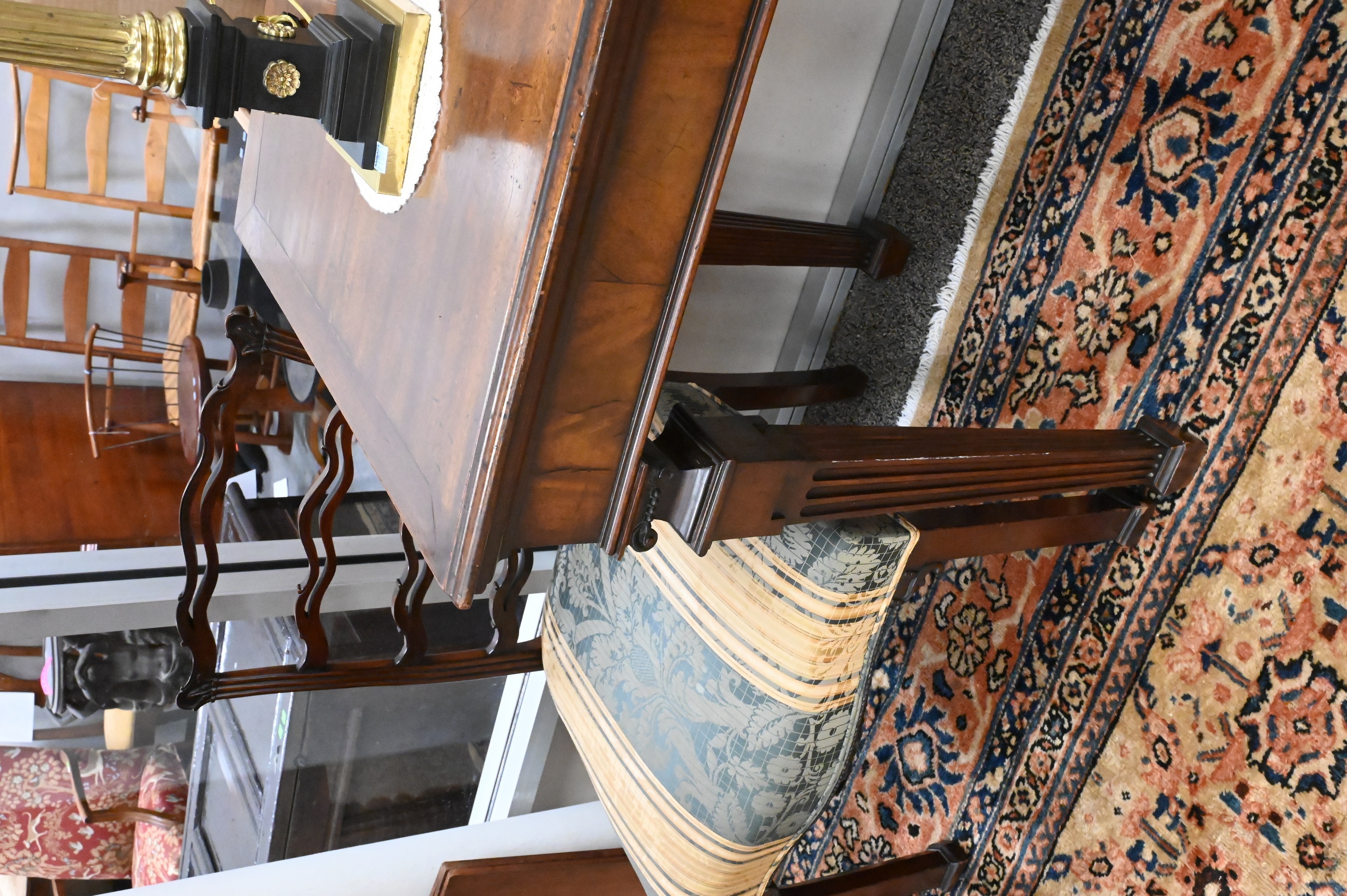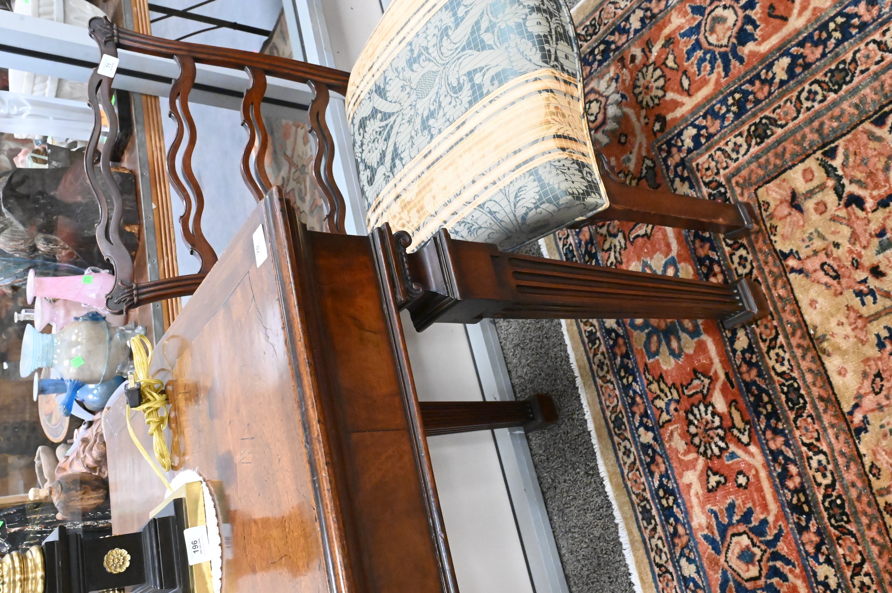 having rectangular top with molded edge above a carved frieze centered by a pierced foliate scroll apron, reeded square tapering legs ending in block feet, late 18th century