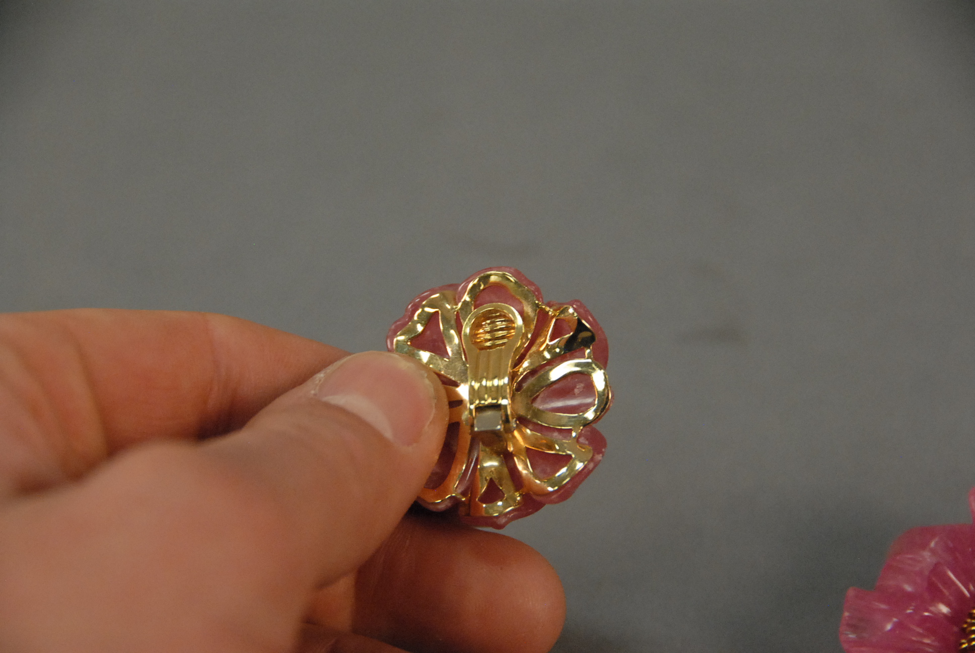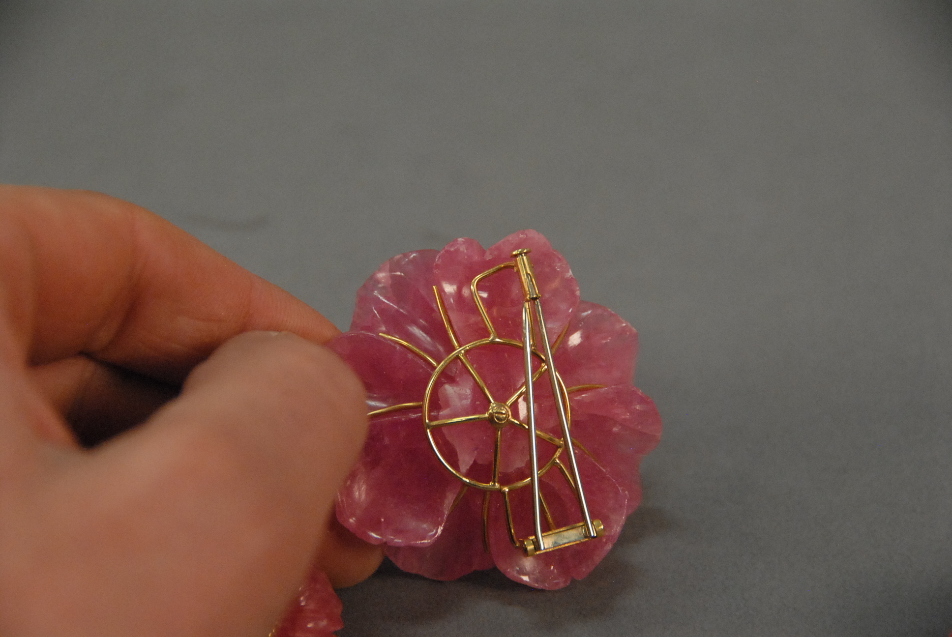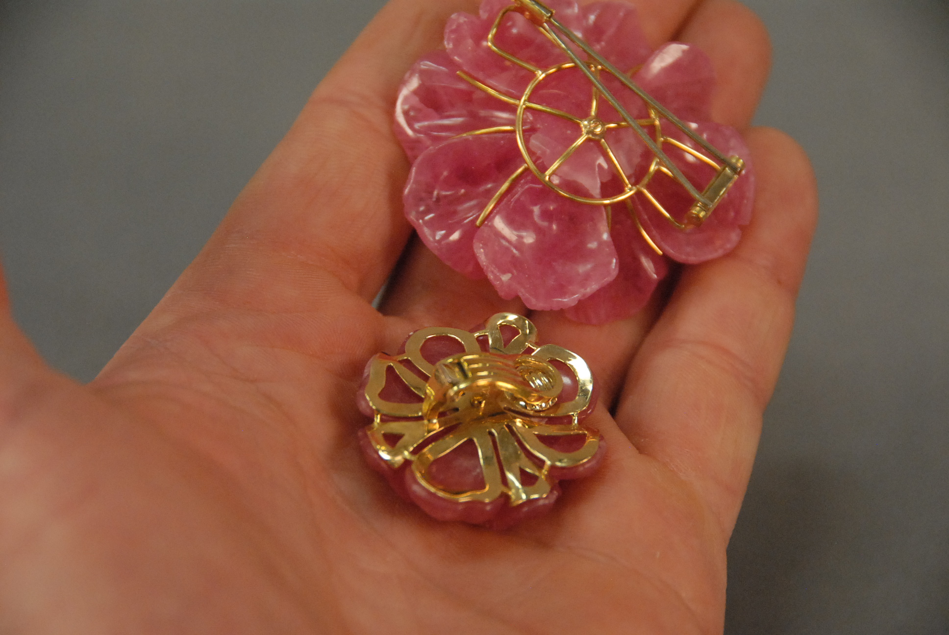 Lot 70: Greenleaf & Crosby three piece set of rhodochrosite and 18K gold flower jewelry with carved brooch and pair of carved clip on earrings, each set in 18K gold with 18K gold centers, marked GC for Greenleaf and Crosby. brooch: dia. 2in. earrings: 1 1/4