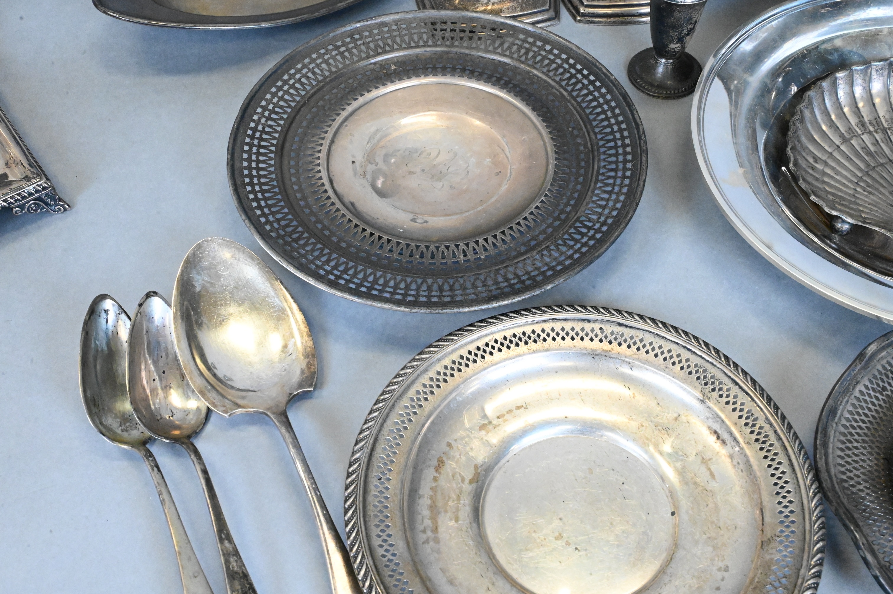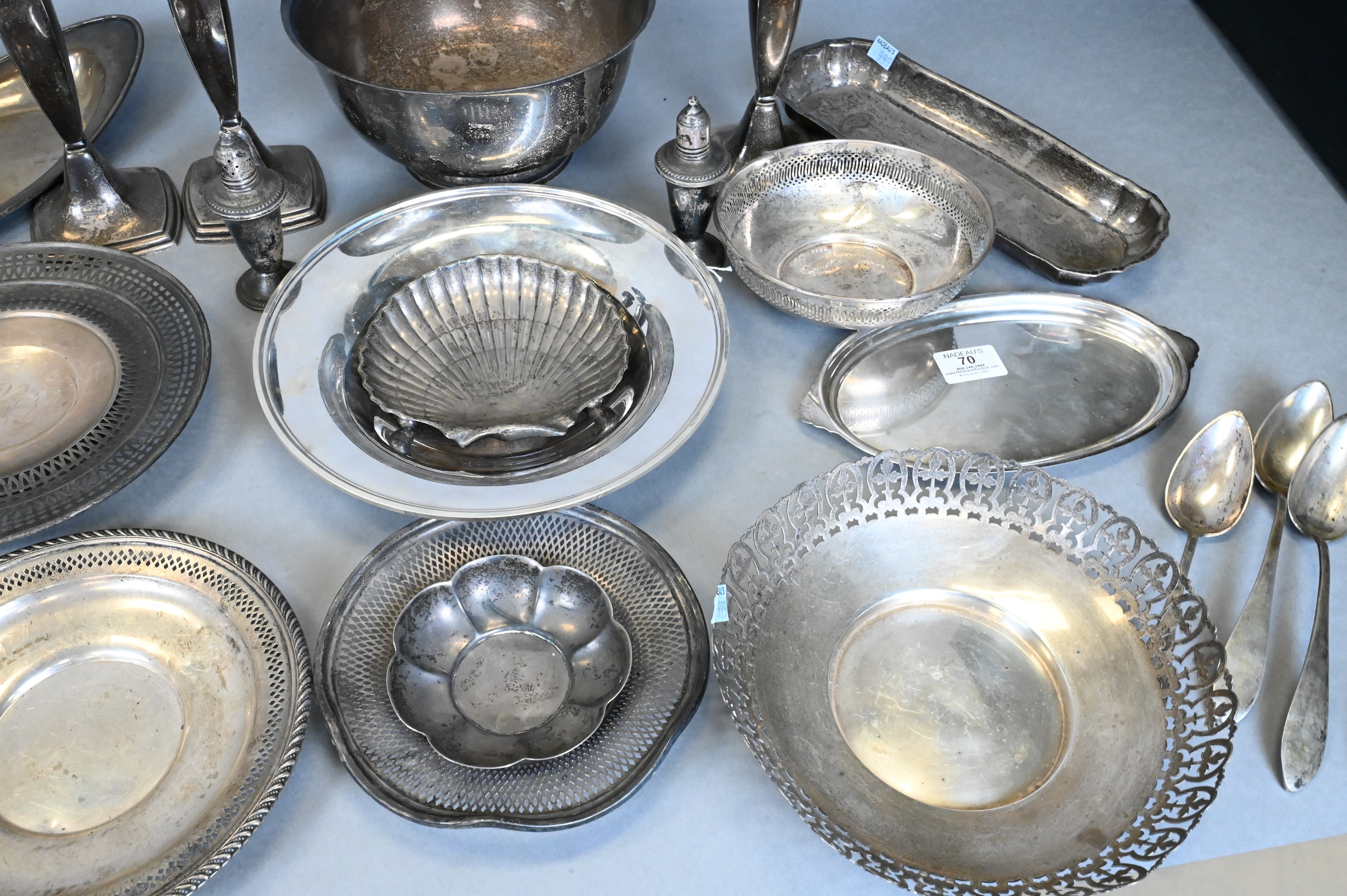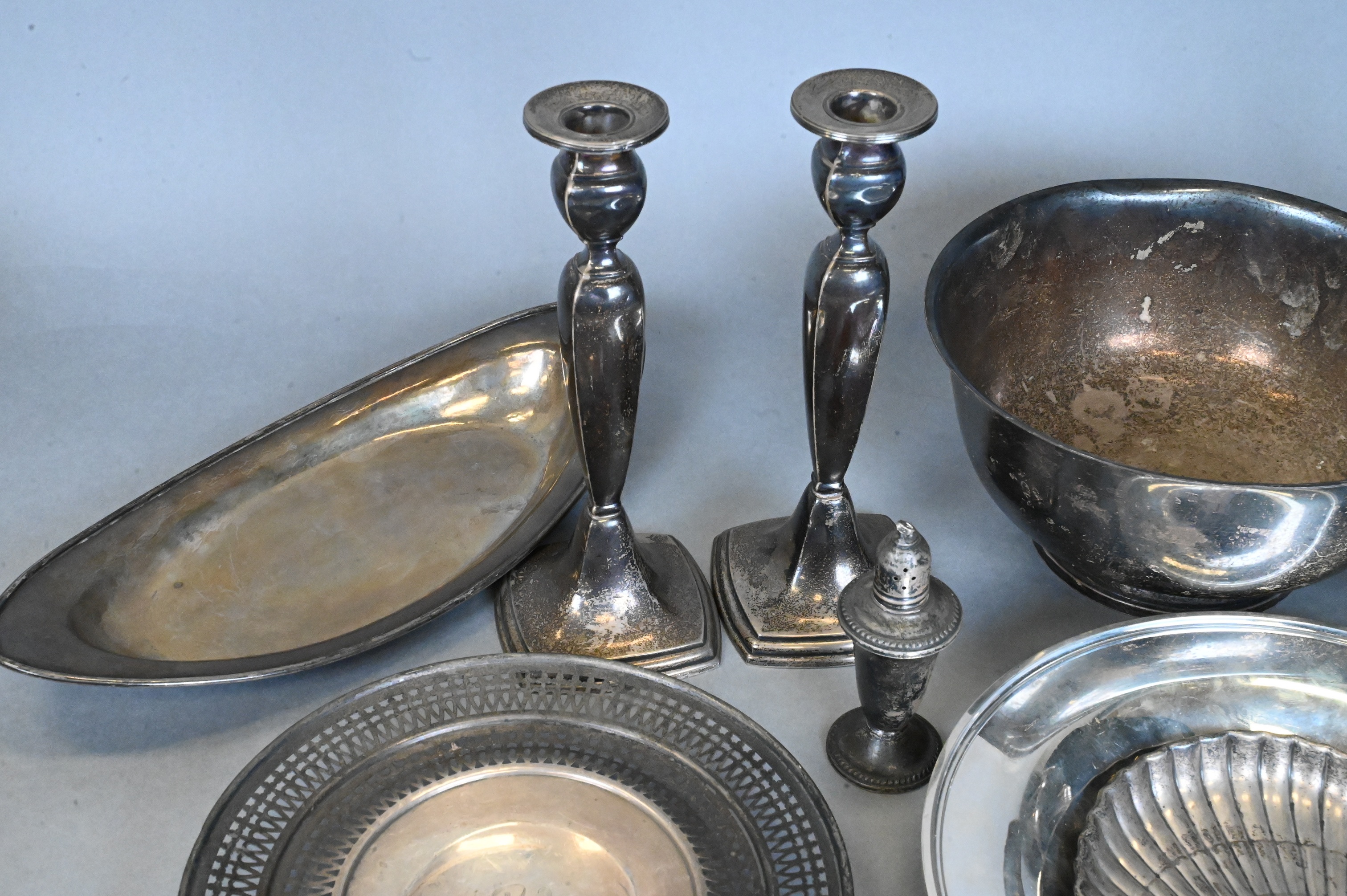 to include three candlesticks and a pair of salt/pepper shakers, along with seven continental silver spoon six of which having Austrian and Hungarian assay marks one marked sterling, two sterling silver trays one oval and hand wrought the other square having scalloped curved ends longest 13 inches, 22.2 t.oz., along with seven sterling silver trays largest diameter 10 inches, sterling silver Paul Revere reproduction bowl height 4 1/2 inches, diameter 9 inches