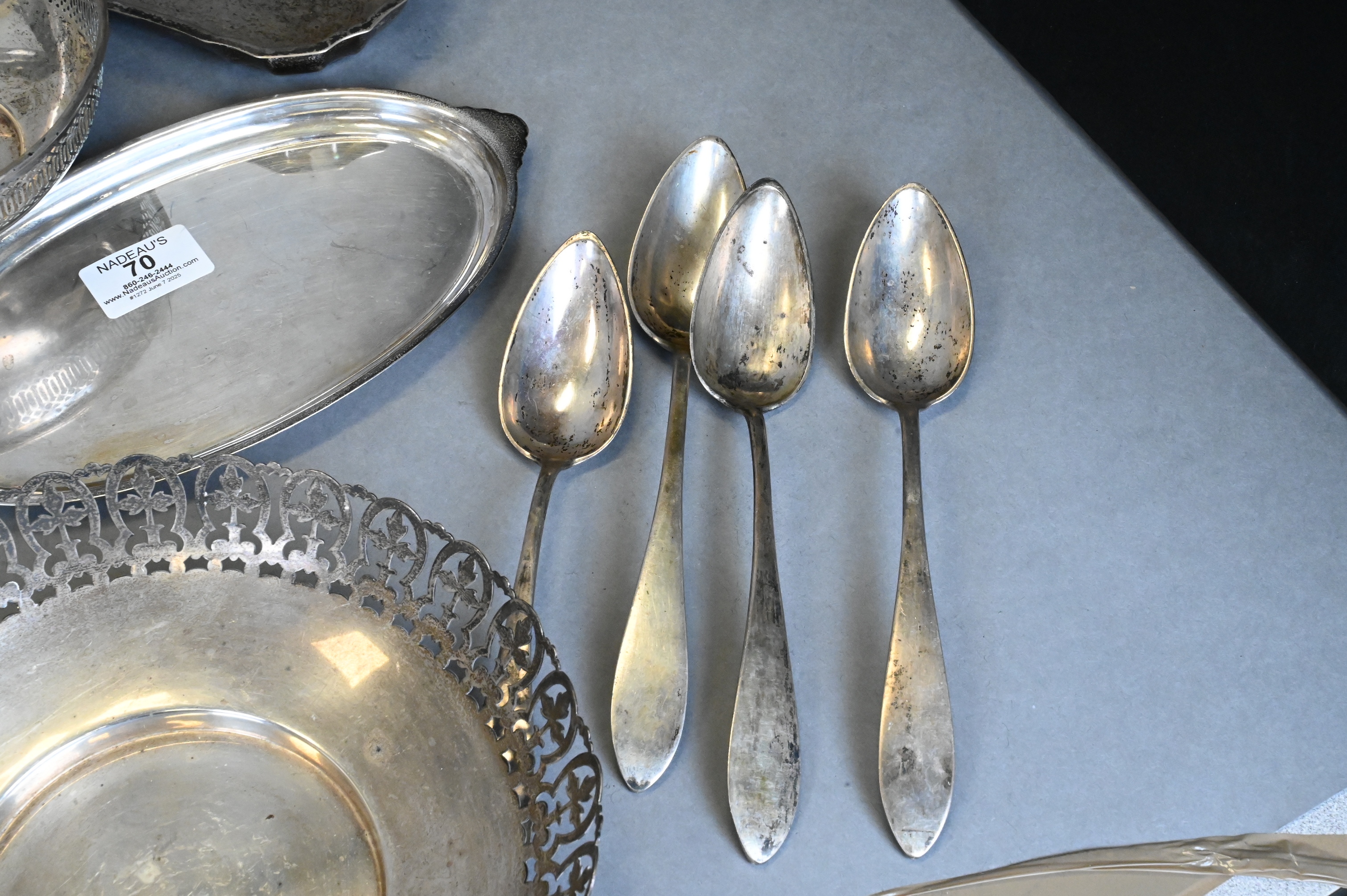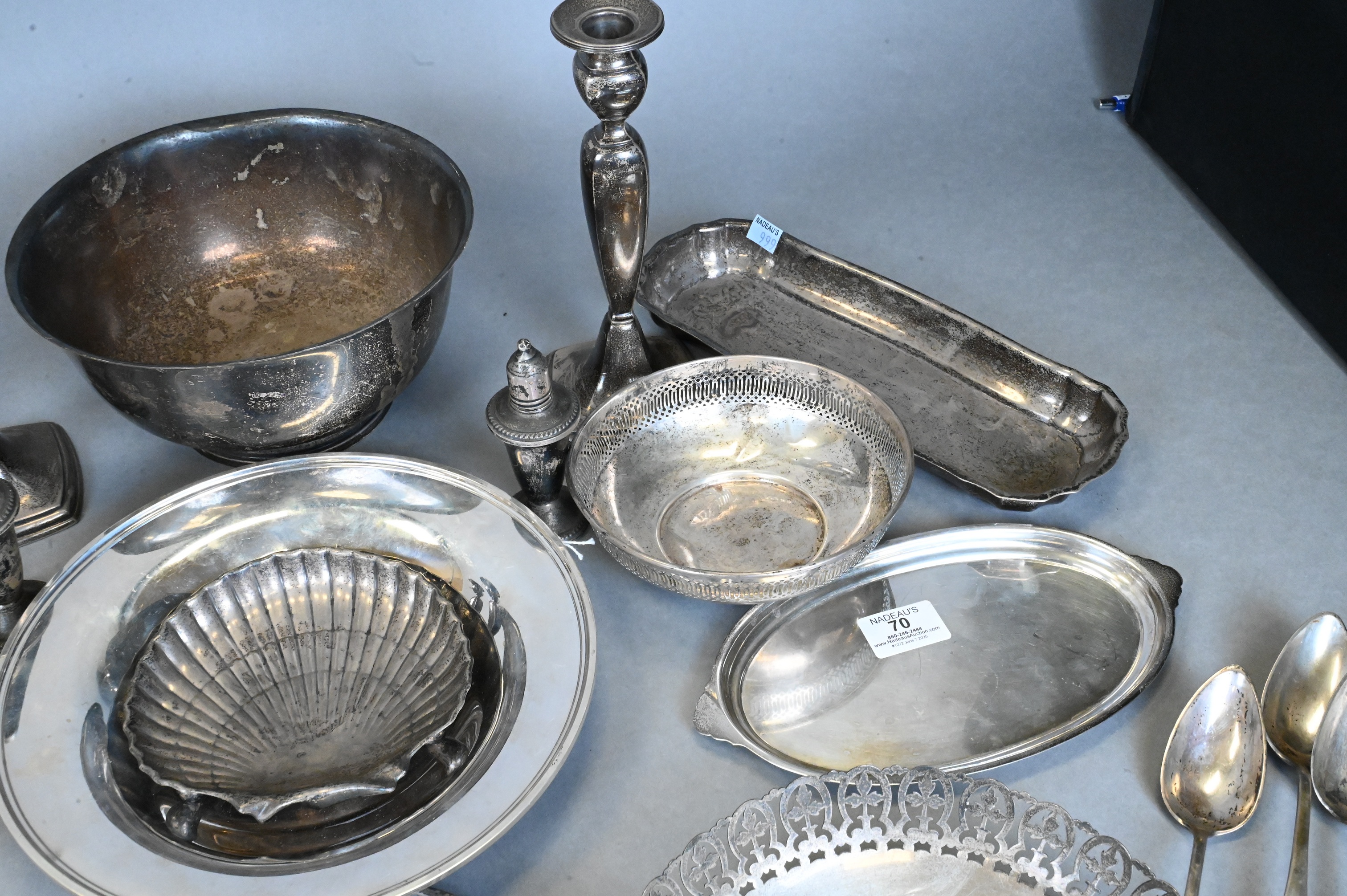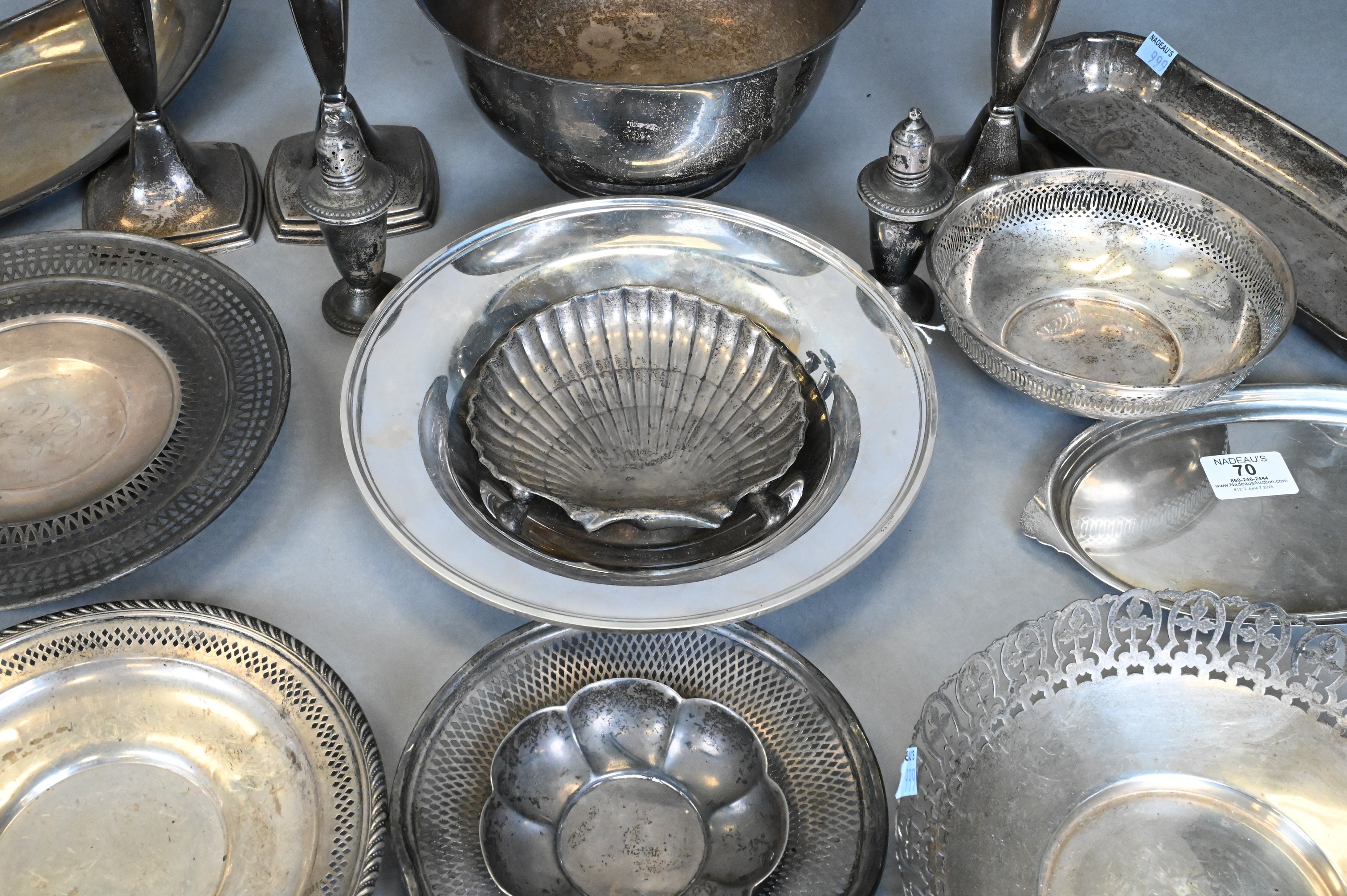 to include three candlesticks and a pair of salt/pepper shakers, along with seven continental silver spoon six of which having Austrian and Hungarian assay marks one marked sterling, two sterling silver trays one oval and hand wrought the other square having scalloped curved ends longest 13 inches, 22.2 t.oz., along with seven sterling silver trays largest diameter 10 inches, sterling silver Paul Revere reproduction bowl height 4 1/2 inches, diameter 9 inches