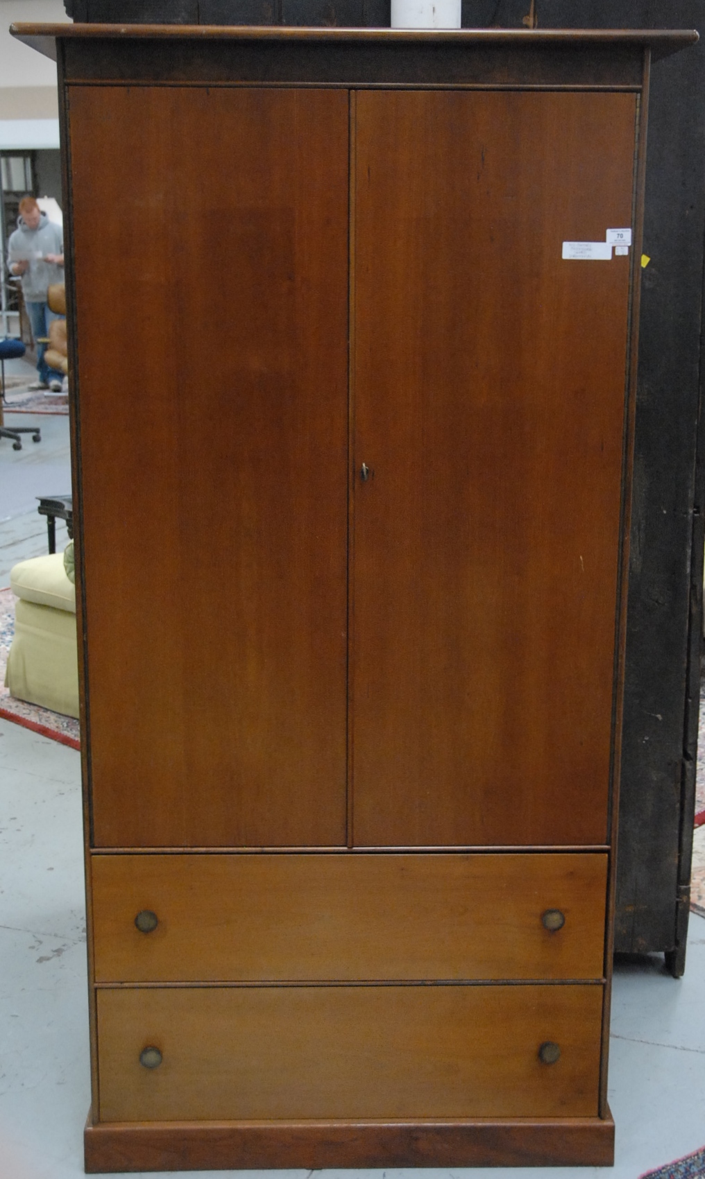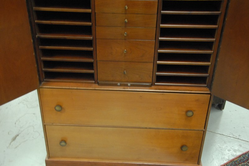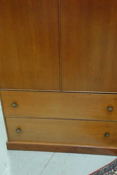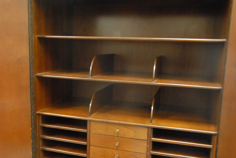 Milo Baughman for Directional ‘Country Villa’ collection Mid-Century chifferobe of cherry and myrtle burl having two large drawers below double doors which conceal a fitted interior of drawers and shelves, marked Directional with metal plaque in drawer, circa 1962, ht. 74in. wd. 40in. dp. 20in.