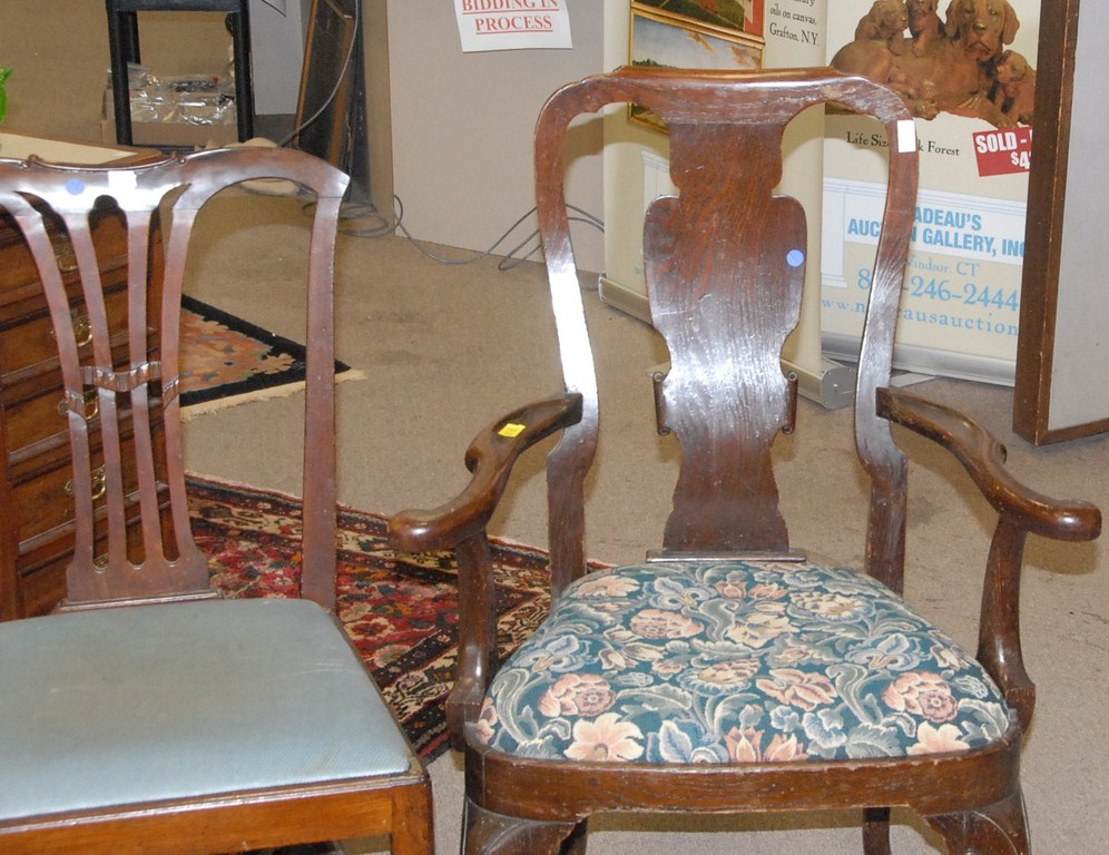 Lot 70: Oak Queen Anne style armchair and George IV style mahogany side chair.