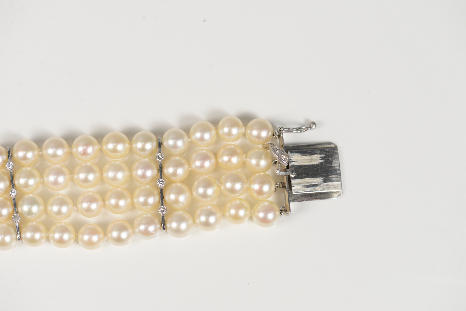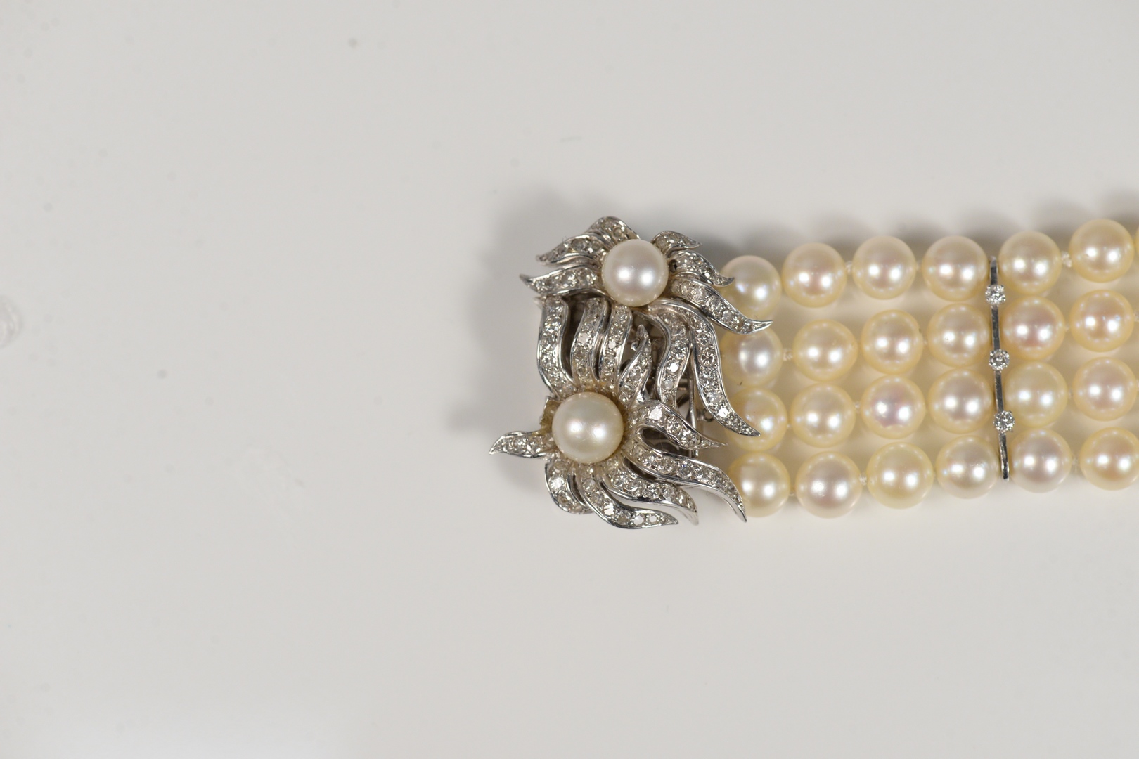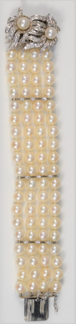 Lot 70: Pearl Four Strand Bracelet having large 14 karat white gold clasp, in floral design, mounted with two pearls, and diamond mounted fl…