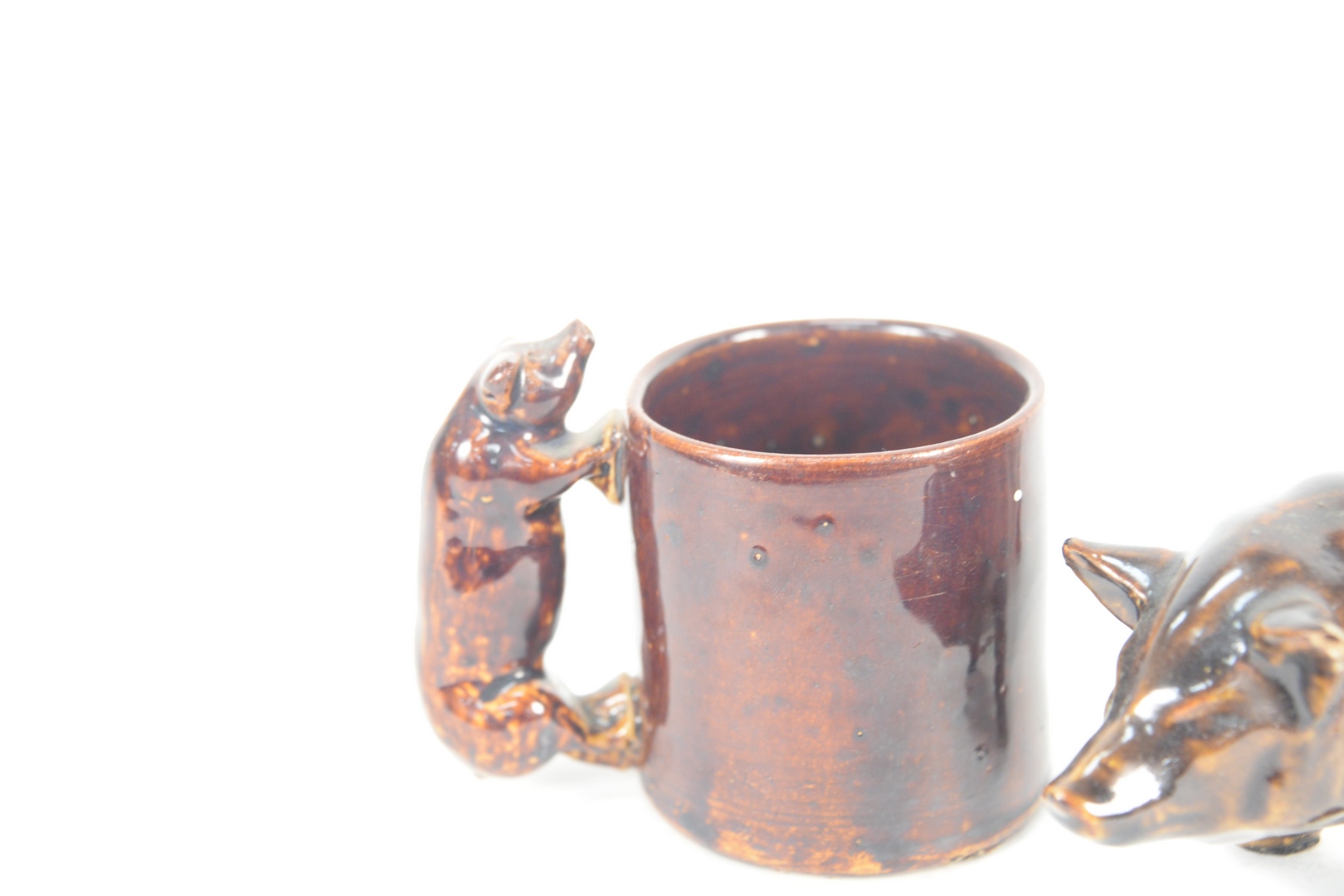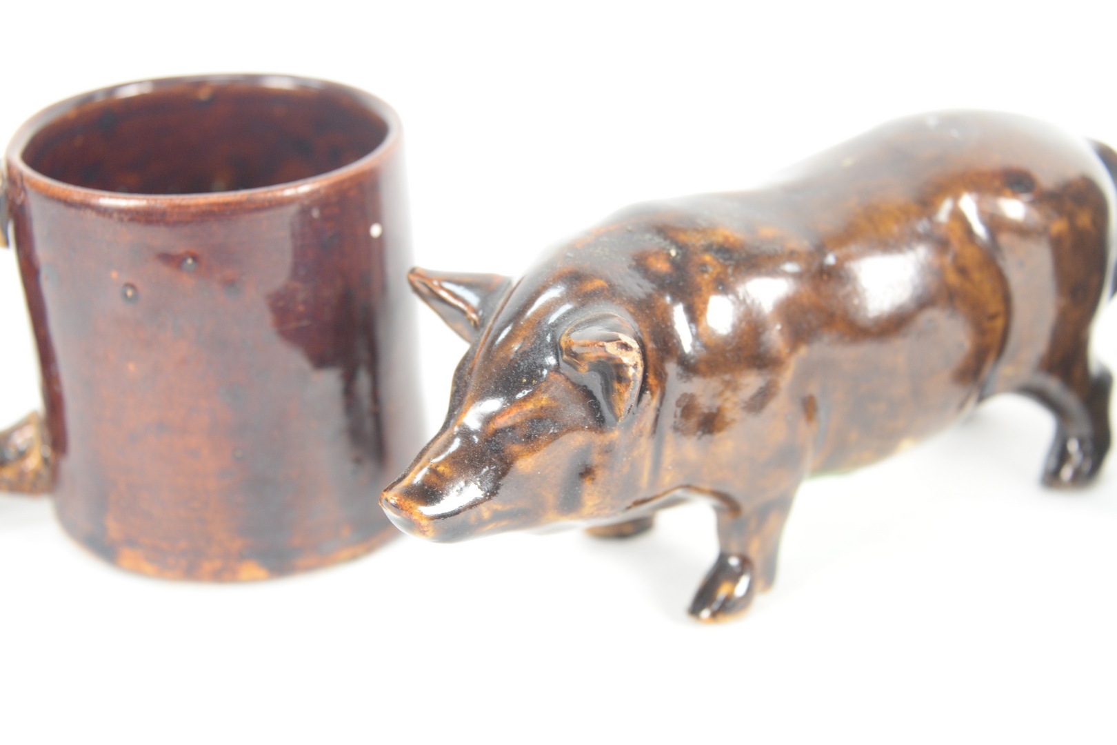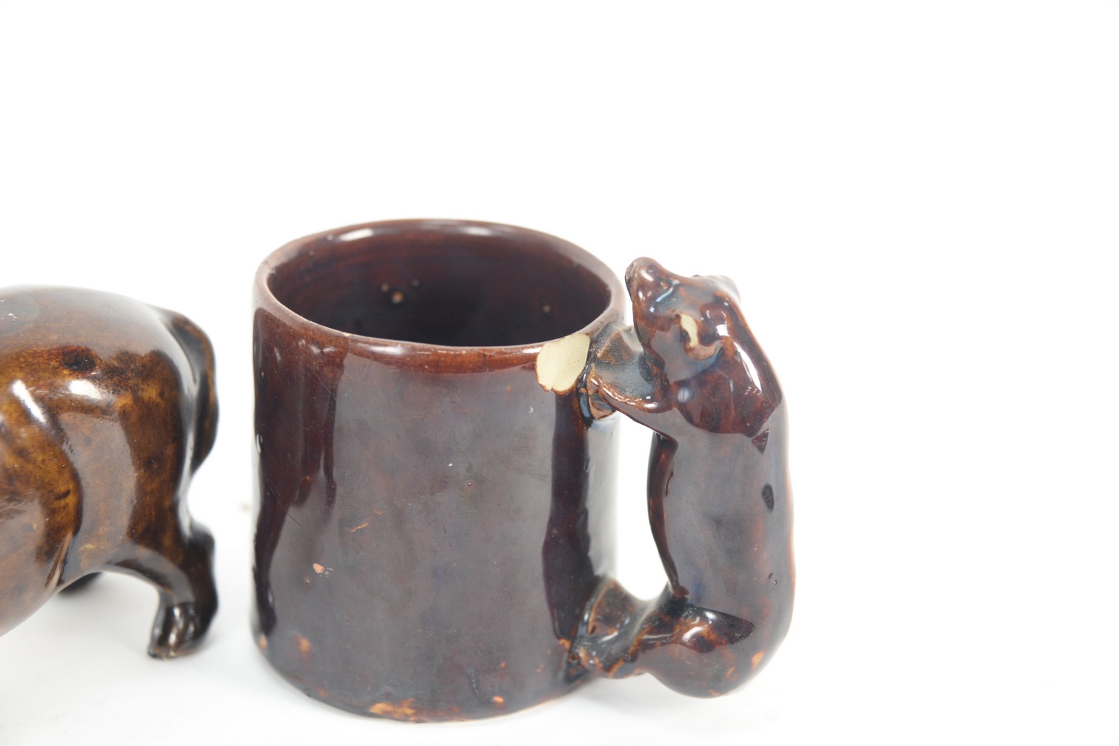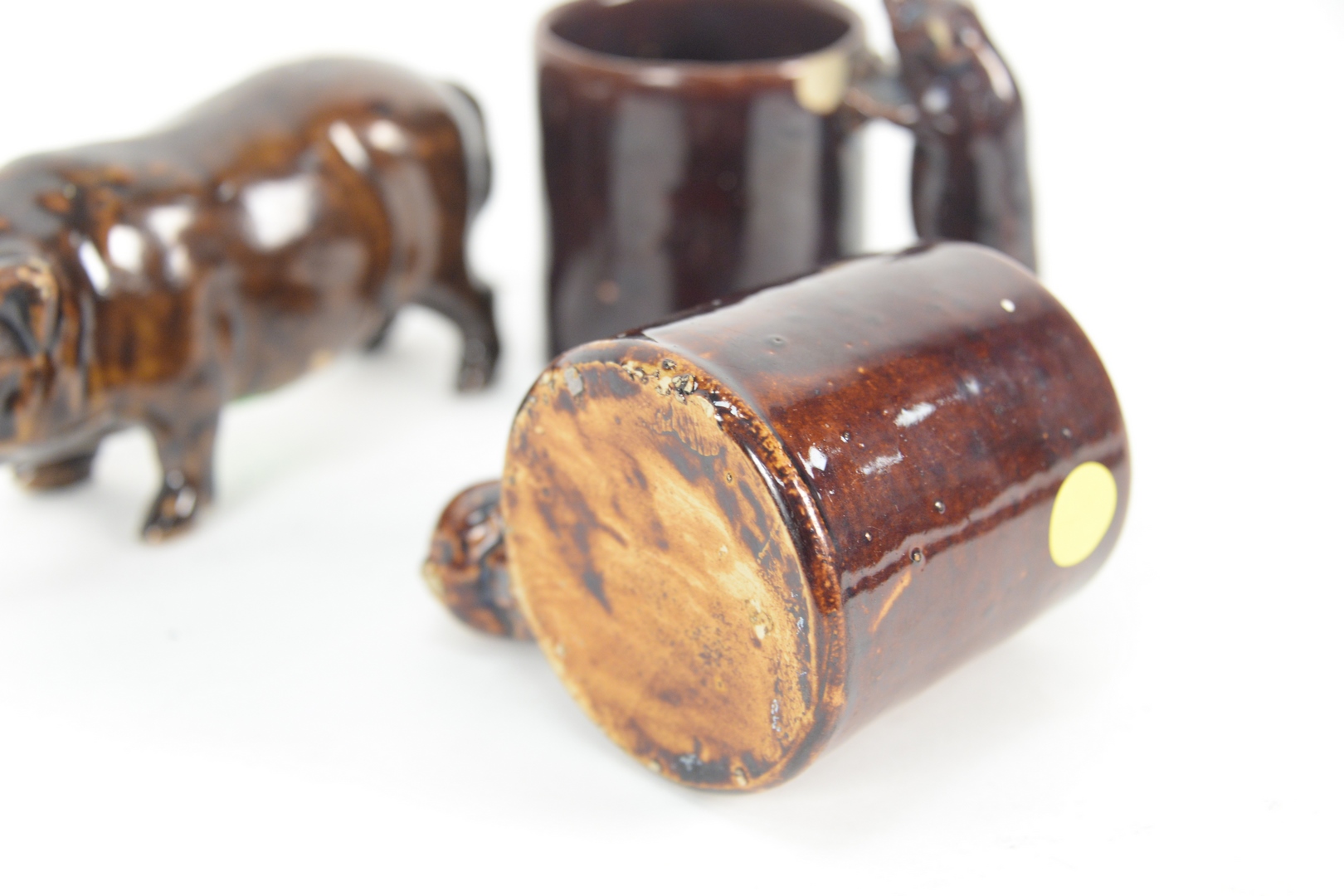 Three Brown Glazed Pottery Pieces, to include standing pig, height 4 inches along with a pair of mugs with pig form handles, height 3 inches. Provenance: 1975 Sotheby Parke Bernet receipt. The Estate of Diana Atwood Johnson.