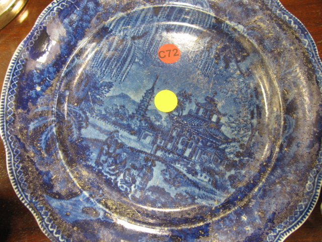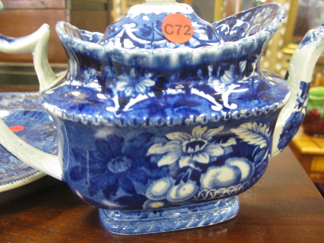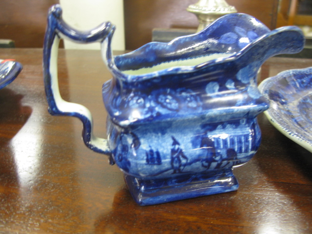 Three piece lot of historic blue Staffordshire to include teapot, spout as is, creamer and plate