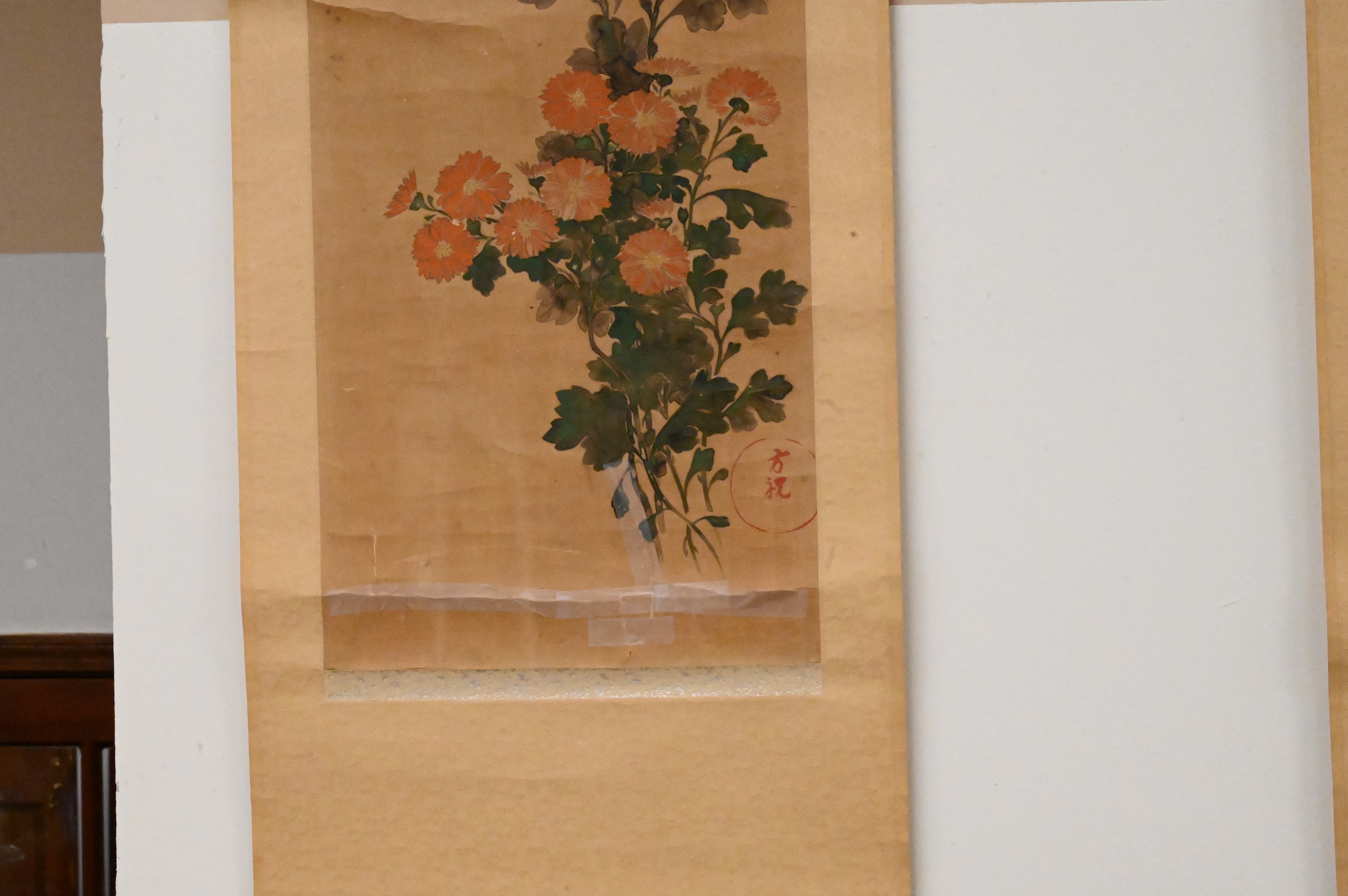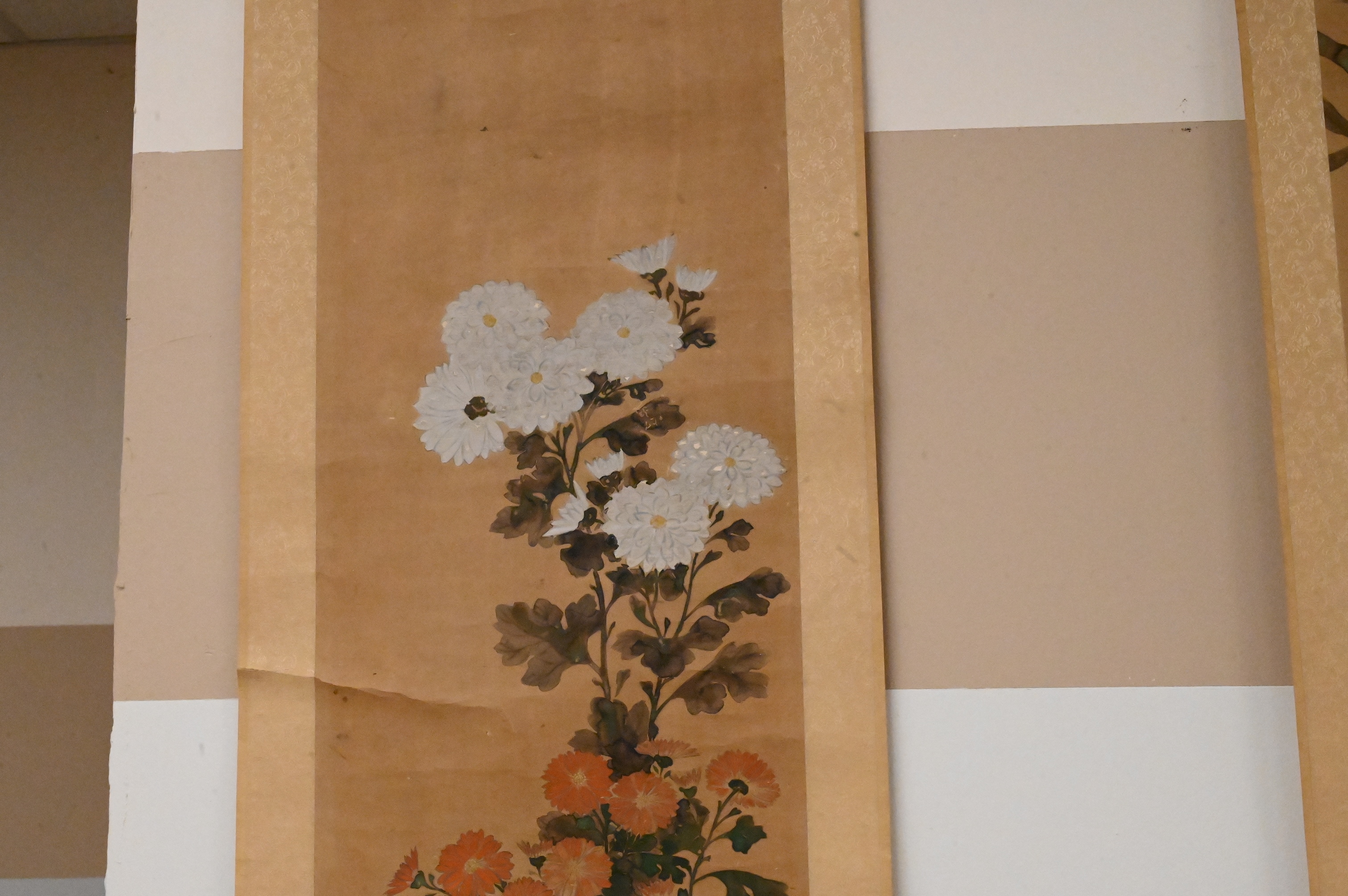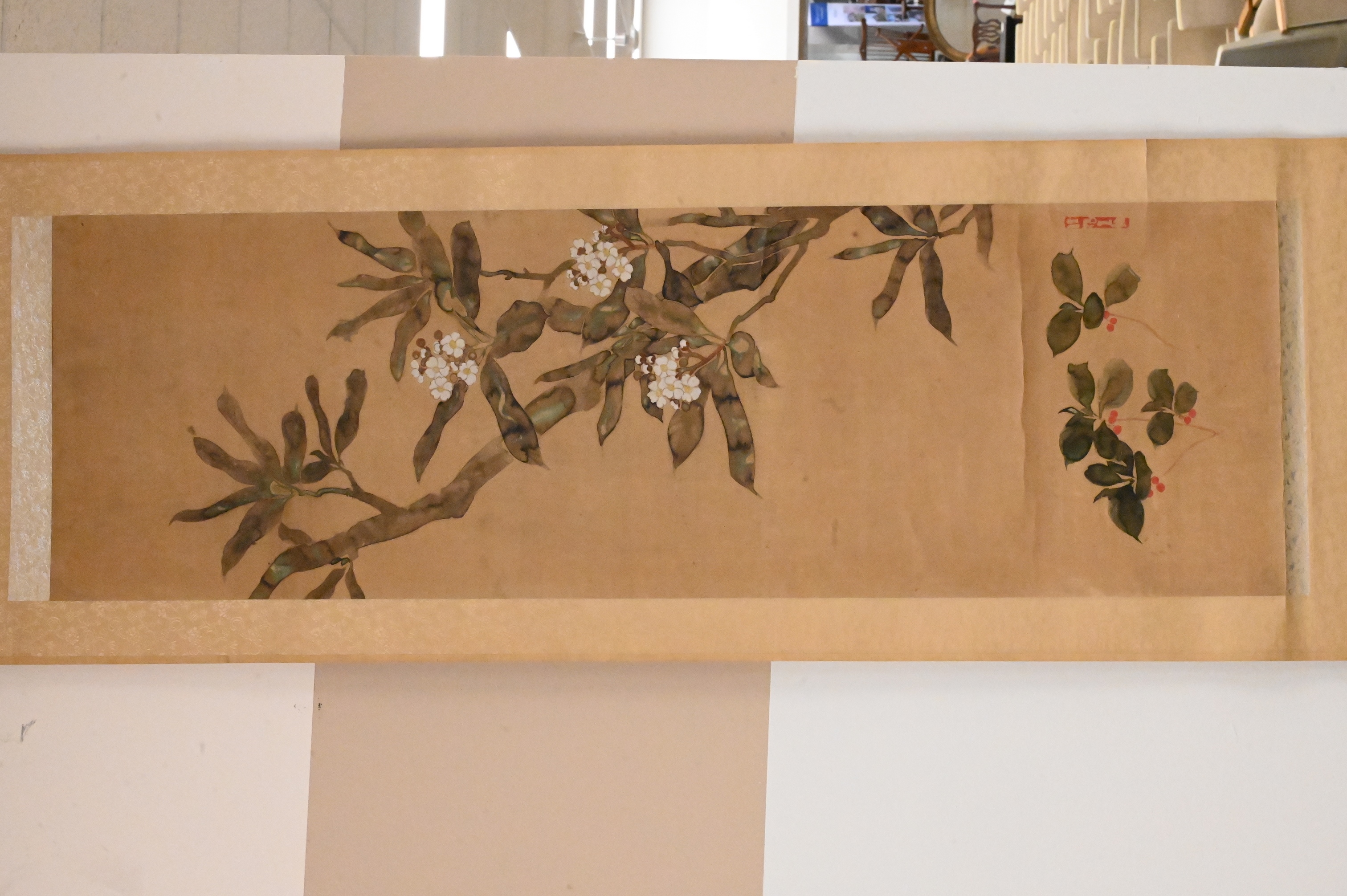 one depicting white and red chrysanthemum flowers, one of white cherry blossoms with red berried, both signed in red character stamp