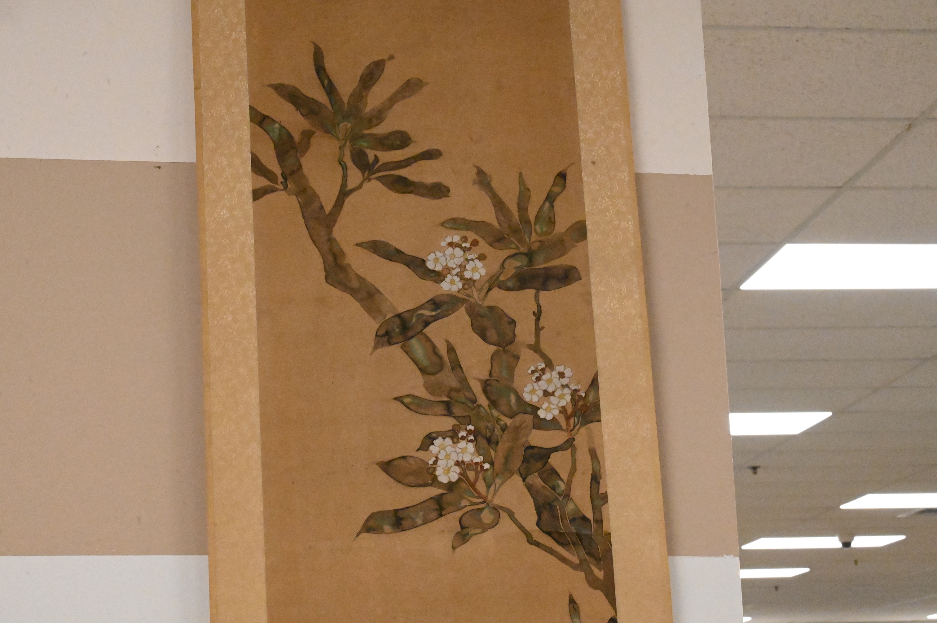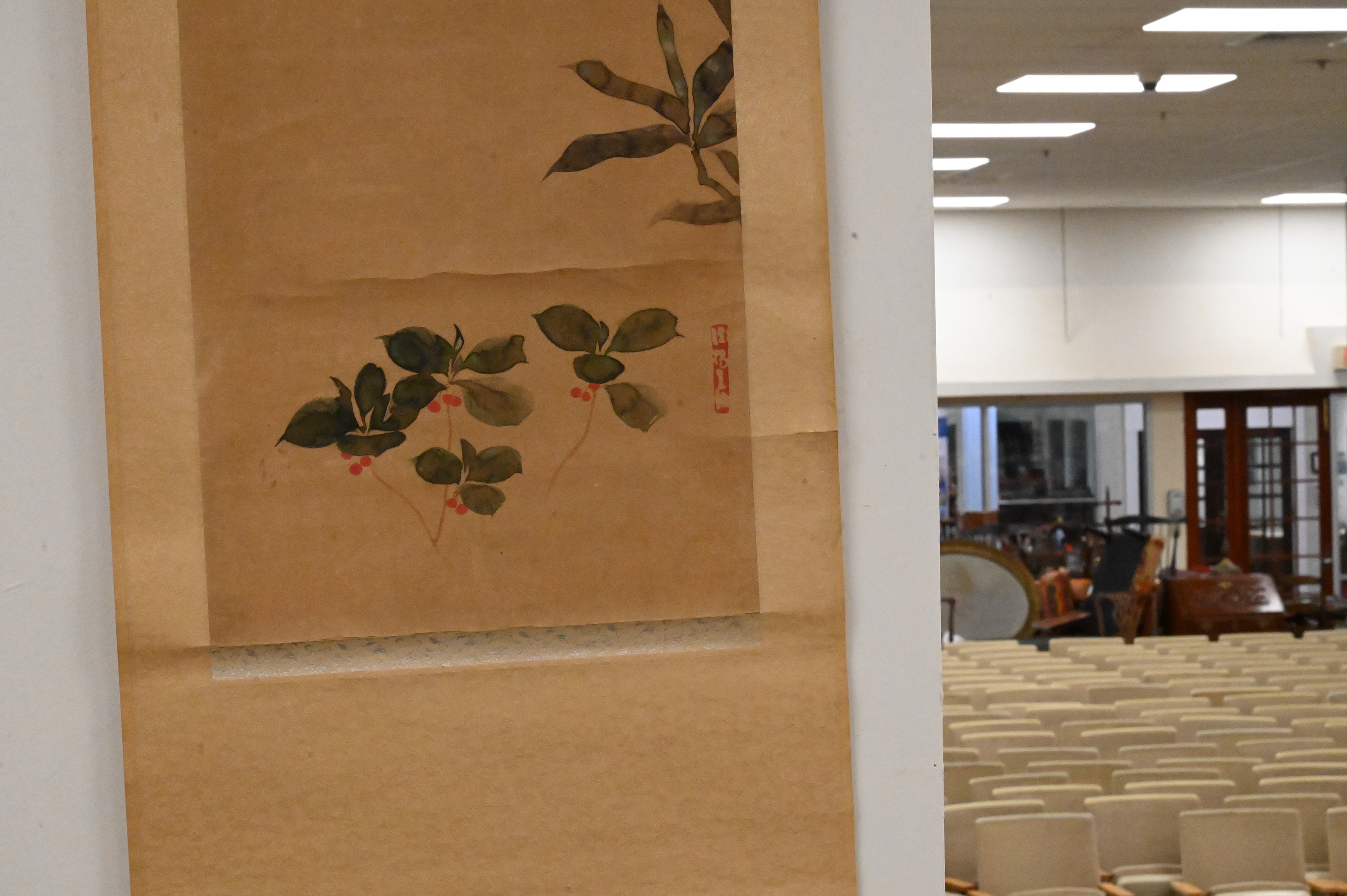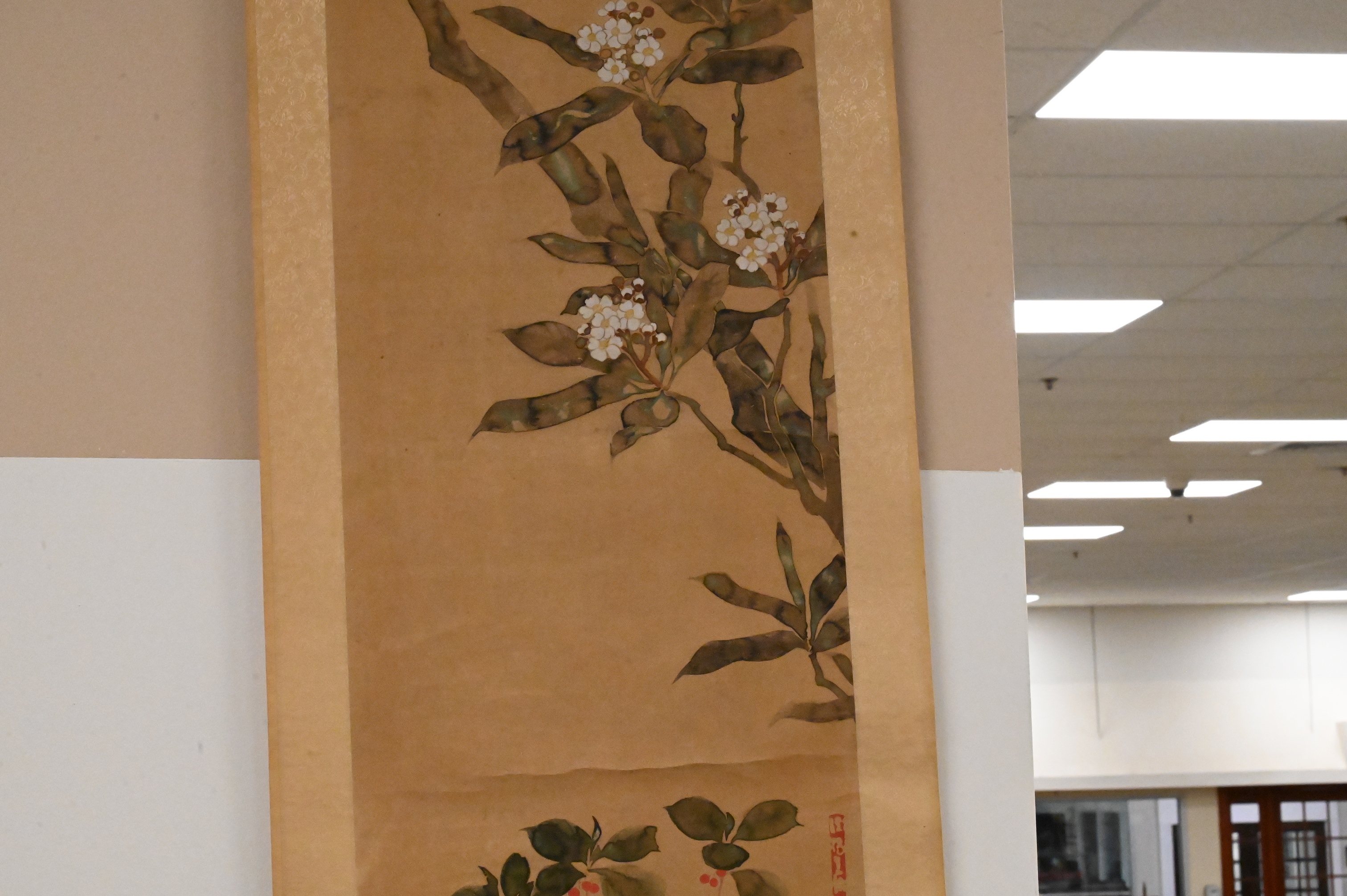 one depicting white and red chrysanthemum flowers, one of white cherry blossoms with red berried, both signed in red character stamp