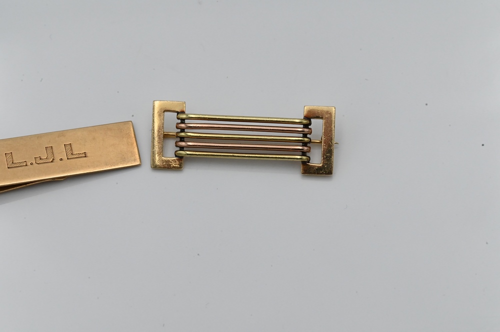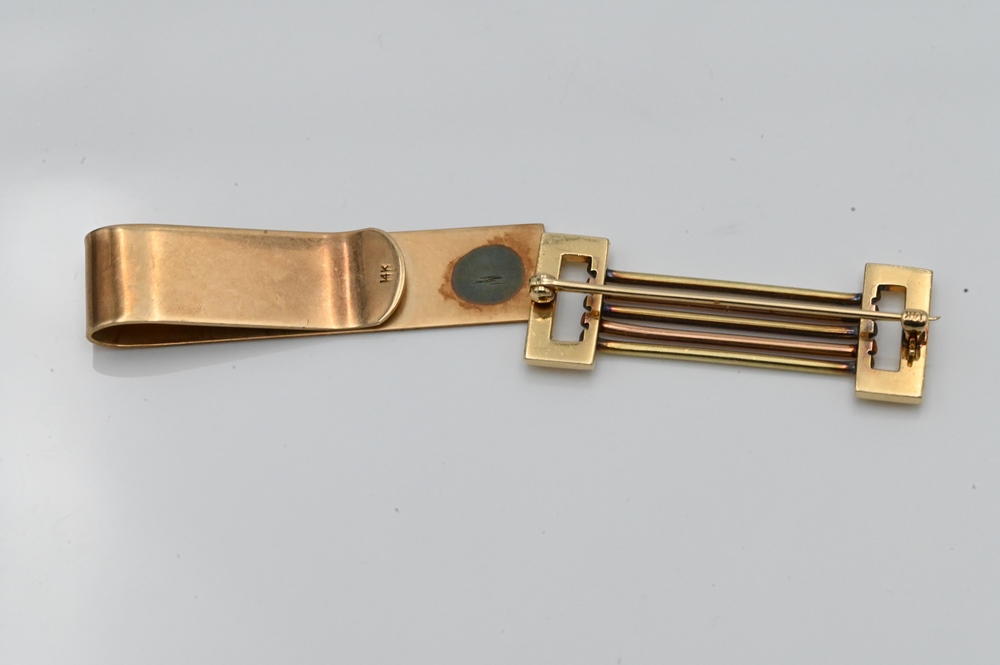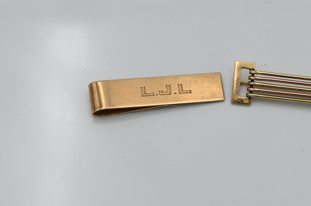 Two-Piece 14 Karat Lot, to include two-color gold brooch, along with a money clip monogrammed ‘LJL’.